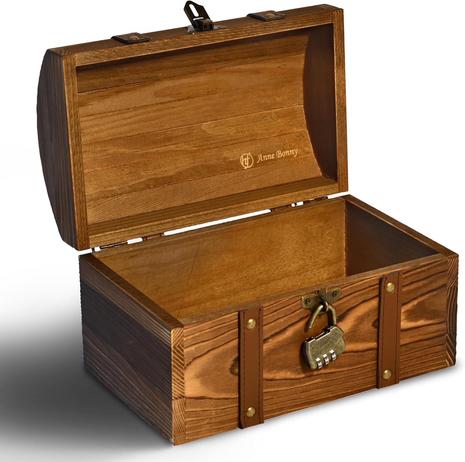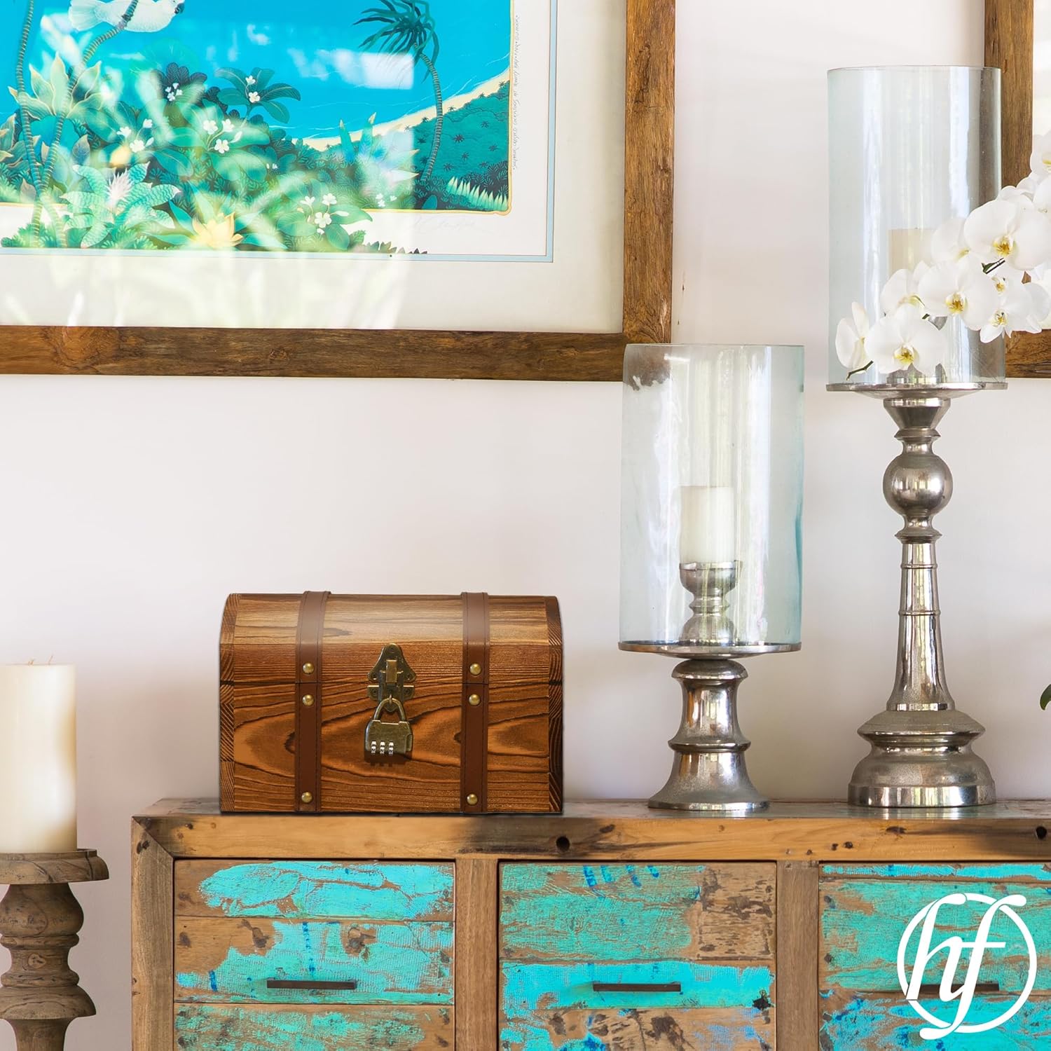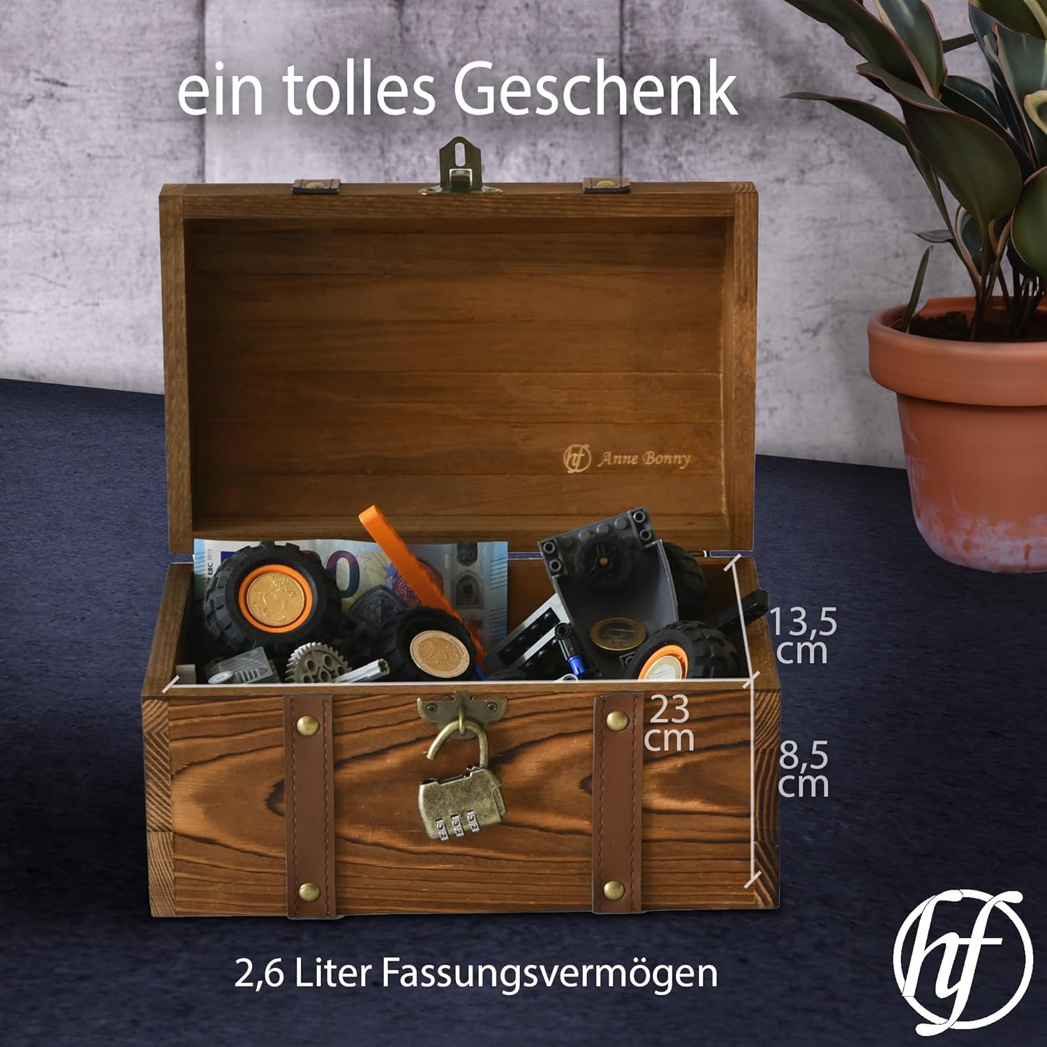 Ročno izdelana skrinjica iz masivnega bora v rustikalnem videzu. Služi kot čudovit dekorativen element ali praktična škatla za shranjevanje. Vključuje ključavnico s kombinacijo za dodatno varnost.