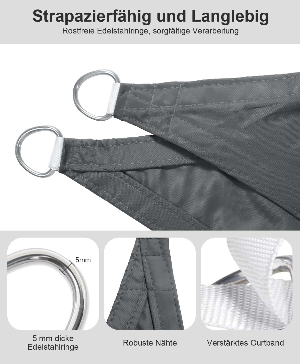 Senčno jadro v elegantni antracitni barvi nudi zanesljivo zaščito pred soncem, vetrom in rahlim dežjem. Izdelano je iz trpežnega poliestra s PU prevleko, ki zagotavlja dolgo življenjsko dobo, odpornost proti vlagi in do 95 % UV zaščito (UPF 50+). Idealno za uporabo na vrtu, terasi, balkonu ali nad otroškim igriščem.