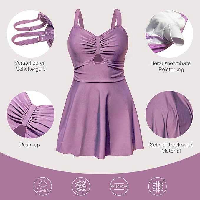 Ta elegantni enodelni kopalni model združuje funkcionalnost, udobje in modni videz. Visoka elastičnost, mehka in zračna tkanina ter vgrajene blazinice omogočajo samozavesten in prijeten občutek v vodi ali na plaži. Obleka-kopalke je zasnovana tako, da poudari žensko postavo, obenem pa nudi večjo pokritost in udobje.