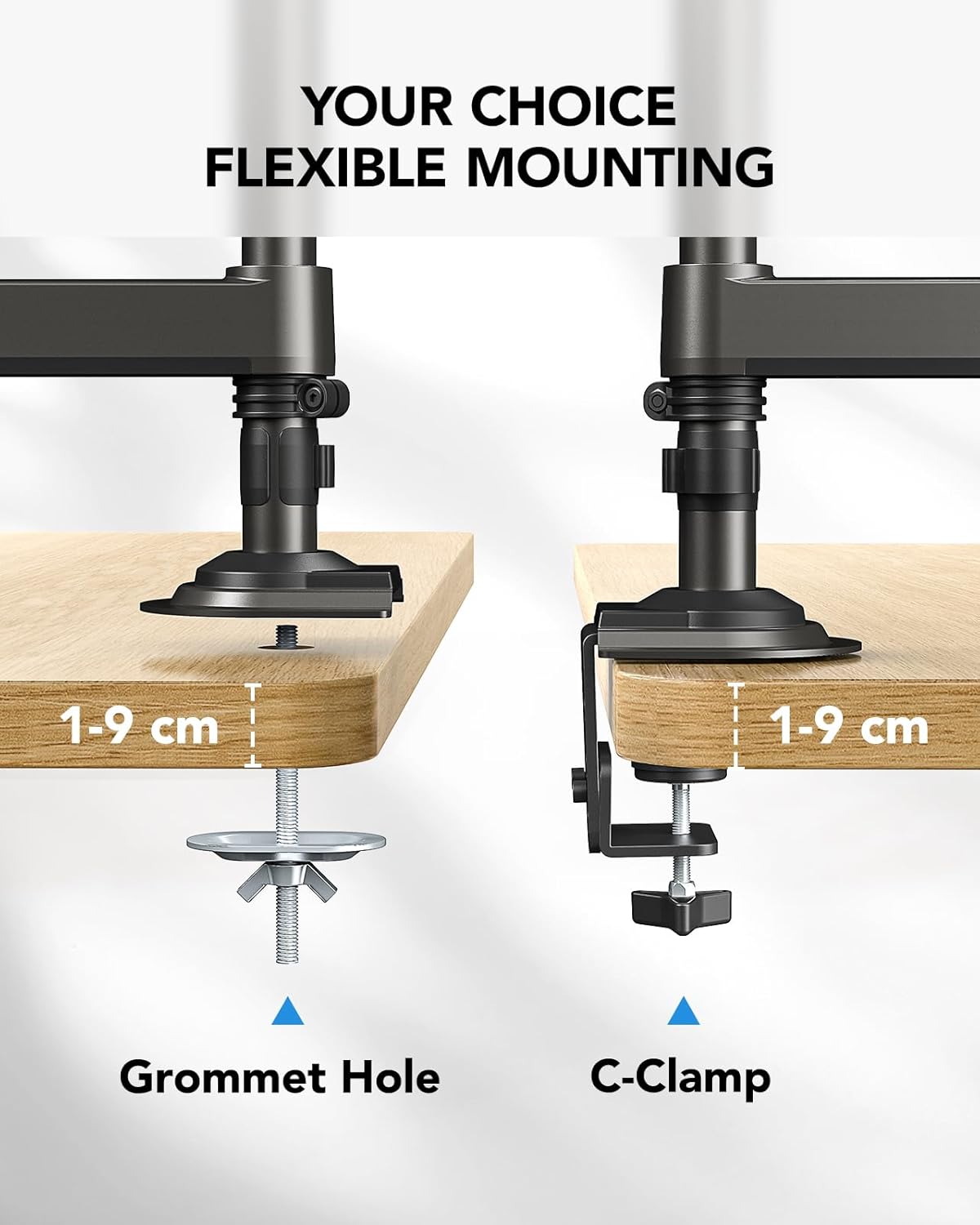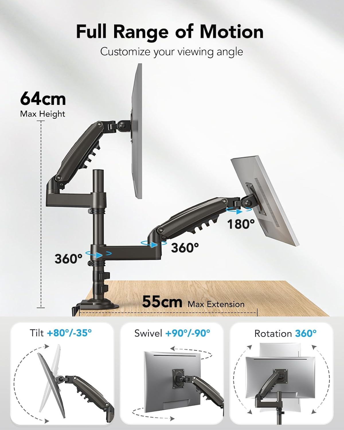 Stabilen in prilagodljiv nosilec omogoča pritrditev dveh monitorjev velikosti od 13 do 32 palcev. Z vplinjeno roko in 360-stopinjsko rotacijo je zaslon vedno v optimalnem položaju. Idealna rešitev za večopravilno delo doma ali v pisarni.
