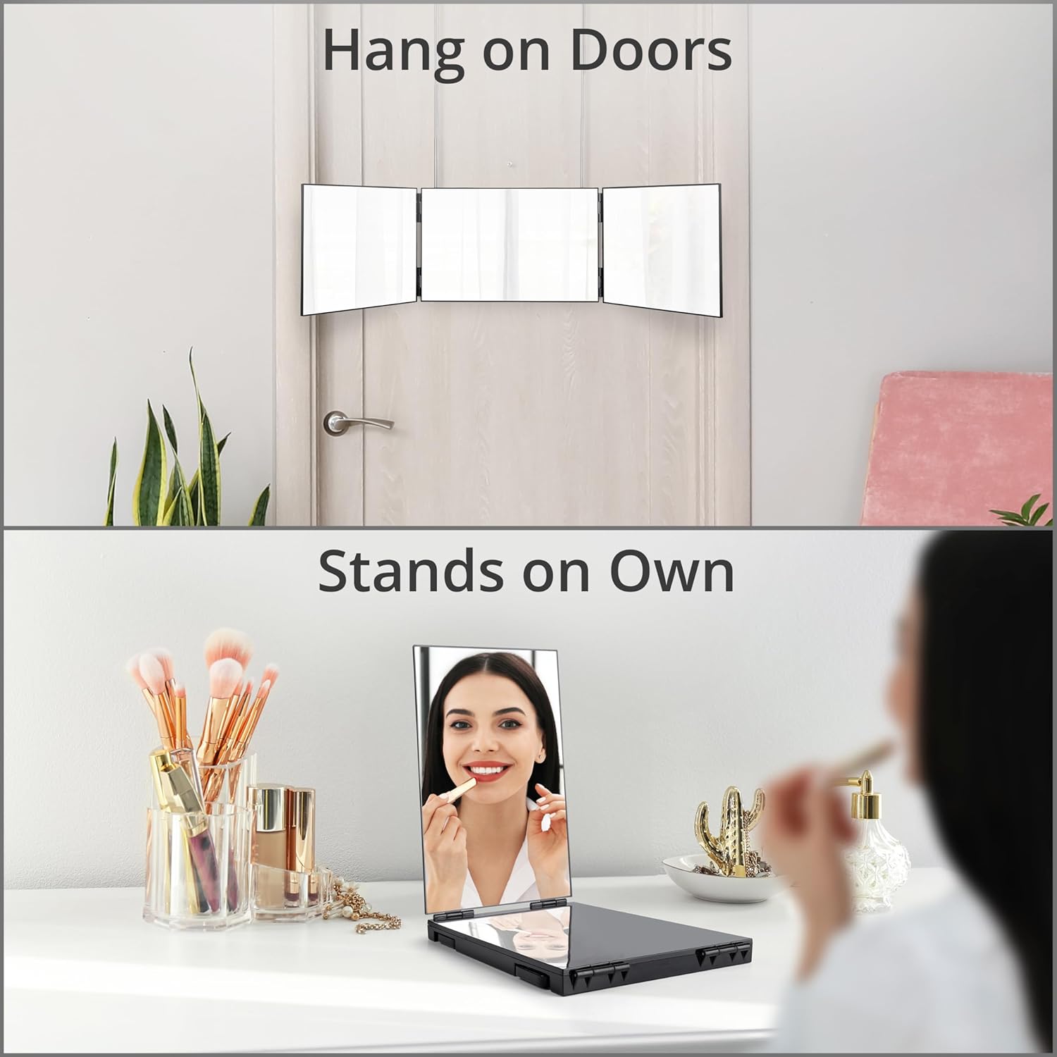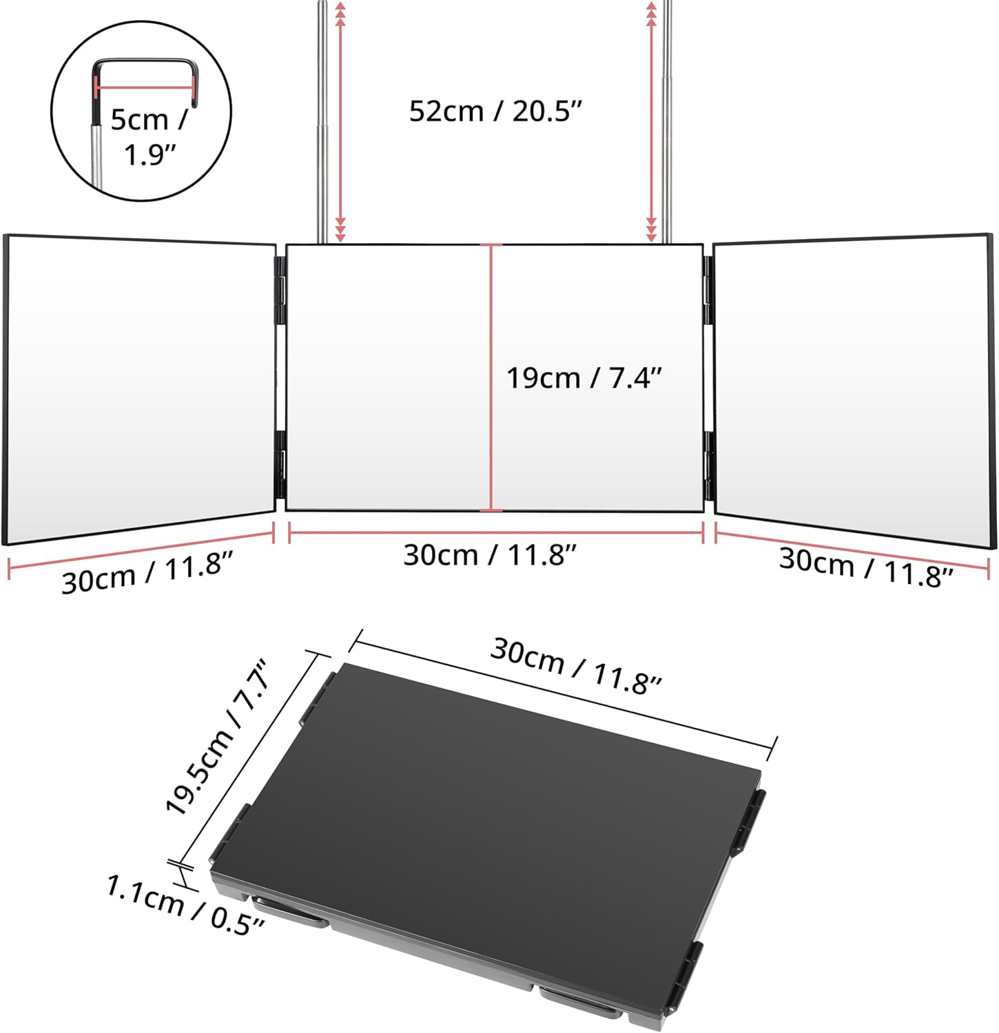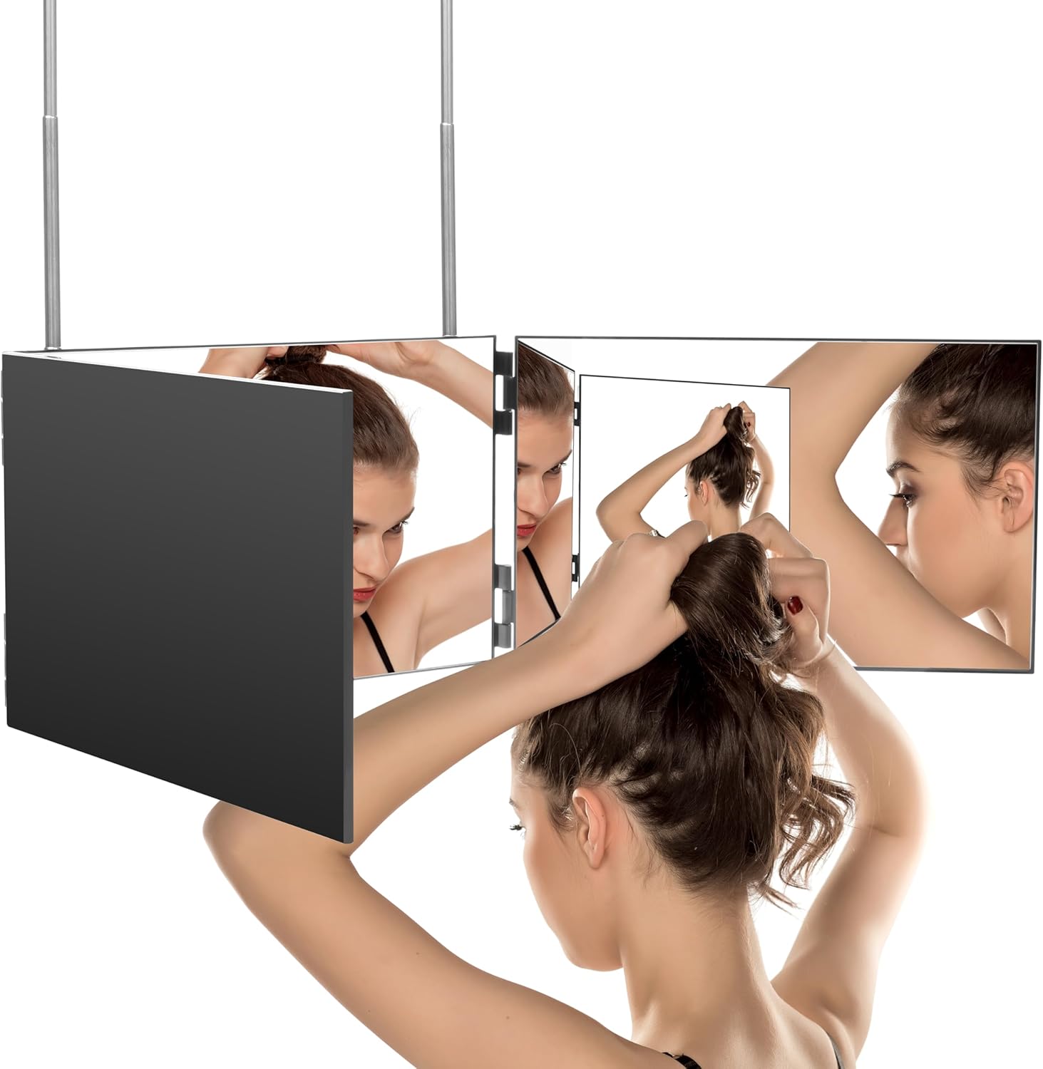 Tridelno zrcalo omogoča popoln pregled nad striženjem in urejanjem las brez napornega obračanja. Z jasnim pogledom iz vseh kotov bo vsaka pričeska natančna in brezhibna. Kompaktna zasnova z nastavljivimi kavlji omogoča uporabo doma ali na poti.