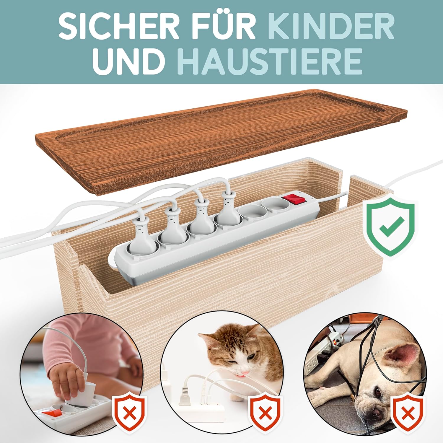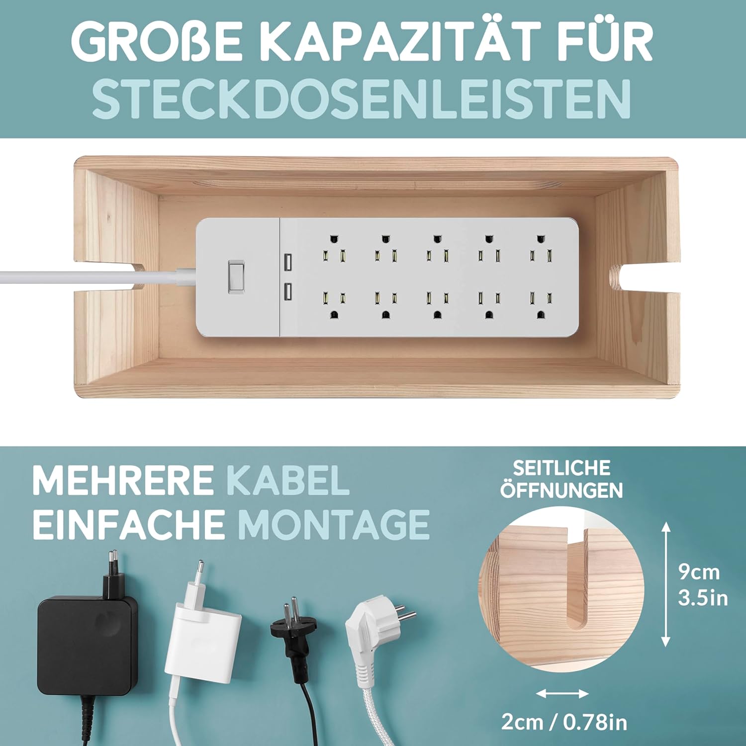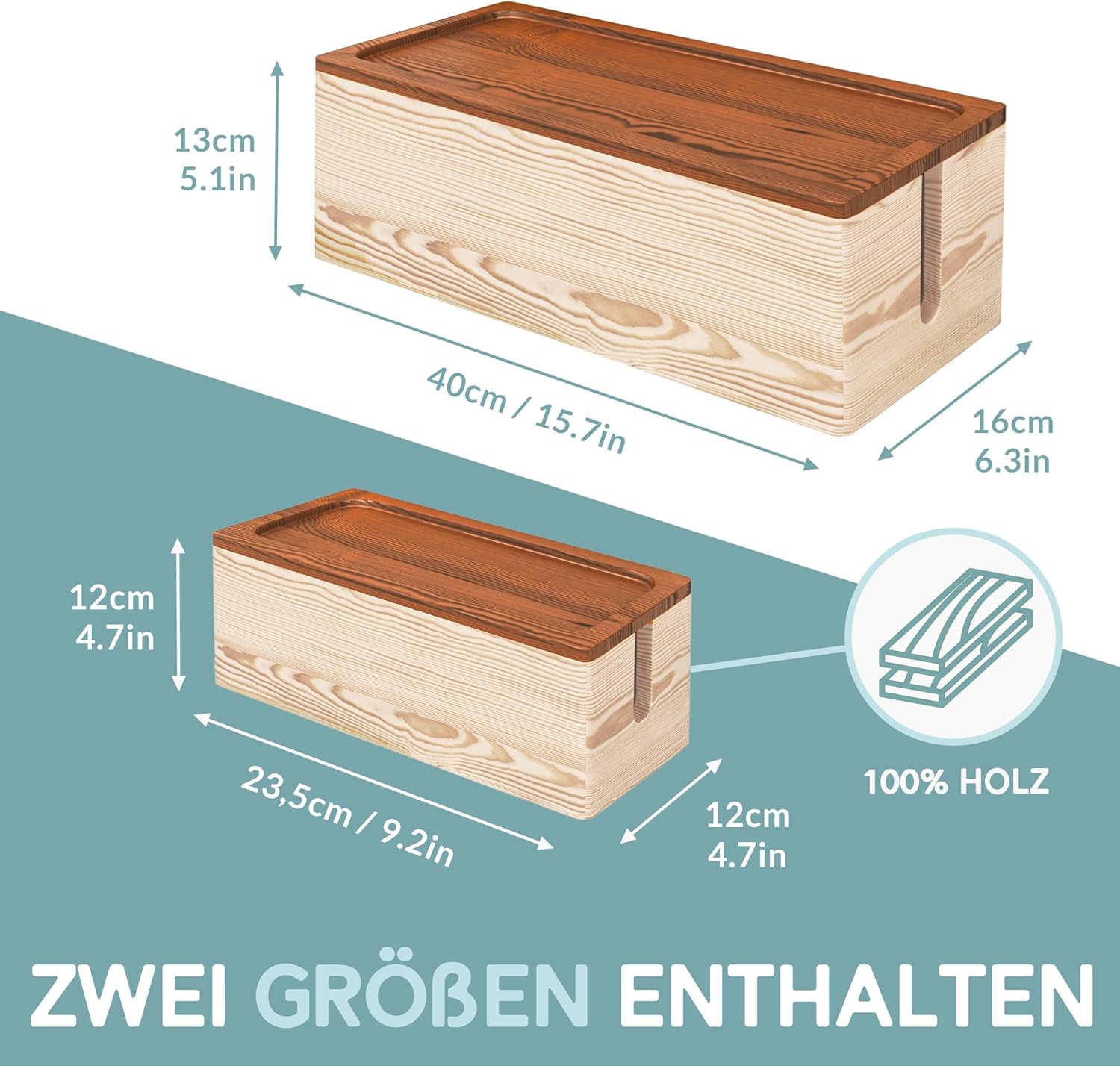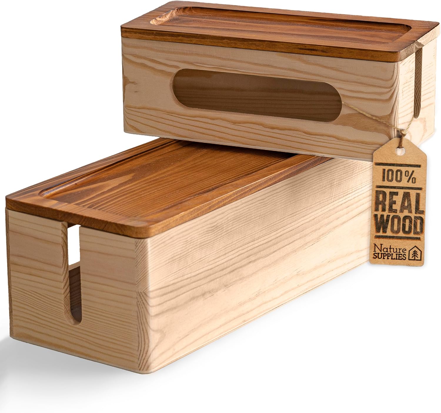 Komplet dveh elegantnih škatel za organizacijo kablov združuje naraven videz lesa in praktično funkcionalnost. Izdelani iz kakovostnega borovega lesa z orehovim pokrovom, ti škatli pomagata učinkovito skriti in urediti električne kable, polnilce ter napajalnike – za večjo urejenost in varnost doma ali v pisarni.