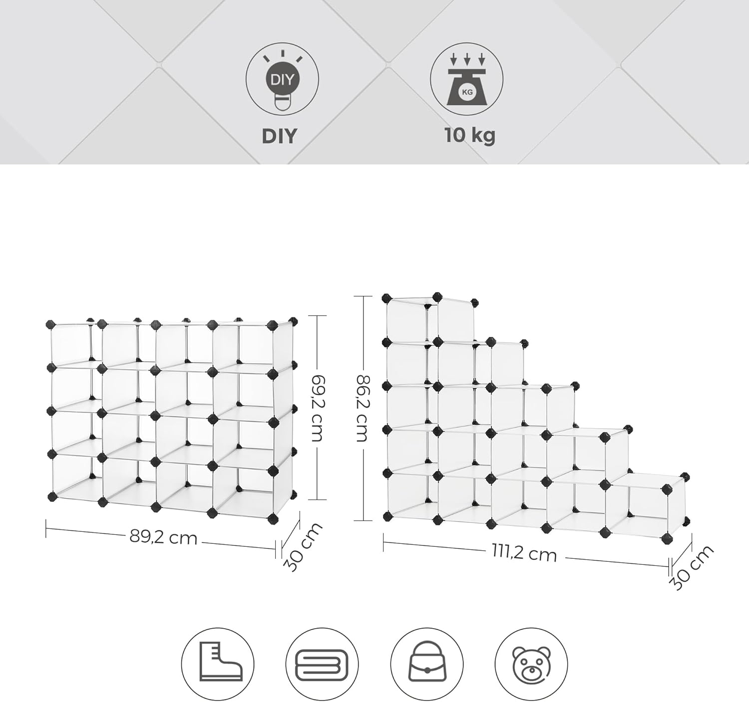Praktični regal s 15 predelki ponuja vsestransko rešitev za shranjevanje obutve, oblačil ali igrač. Vzdržljiva konstrukcija iz PP plastike, kovine in ABS spojev omogoča stabilno uporabo doma ali v pisarni. Regal je enostaven za sestavo in prilagajanje glede na prostor.