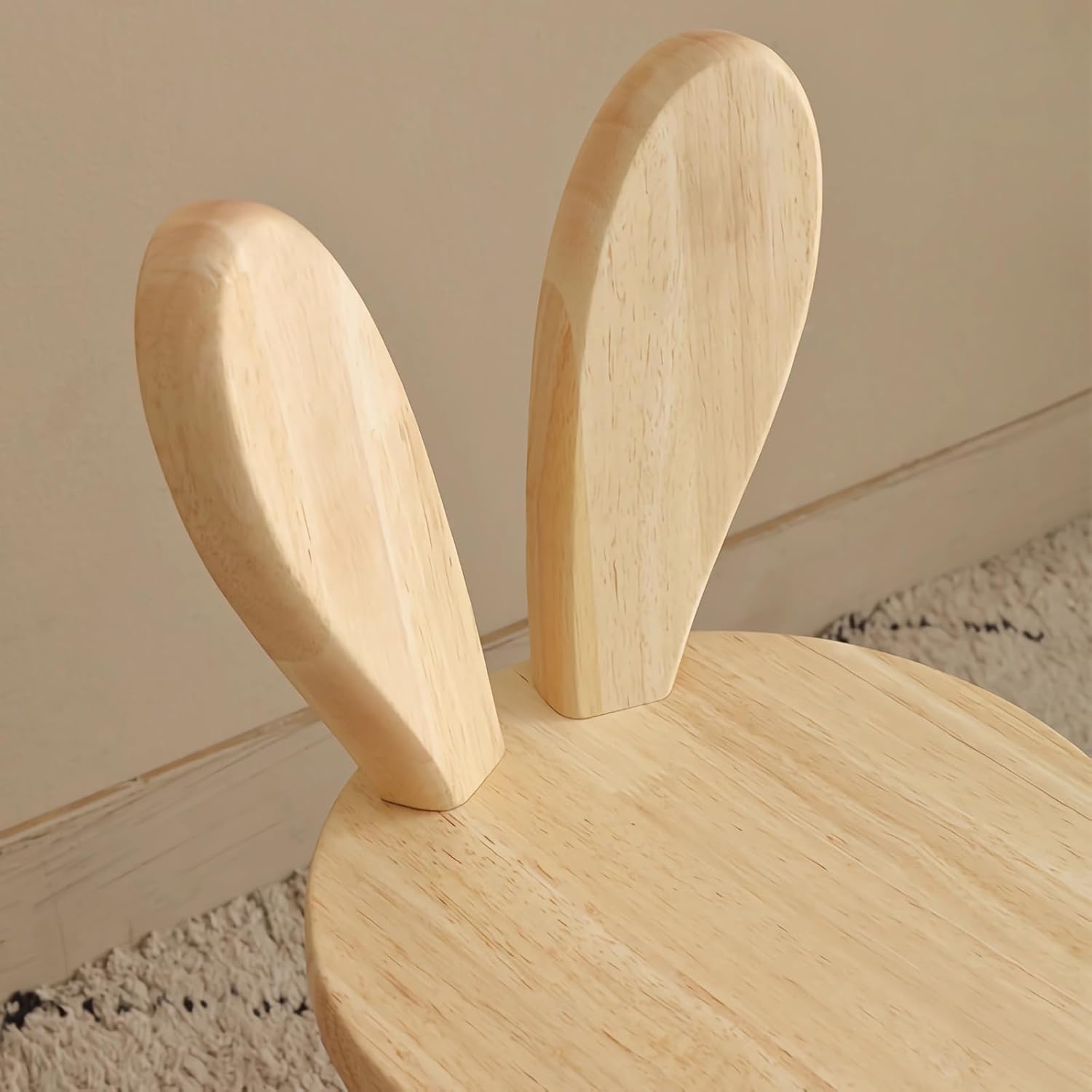 Izdelek je izdelan iz kakovostnega trdnega bukovega lesa, ki zagotavlja trpežnost in varnost. Naslon v obliki zajčjih ušes spodbuja otroško domišljijo in ustvarjalnost. Stol je opremljen s protizdrsnimi nalepkami, ki zagotavljajo stabilnost in preprečujejo zdrs.