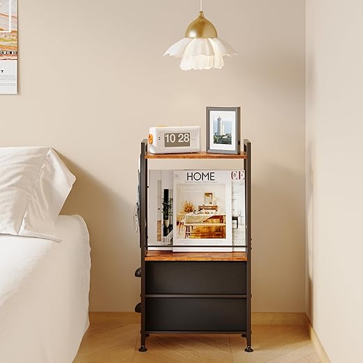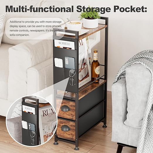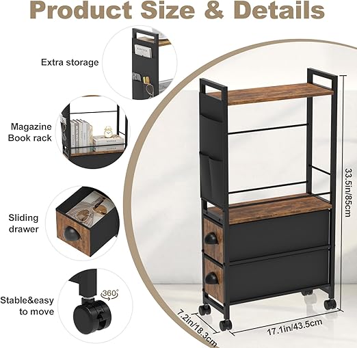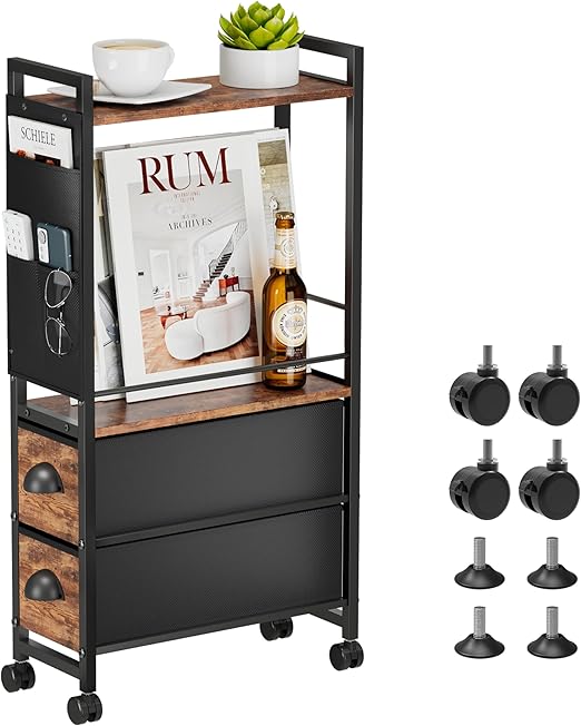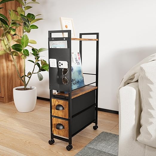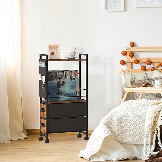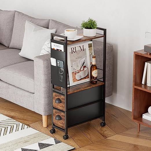 Ozek in večnamenski stranski regal s predali je idealen za postavitev ob kavč ali posteljo. Dva predala, stranska torba in kolesa omogočajo priročno shranjevanje in enostavno premikanje. Kompakten dizajn in funkcionalna zasnova sta odlična za manjše prostore.
