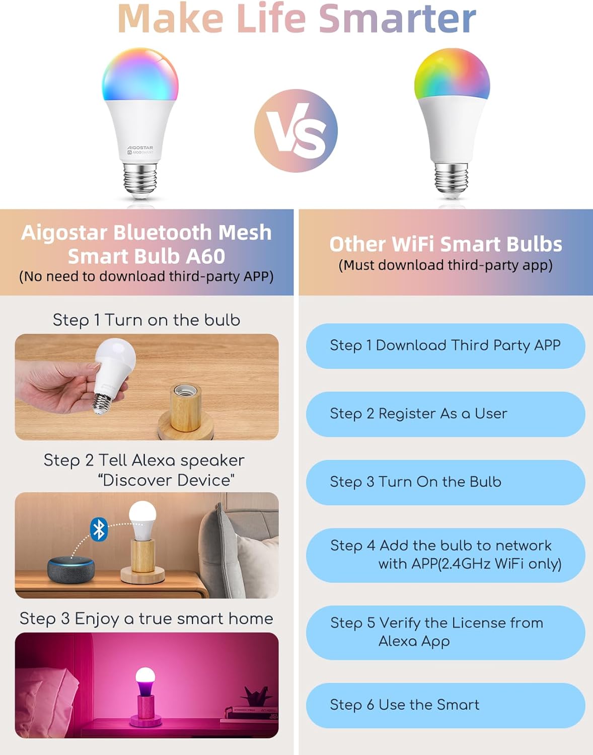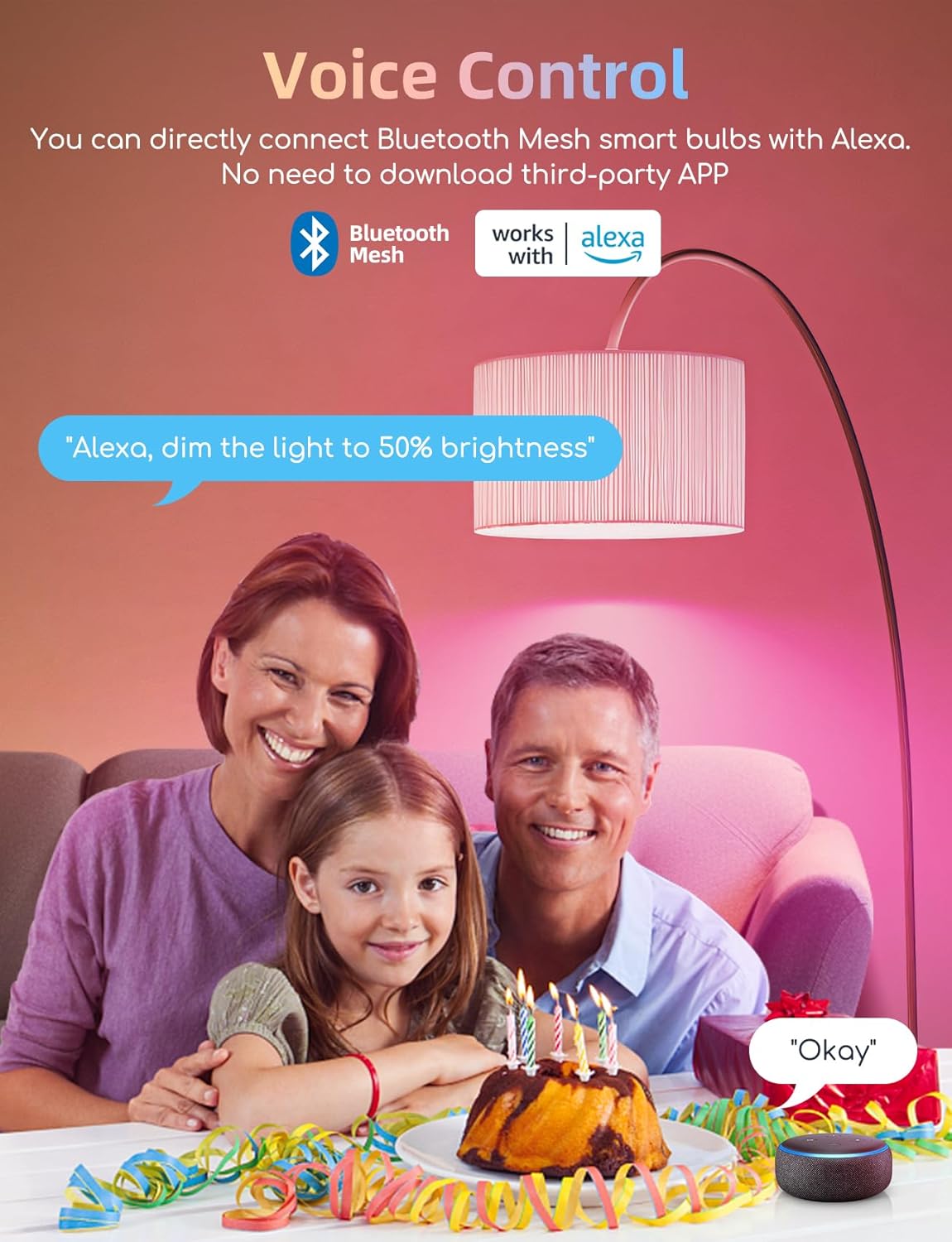 Pametna žarnica z Bluetooth Mesh tehnologijo omogoča hitro povezavo brez dodatnega prehoda ali aplikacij. Z njo lahko upravljate preko Alexa Echo naprave ali daljinskega upravljalnika, brez ročnega poseganja. Podpira 16 milijonov barv in nastavljivo barvno temperaturo od 2700 K do 6500 K.
