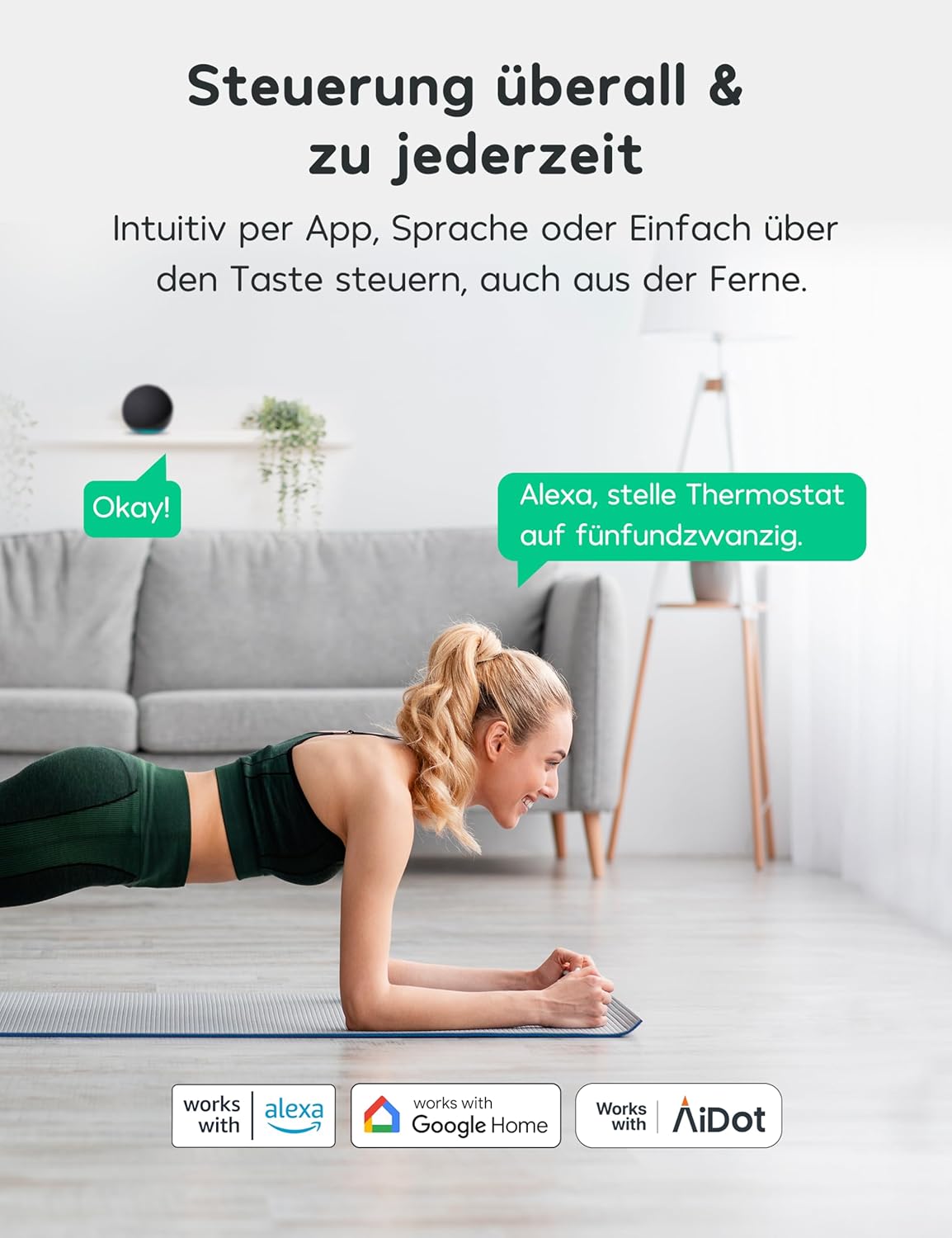 Pametni termostat omogoča natančen nadzor temperature v vsakem prostoru preko aplikacije AiDot. Z uporabo SubG huba omogoča daljinsko upravljanje in povezavo z glasovnimi asistenti, kot sta Alexa in Google Assistant. Namestitev je hitra in preprosta, brez posega v ogrevalni sistem.