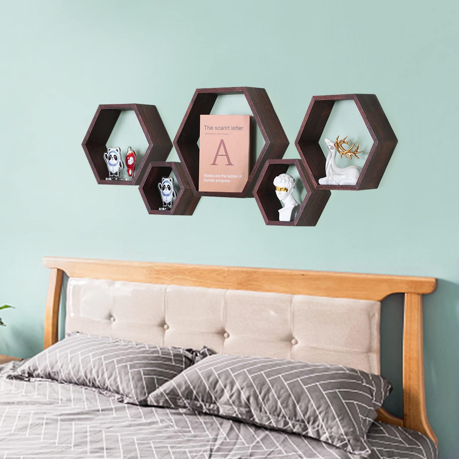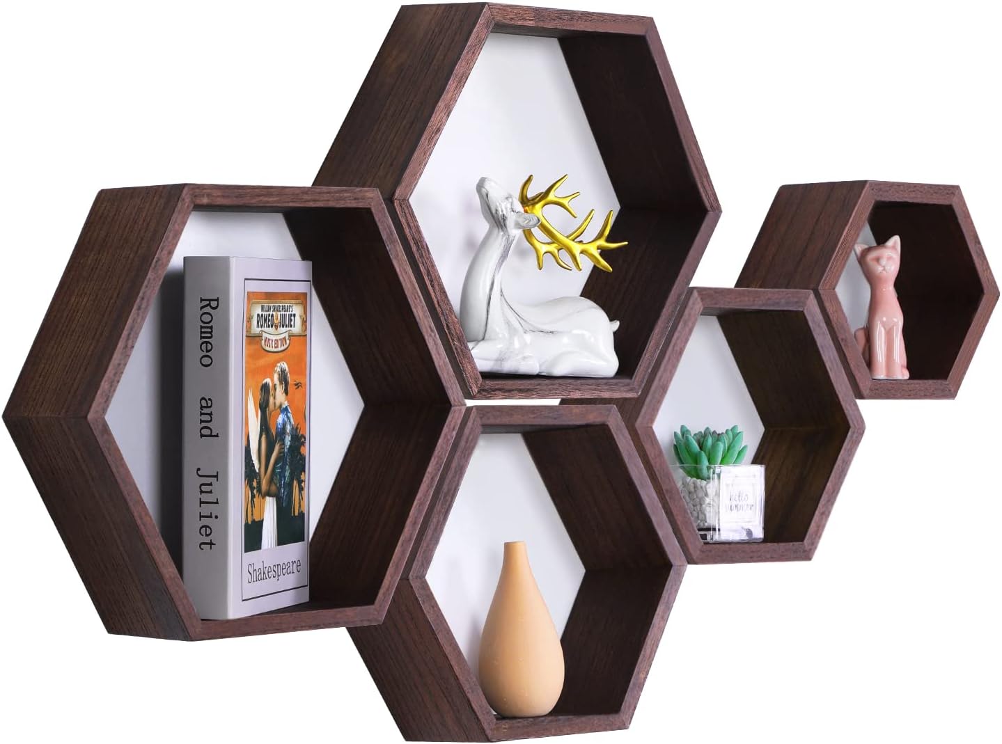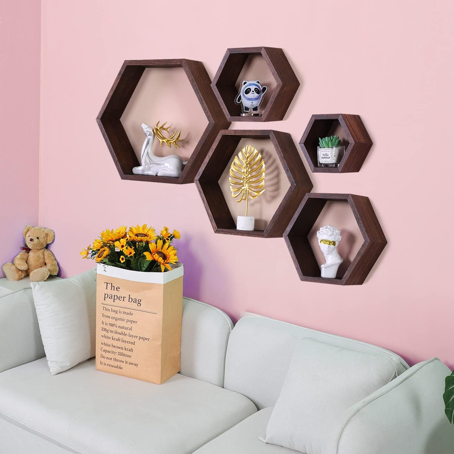 Dekorativne stenske police v heksagonalni obliki so zasnovane za funkcionalno shranjevanje in estetsko razstavljanje v bivalnih prostorih. Izdelane iz pravega lesa pavlovnije združujejo naraven videz, nizko težo in stabilno konstrukcijo ter omogočajo prilagodljivo postavitev na steni.