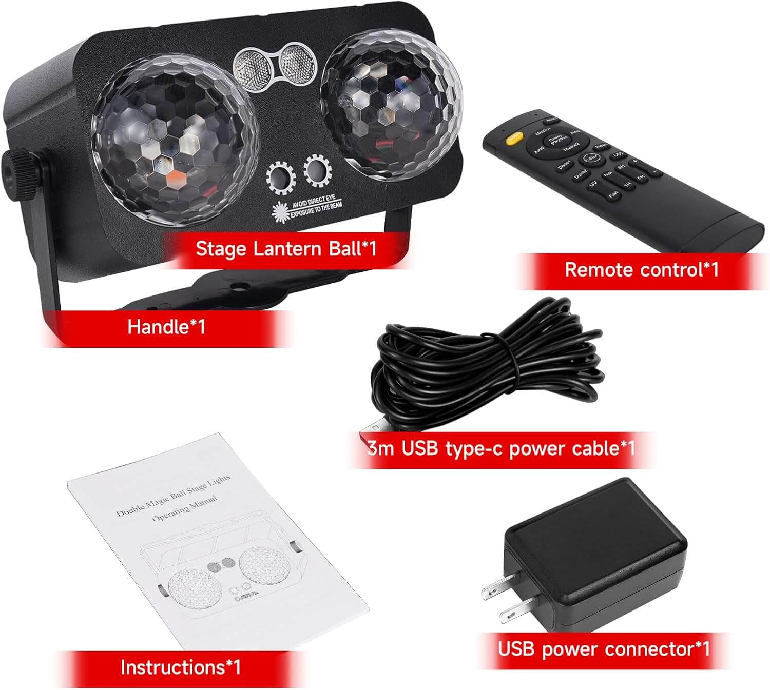 6-v-1 svetlobni sistem: Vključuje dvojno disko kroglo, UV vijolično svetlobo, LED osvetlitev ozadja ter rdeče in zelene gobo učinke za bogato vizualno izkušnjo.