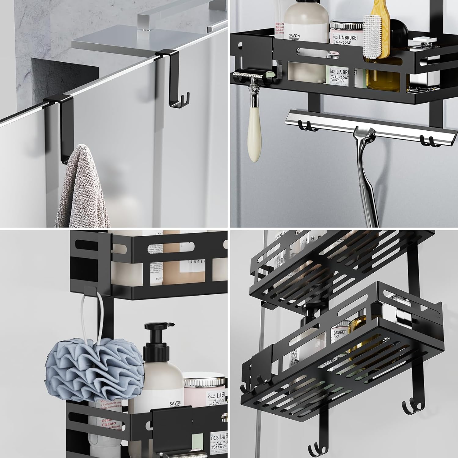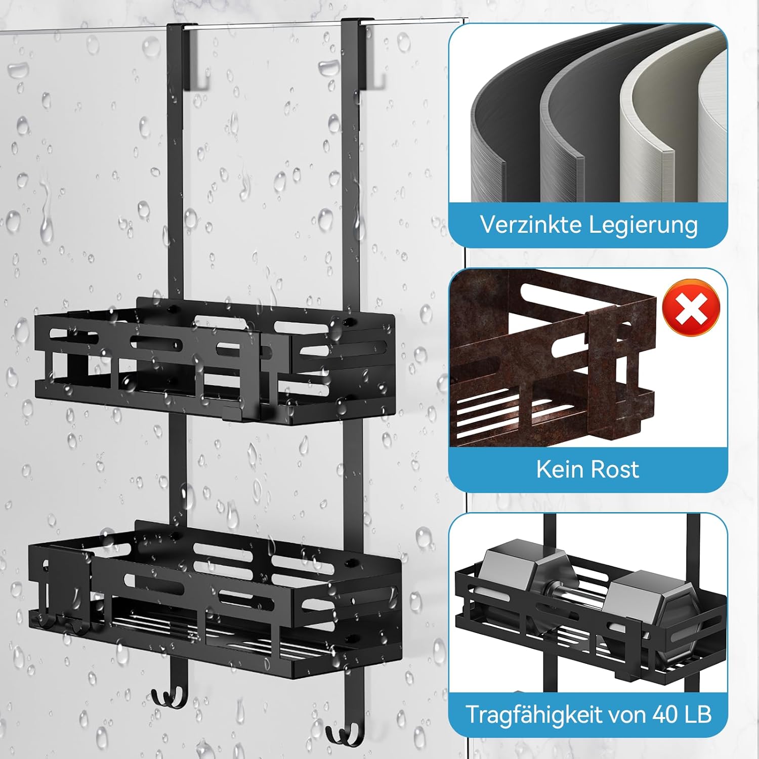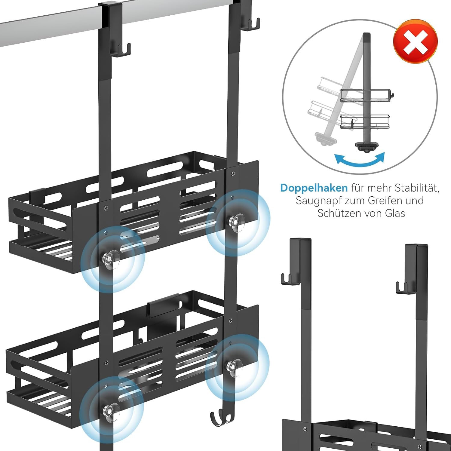 Polica za tuširanje ima dvojno zasnovo, ki omogoča boljšo stabilnost in večjo nosilnost. Opremljena je z več košarami in kljukami, kar omogoča priročno shranjevanje vseh tuš potrebščin. Namestitev brez vrtanja ohranja steklena vrata tuš kabine brez poškodb.