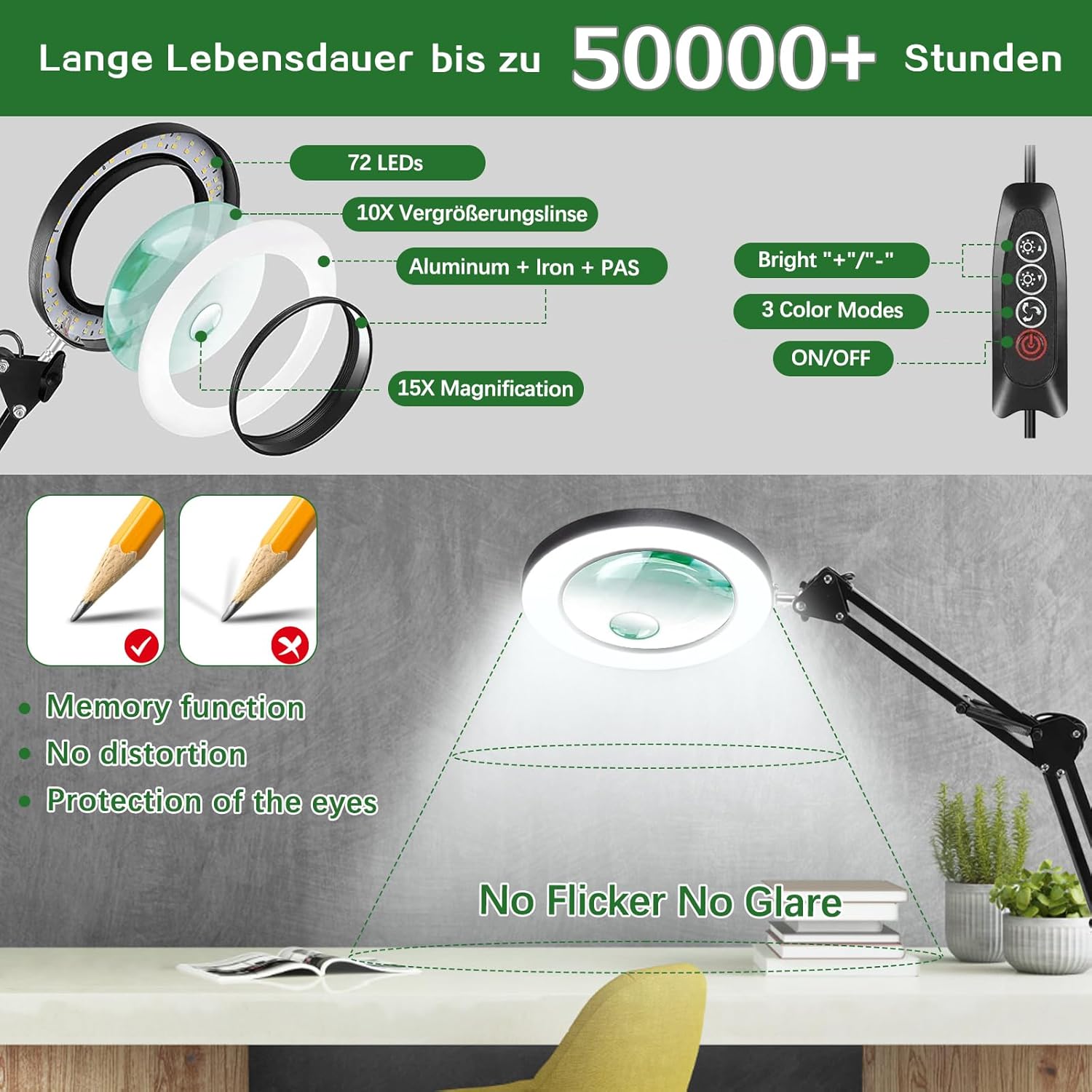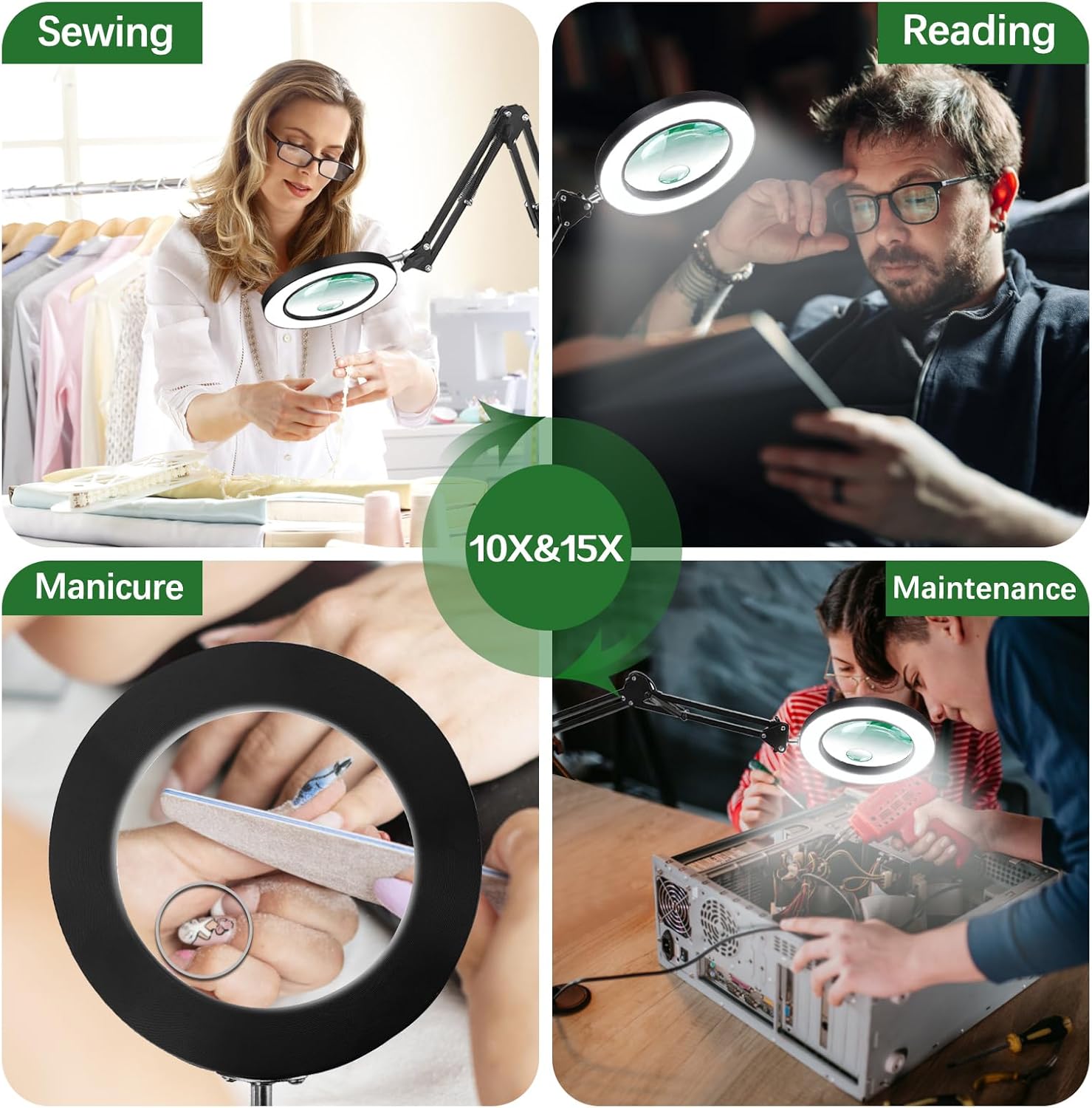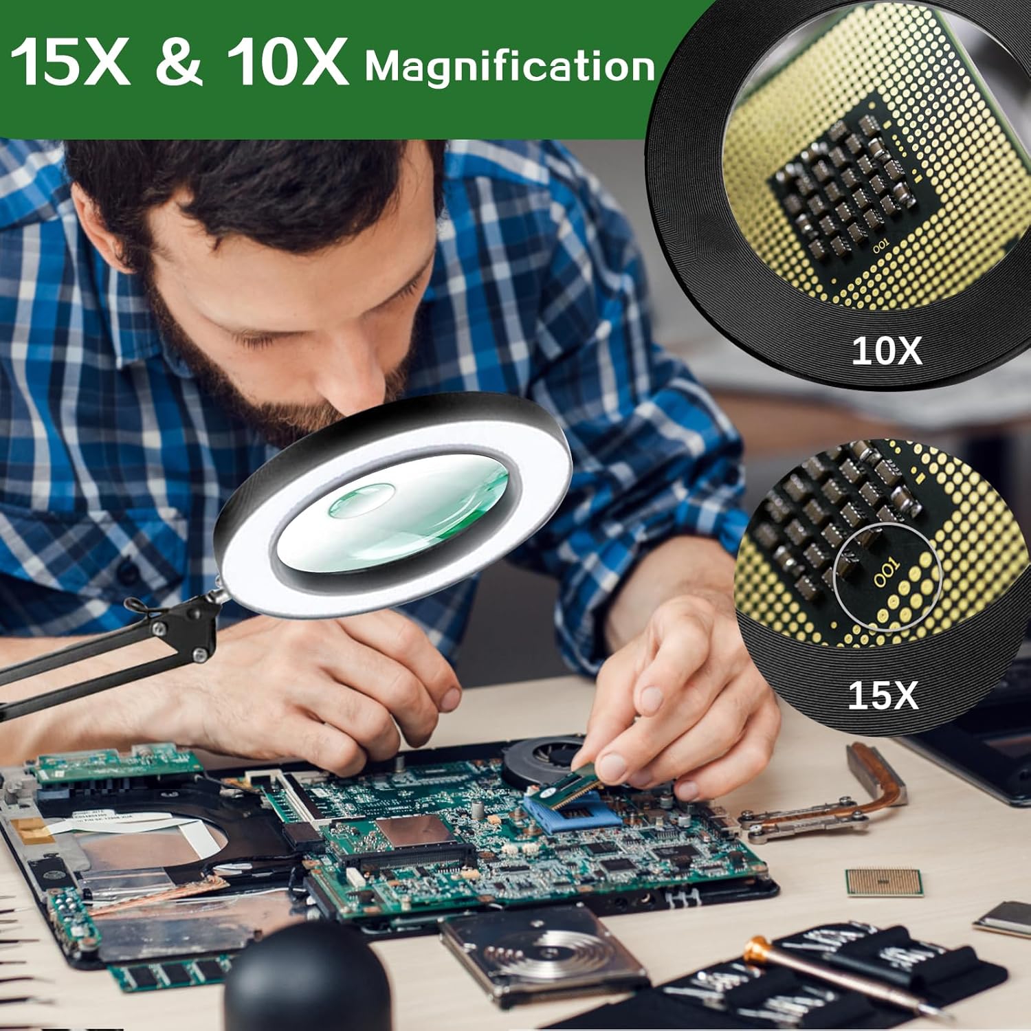 Visokokakovostna povečevalna svetilka z LED lučko ponuja 10- in 15-kratno povečavo za natančno delo. Ima nastavljivo roko z vpenjalnim nosilcem in omogoča uporabo brez rok. Z možnostjo neprekinjenega zatemnjevanja in izbiro med 3 barvnimi temperaturami je idealna za kozmetiko, ročna dela in pisarniško uporabo.