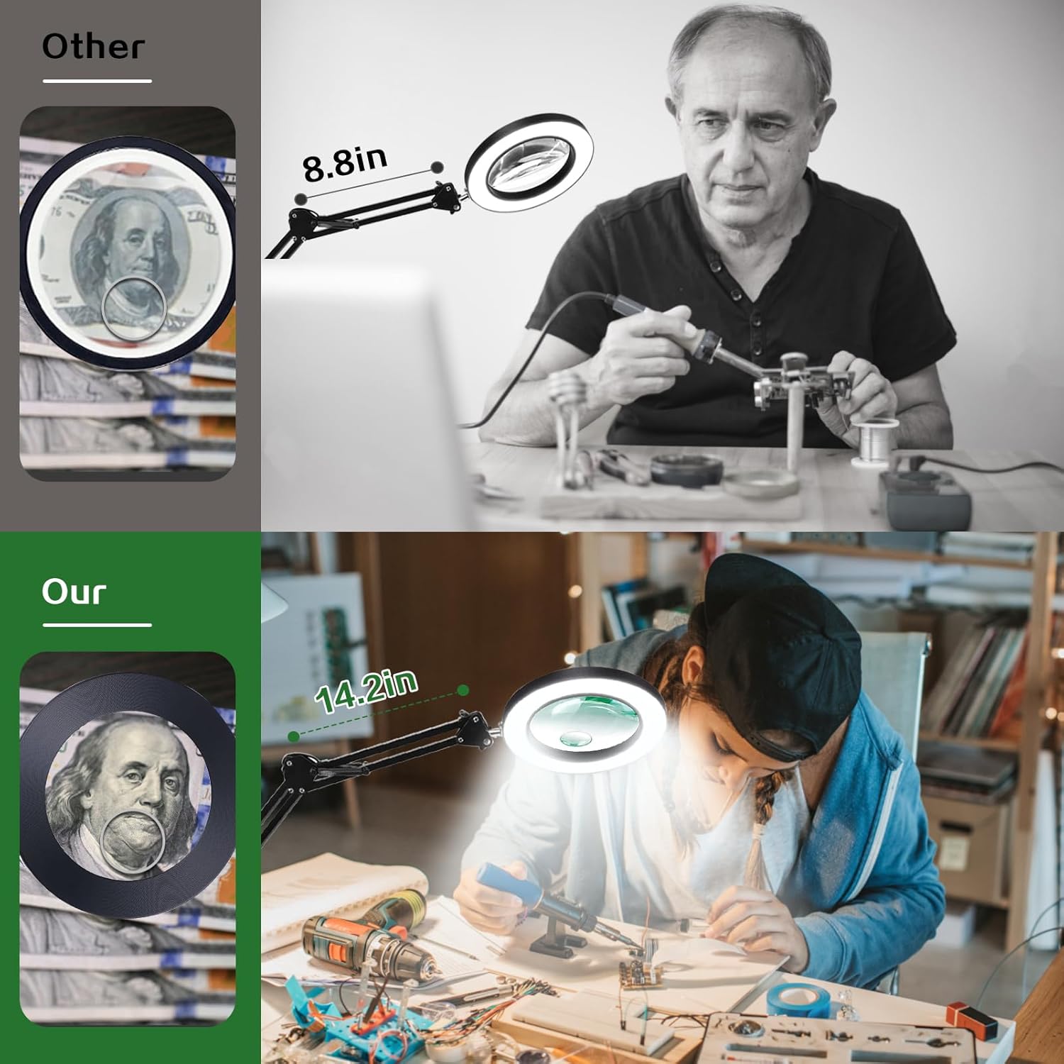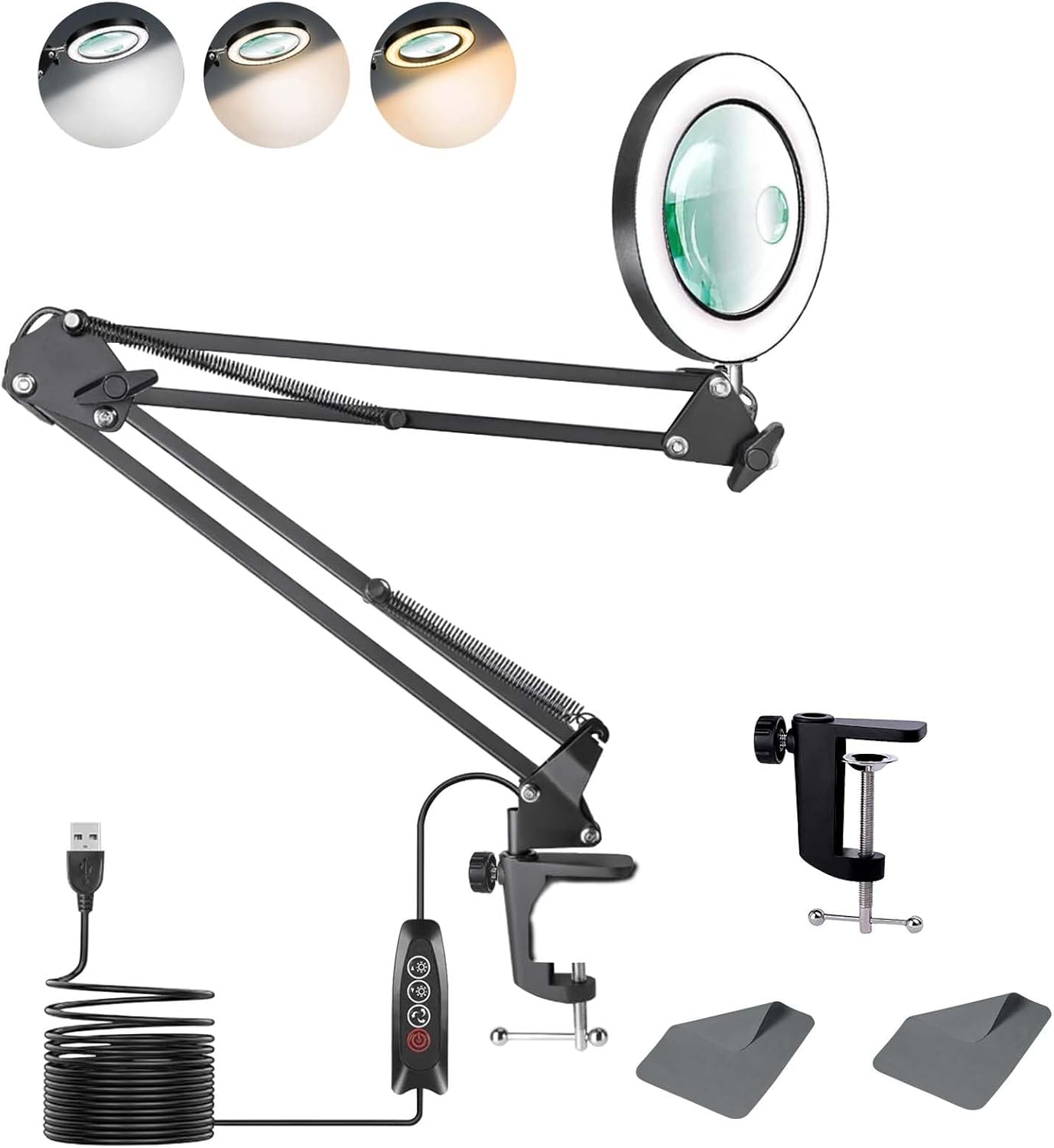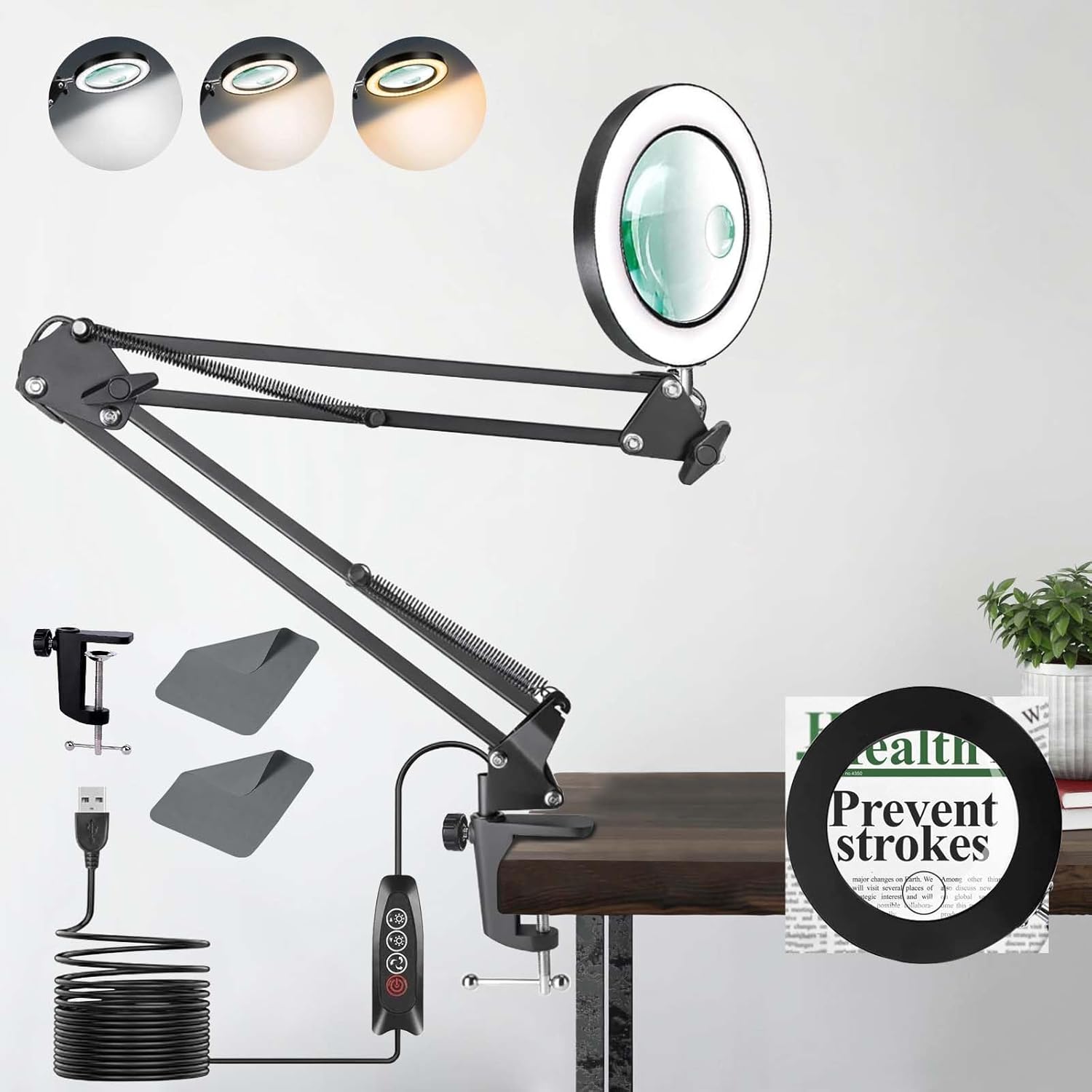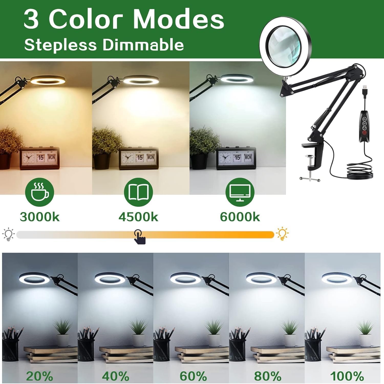 Visokokakovostna povečevalna svetilka z LED lučko ponuja 10- in 15-kratno povečavo za natančno delo. Ima nastavljivo roko z vpenjalnim nosilcem in omogoča uporabo brez rok. Z možnostjo neprekinjenega zatemnjevanja in izbiro med 3 barvnimi temperaturami je idealna za kozmetiko, ročna dela in pisarniško uporabo.