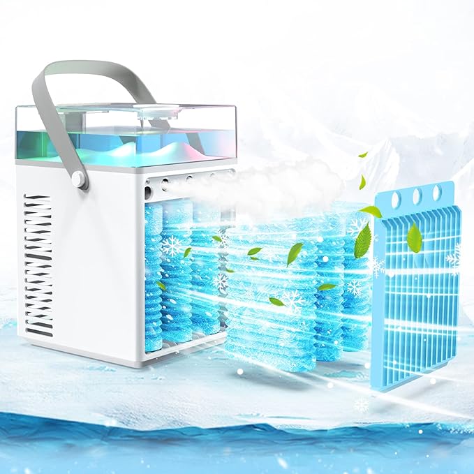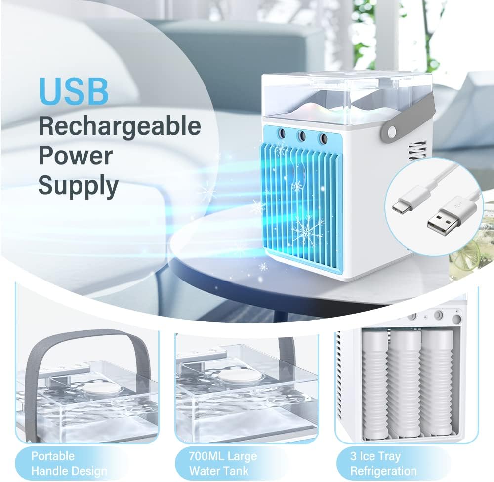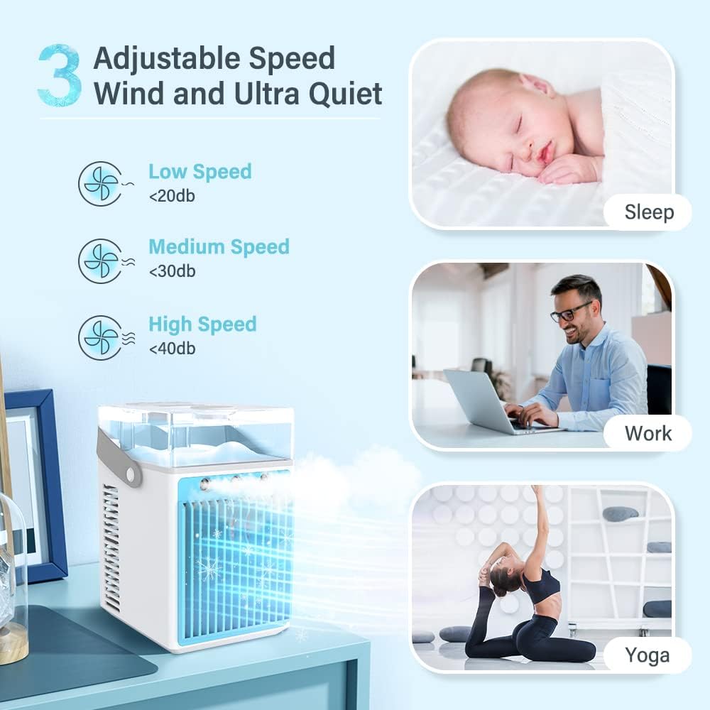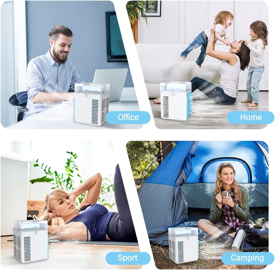 Prenosna hladilna naprava združuje funkcije ventilatorja, vlažilca zraka, klimatske naprave in nočne LED lučke. Z uporabo ultrazvočne atomizacije hitro zniža temperaturo z nežnim hlajenjem. Vgrajena baterija omogoča do 8 ur delovanja z enostavnim USB polnjenjem.
