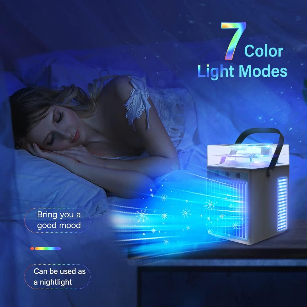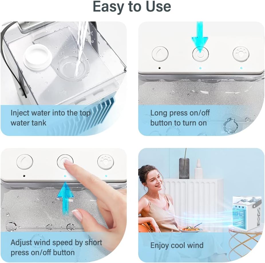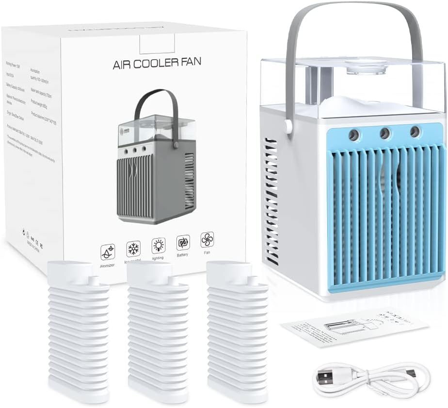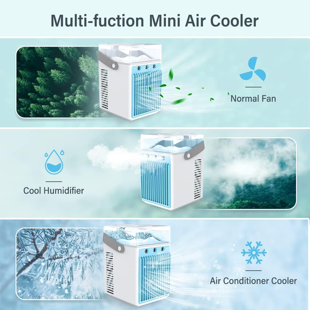 Prenosna hladilna naprava združuje funkcije ventilatorja, vlažilca zraka, klimatske naprave in nočne LED lučke. Z uporabo ultrazvočne atomizacije hitro zniža temperaturo z nežnim hlajenjem. Vgrajena baterija omogoča do 8 ur delovanja z enostavnim USB polnjenjem.