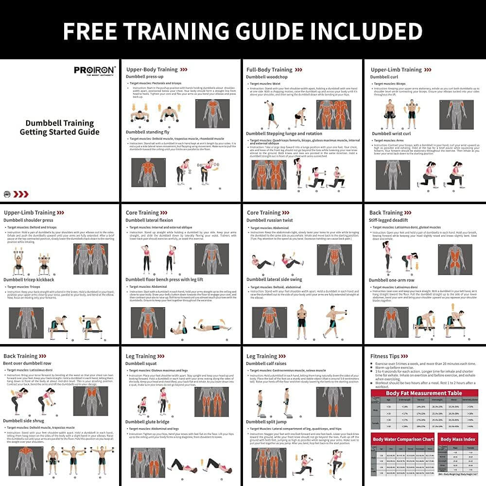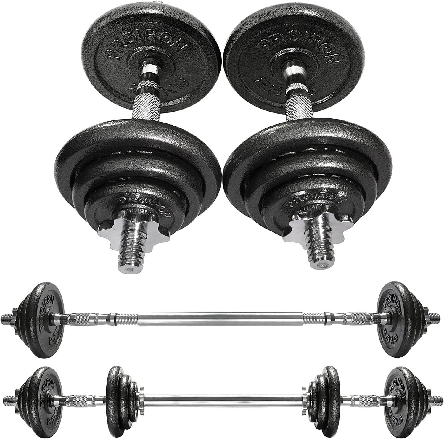 PROIRON 20 kg komplet ročk je vsestranski 2-v-1 set iz litega železa, ki omogoča uporabo kot klasične ročke ali kot dolgo palico zahvaljujoč priloženi jekleni povezovalni cevi. Ročke imajo ergonomičen, hrapav oprijem, varne zvezdaste zapore in nastavljive uteži, kar omogoča progresivni trening moči v domači telovadnici.