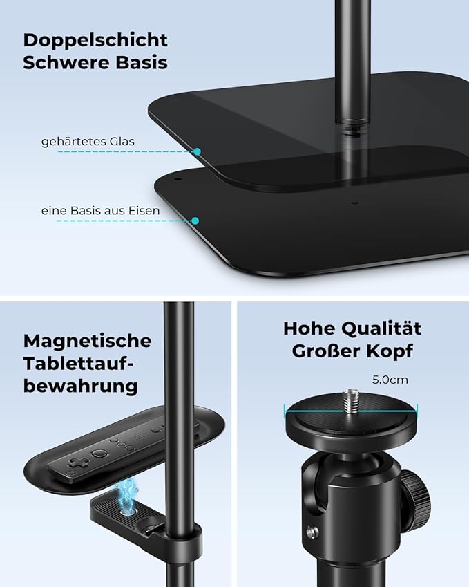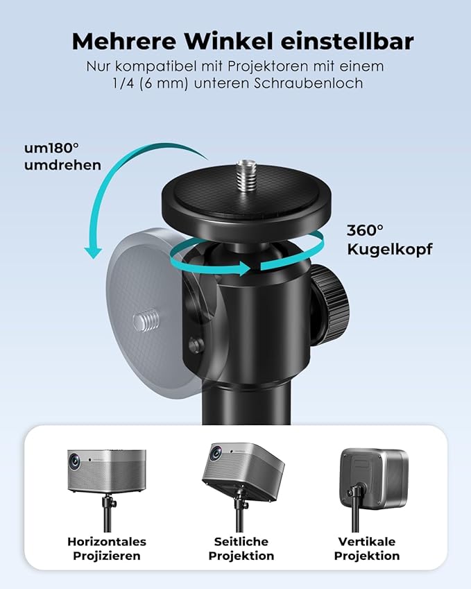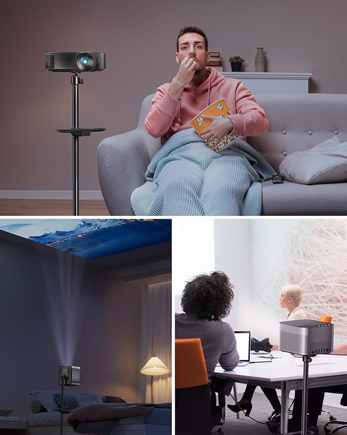 Univerzalno projektorsko stojalo je primerno za različne naprave s 1/4" navojem, kot so projektorji, kamere in pametni telefoni. Vrtljiva glava 360° omogoča natančno nastavitev kota za optimalno projekcijo. Kompaktna osnova iz kaljenega stekla in aluminija zagotavlja stabilnost in sodoben videz.