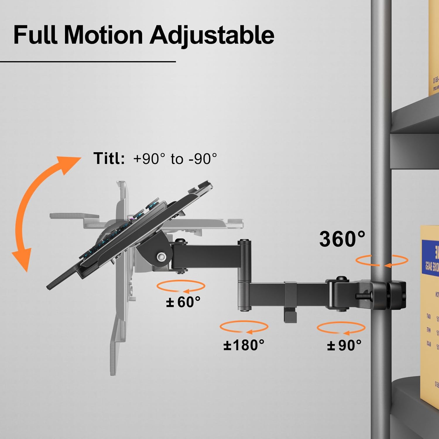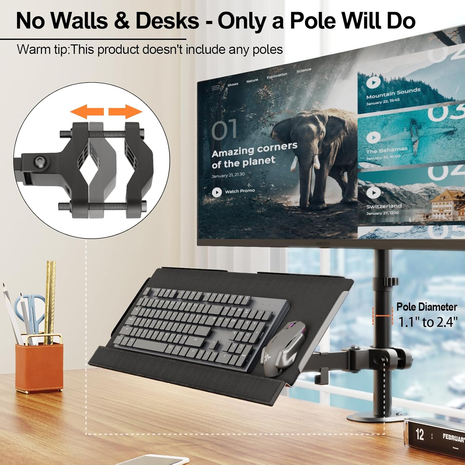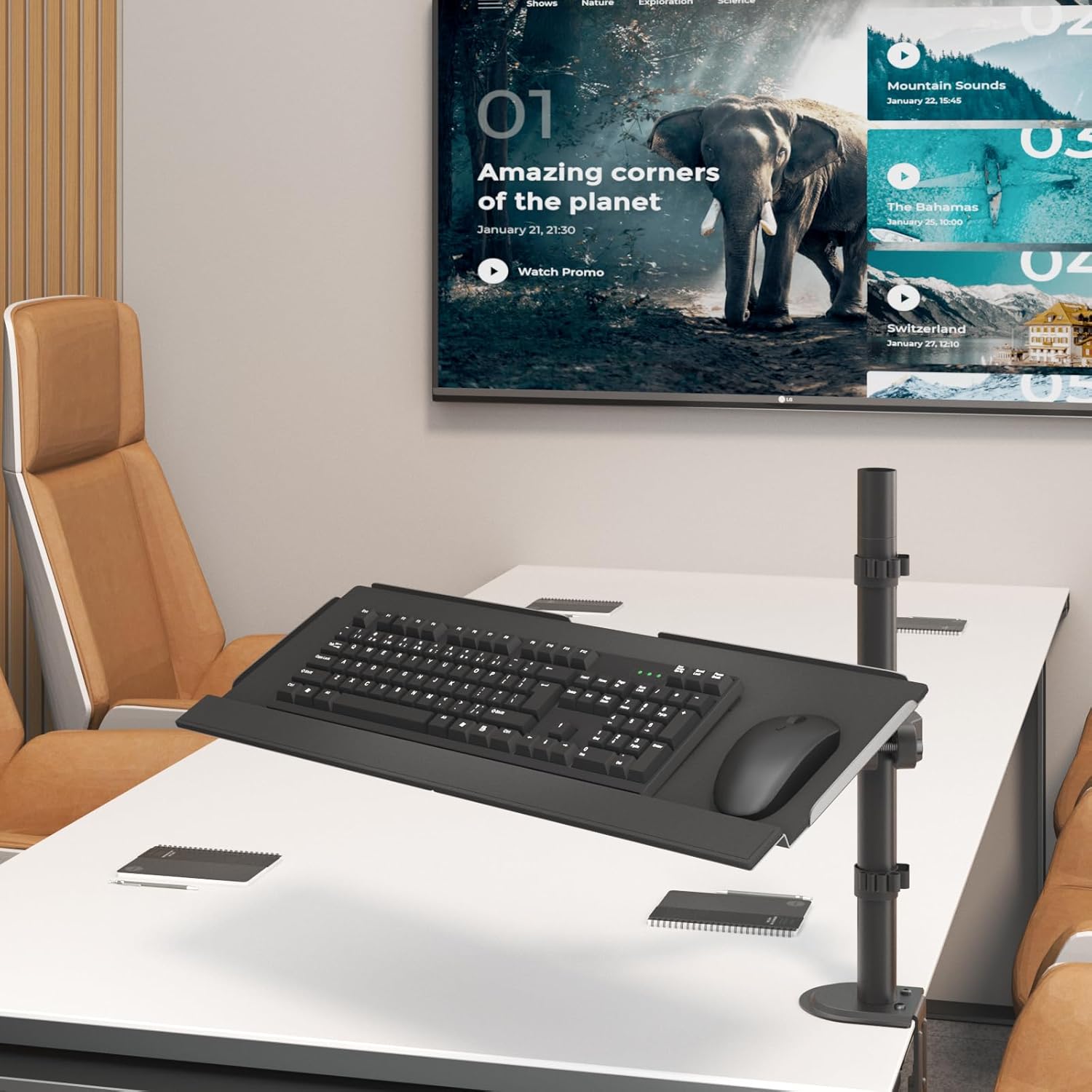Ergonomsko zasnovan nosilec omogoča montažo tipkovnice in miške neposredno na drog monitorja ali stensko roko. Namenjen je optimizaciji delovnega prostora in zagotavlja udobno tipkanje brez obremenjevanja zapestij. Izdelan je iz trpežnega jekla s sistemom za upravljanje kablov in popolnoma nastavljivim dvojnim členastim mehanizmom.