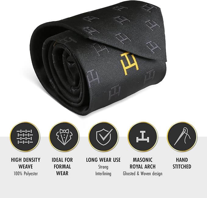 Elegantna črna kravata Royal Arch Chapter združuje prefinjenost, trpežnost in prilagodljivost, kar jo naredi idealno za različne formalne in svečane priložnosti. Izdelana iz visoko gostotnega poliestra s sredinsko oblogo iz volne in bombažnim prekrivalom zagotavlja odlično obliko in dolgotrajno uporabo.