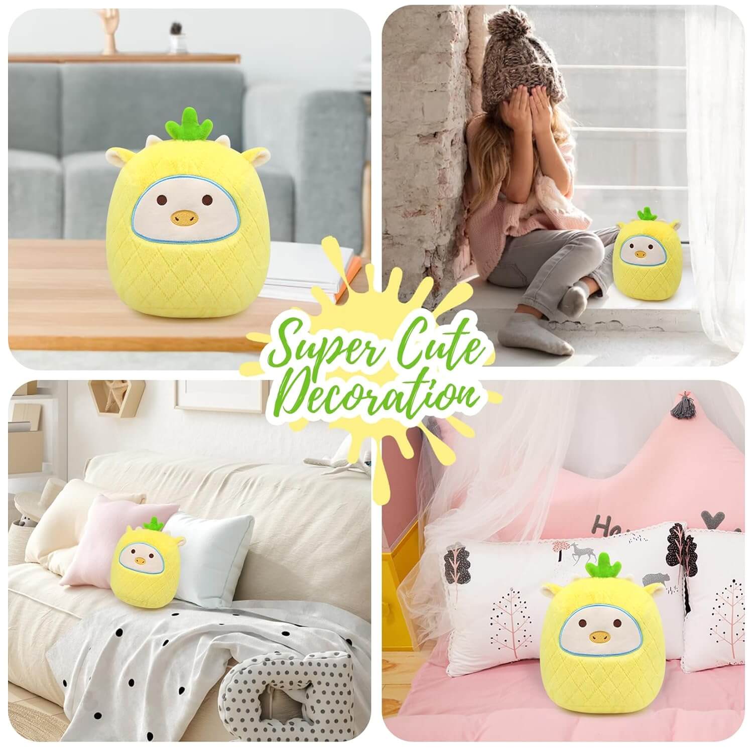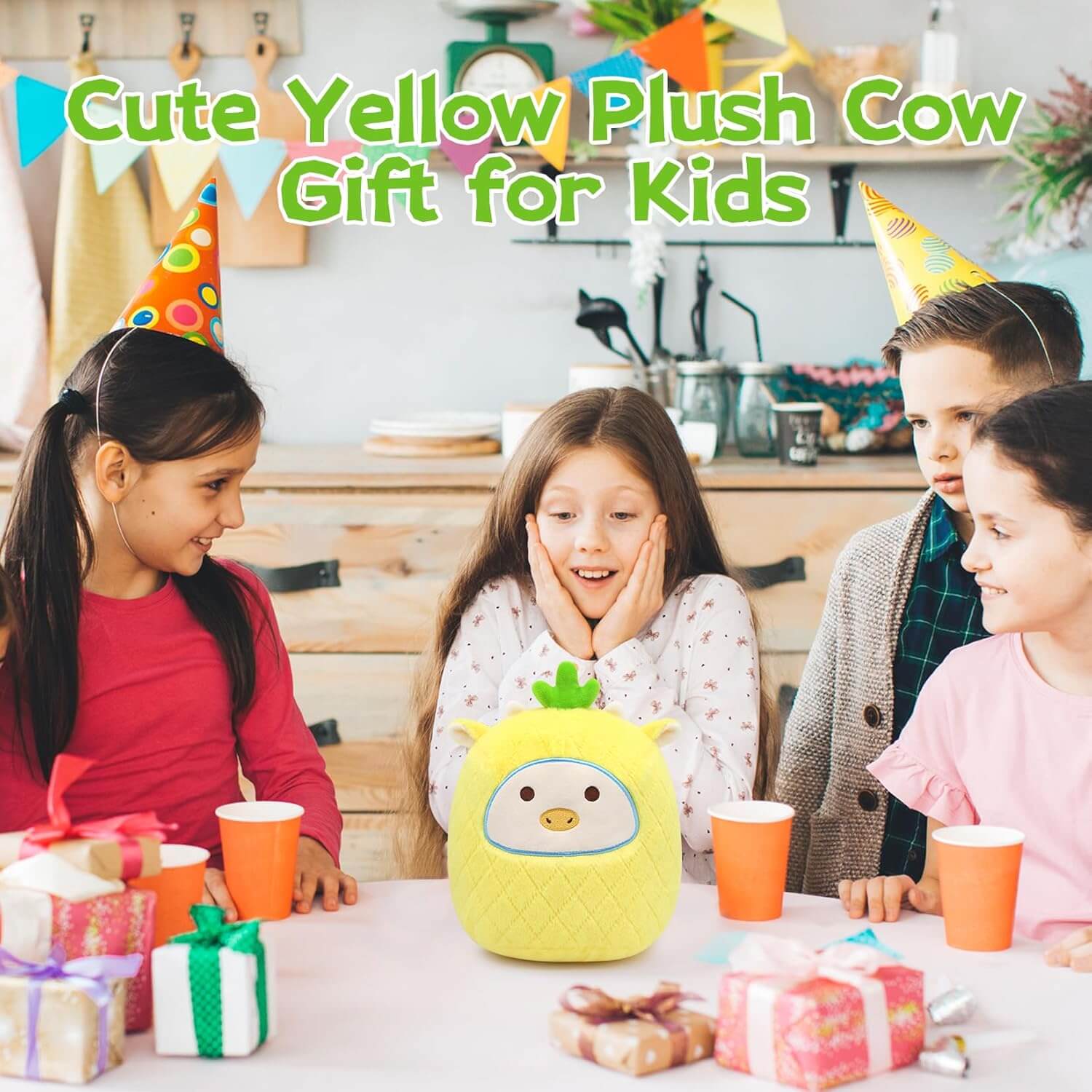 Prikupna rumena plišasta igrača "Fruit Cow" združuje udobje in ljubkost, kar jo naredi popoln dodatek za otroke ali ljubitelje plišastih igrač. S svojim edinstvenim dizajnom v sadni tematiki je idealna kot igrača, okras ali blazina za objemanje. Popolno darilo za otroke, dečke in deklice vseh starosti.