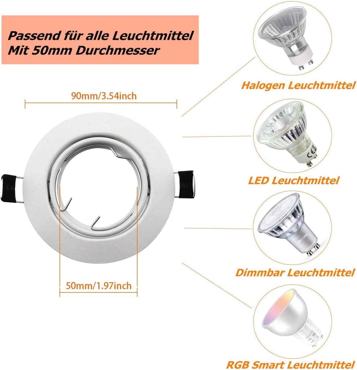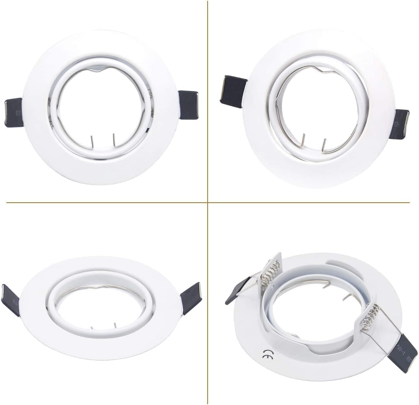 Komplet 20 vgradnih svetlobnih okvirjev GU10 v mat beli barvi je primeren za uporabo z LED ali halogenskimi žarnicami premera 50 mm. Nagibna izvedba omogoča 30° zasuk, kar zagotavlja natančno usmerjanje svetlobe. Enostavna namestitev brez transformatorja omogoča hitro uporabo v vseh prostorih – na stropih, stenah ali stopniščih.