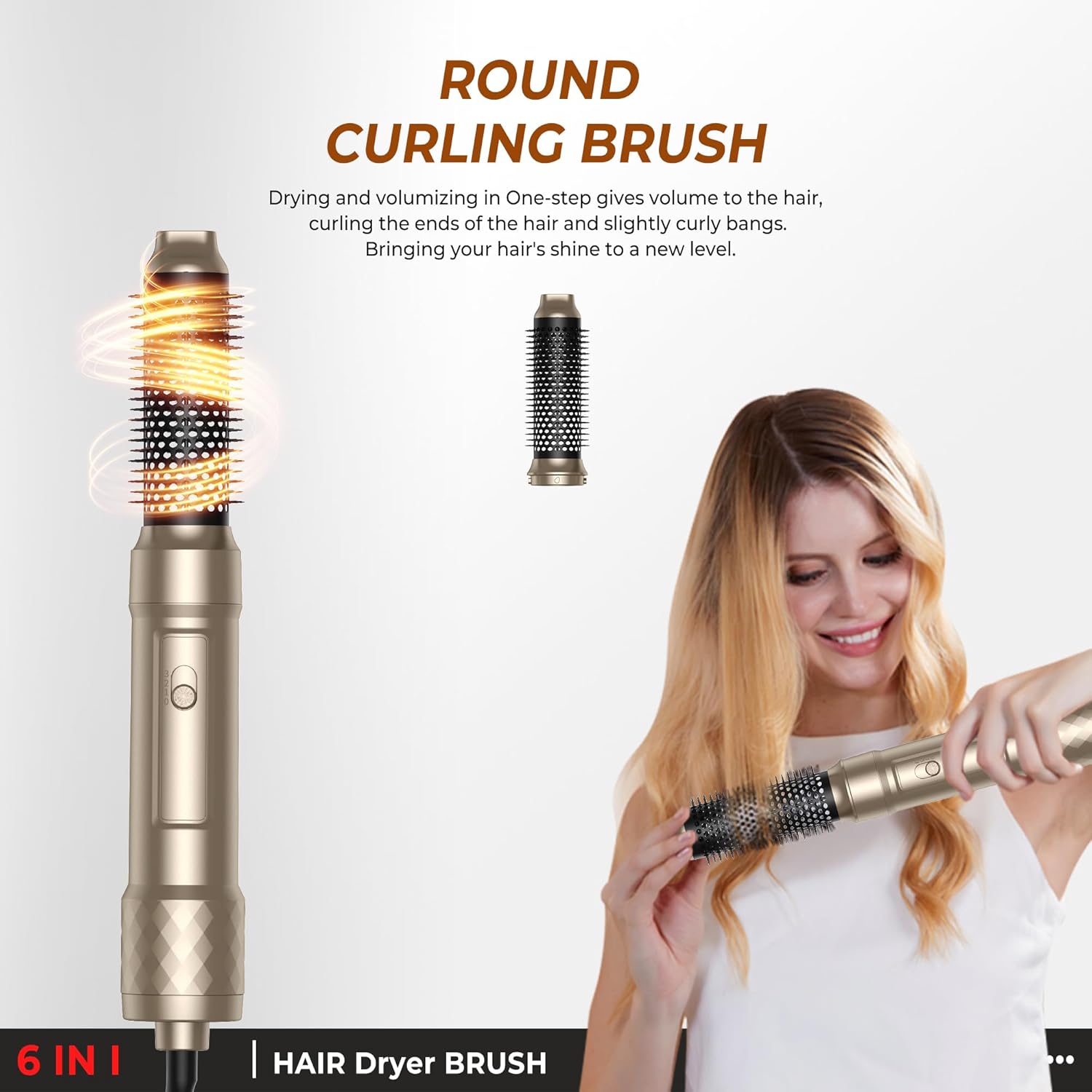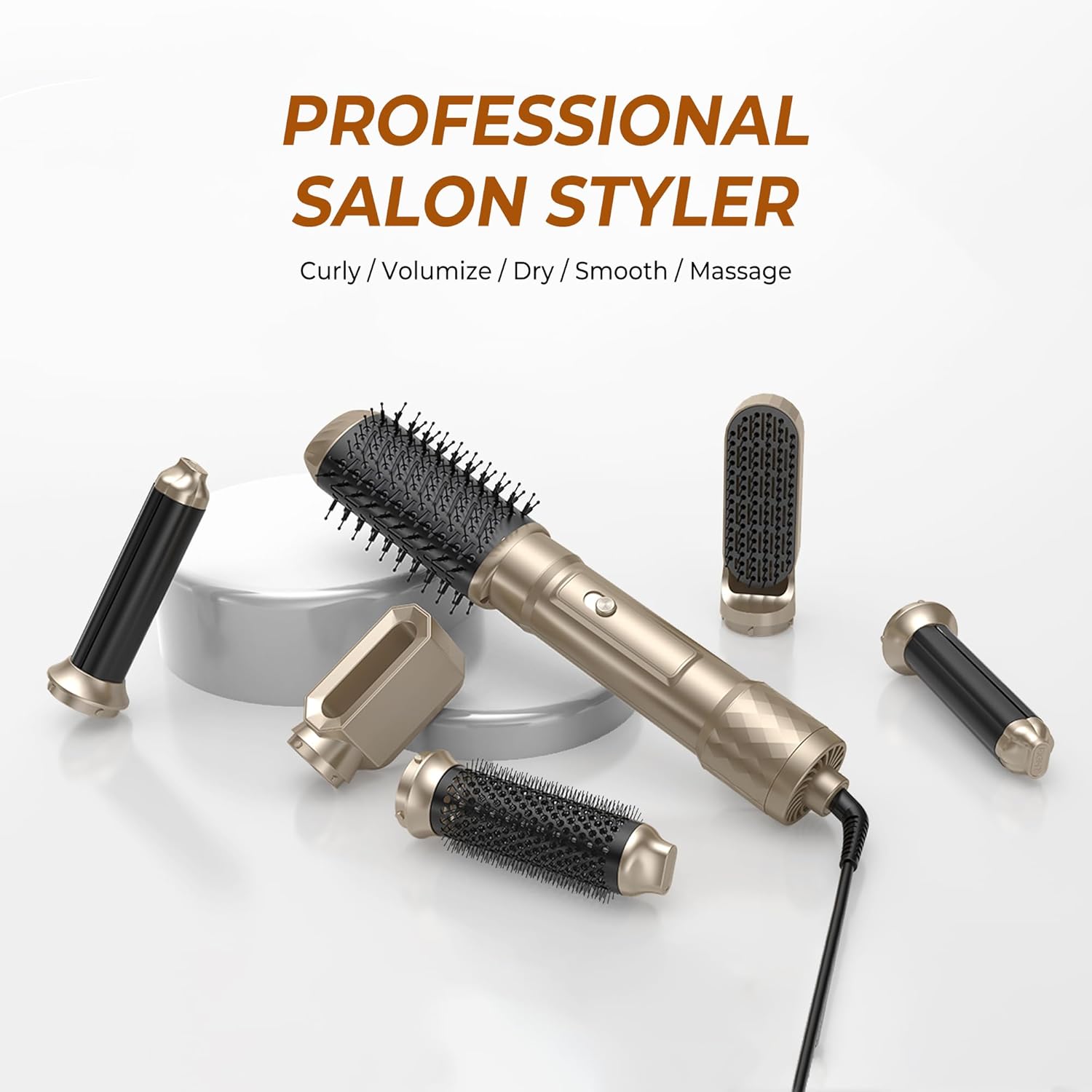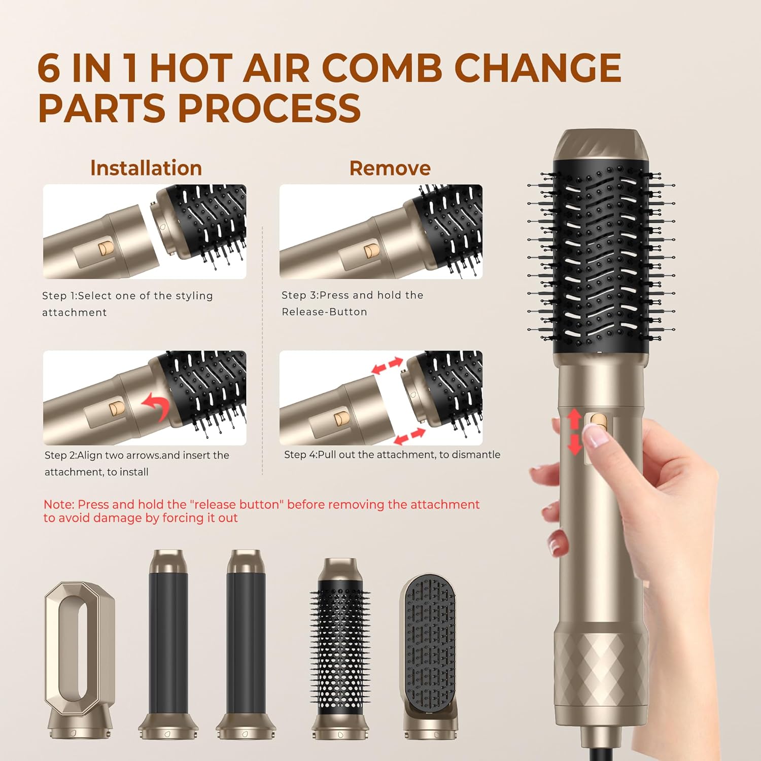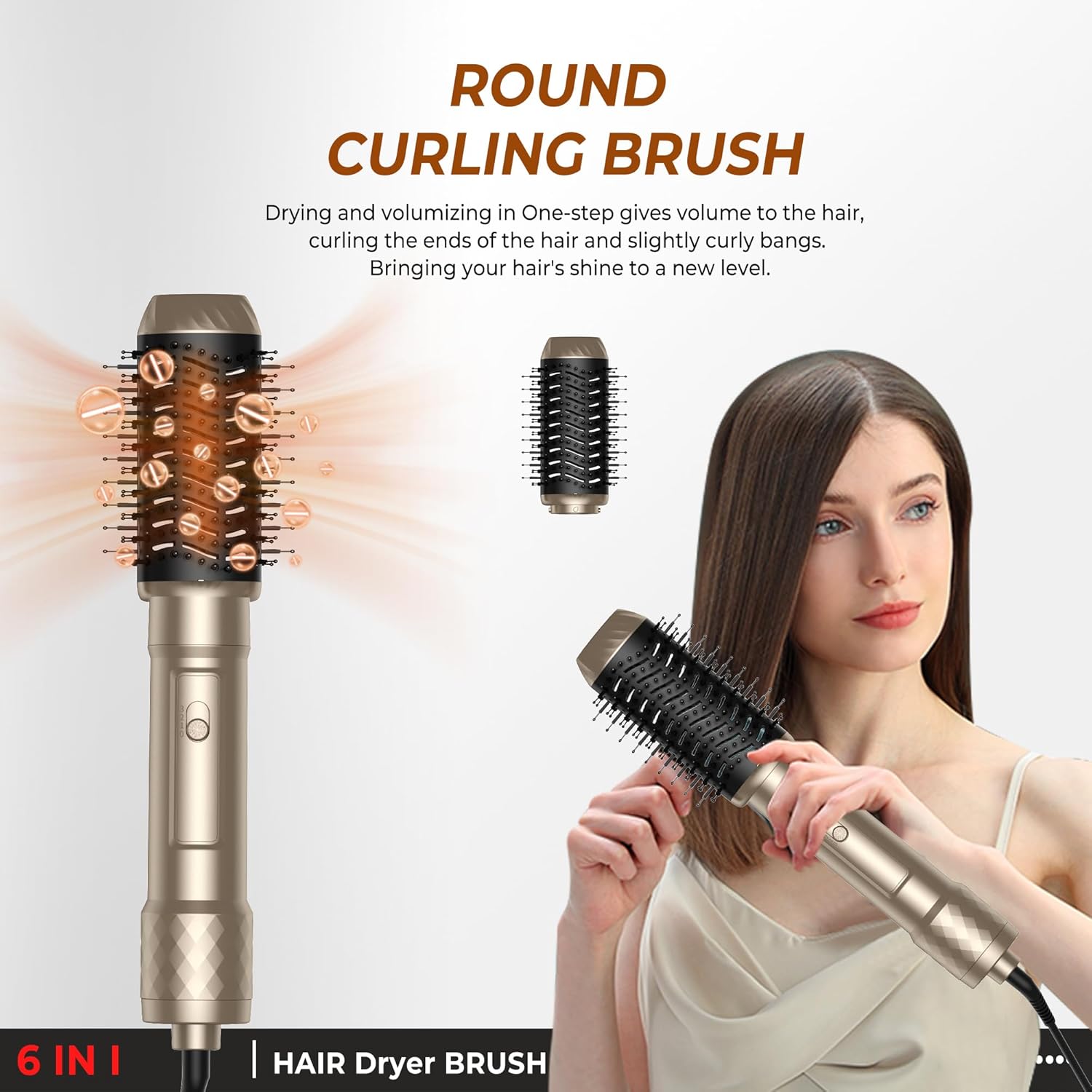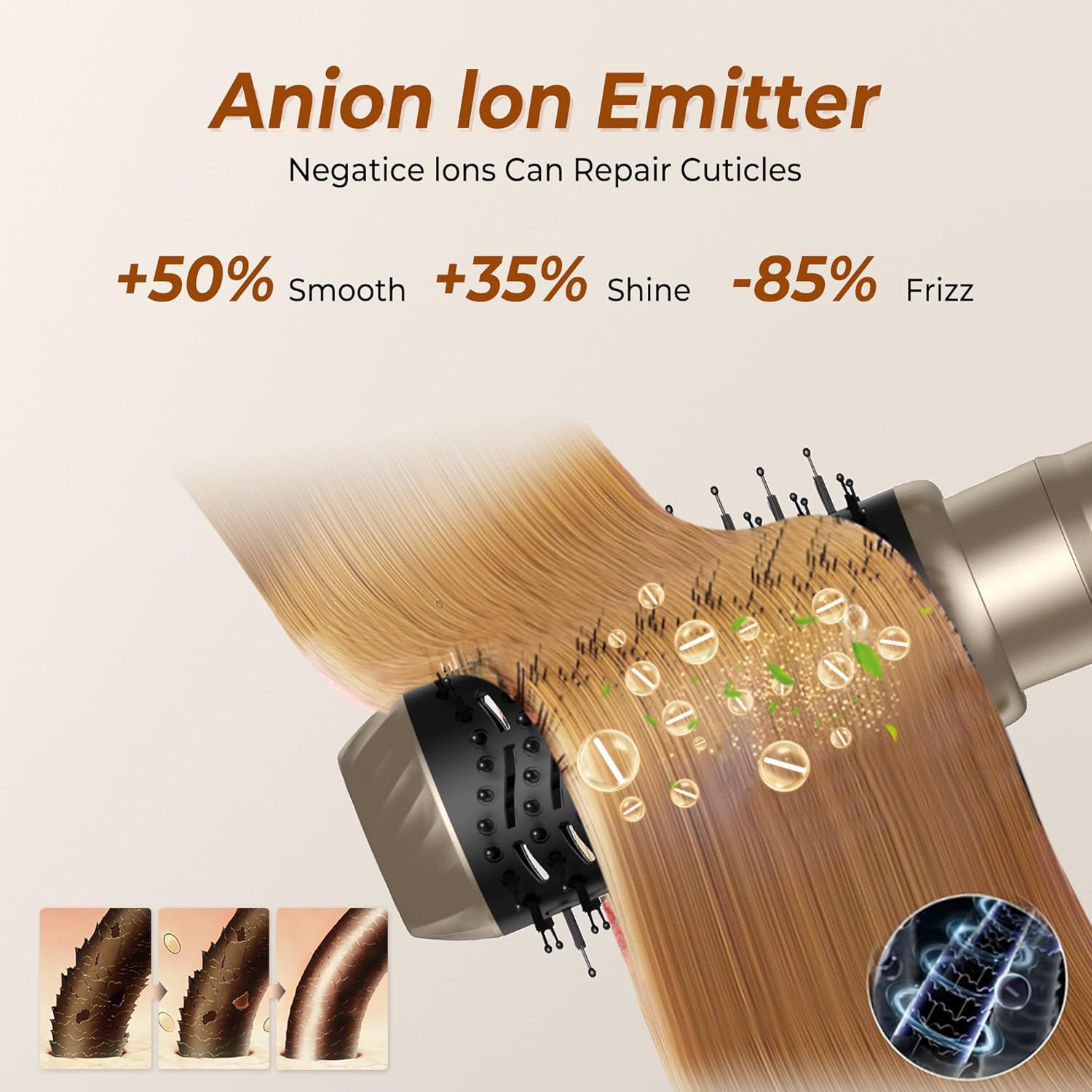 Večnamenski 6-v-1 set za oblikovanje las vključuje sušilnik, kodralnik, ravnalnik in volumizator za popolno pričesko. Negativni ioni in keramična prevleka zmanjšajo statično elektriko in ustvarijo gladke, sijoče lase brez poškodb. Ergonomska zasnova s 360° vrtljivim kablom omogoča enostavno in udobno uporabo.