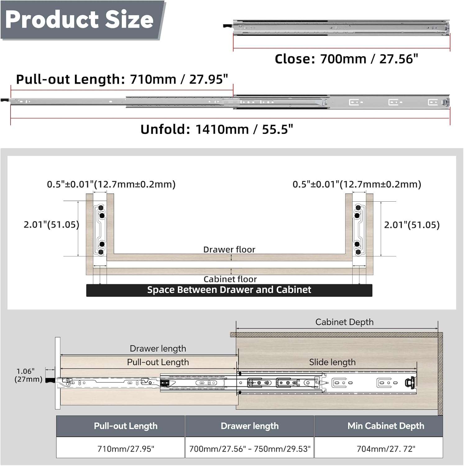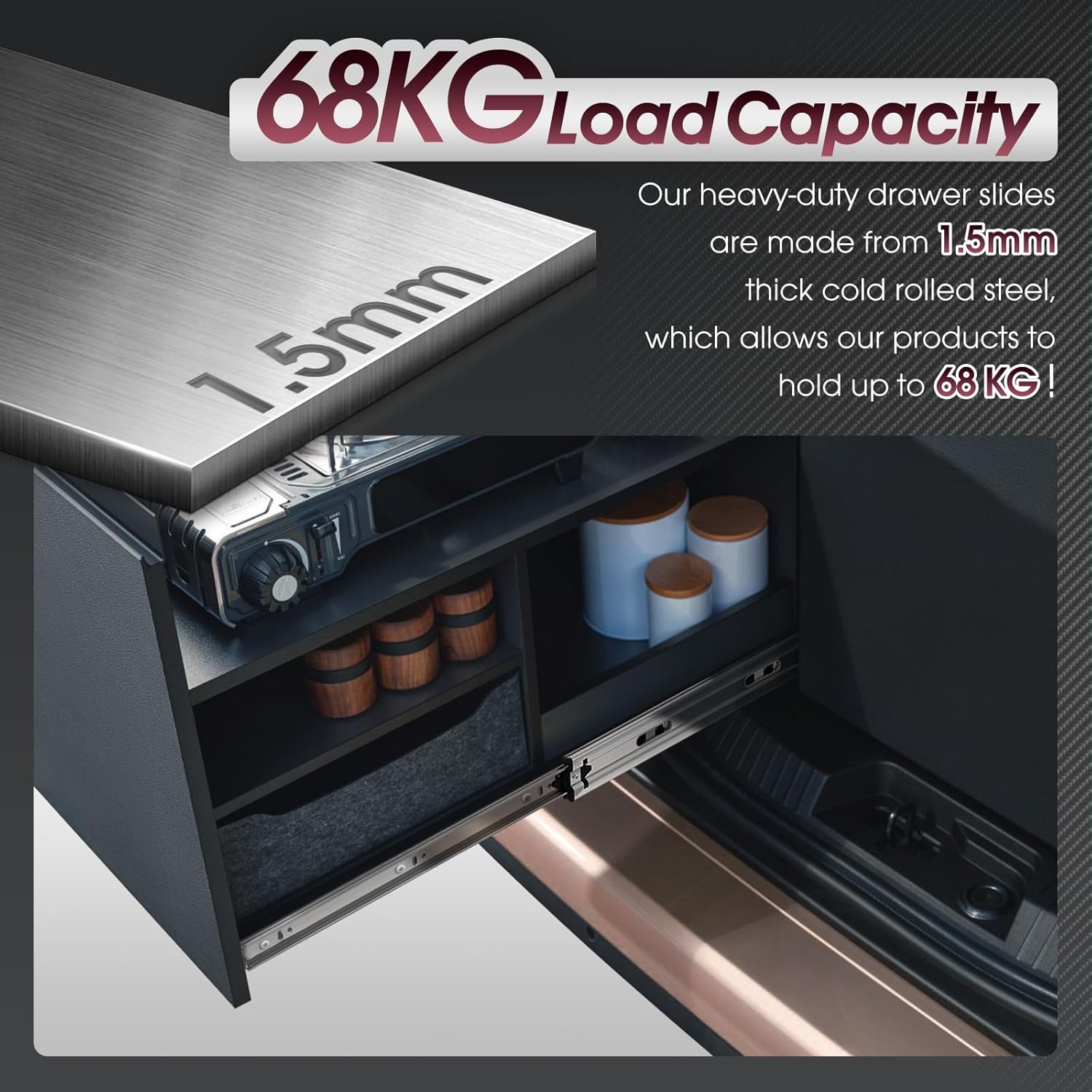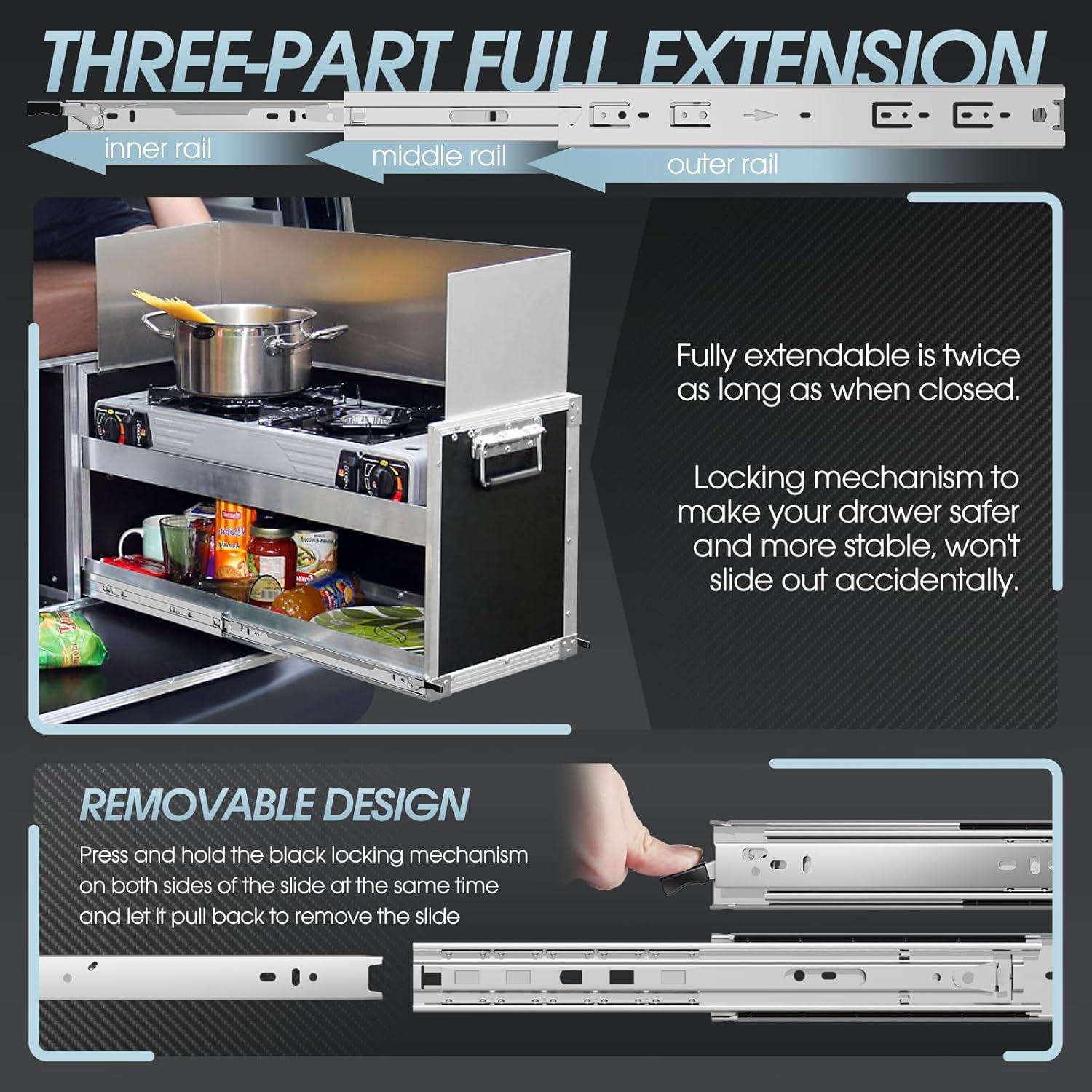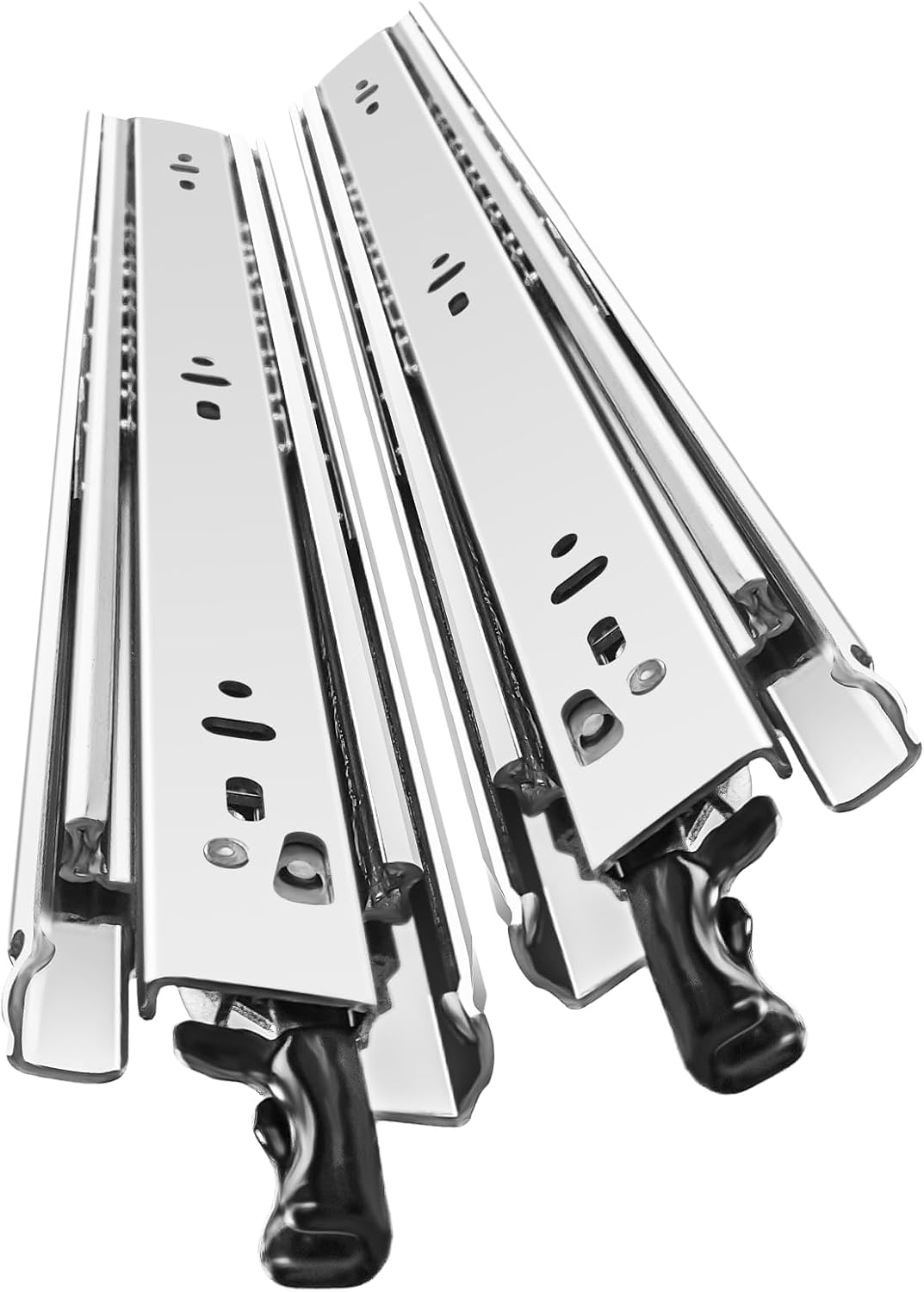 Trpežna izvlečna vodila so zasnovana za težke predale in industrijsko uporabo, kjer je potrebna visoka nosilnost in varnost. Izdelana so iz hladno valjanega jekla Q235 z cinkovo modro zaščito proti rji in koroziji. Z vgrajenim zaklepnimi mehanizmom omogočajo varno zapiranje ali blokado v popolnoma odprtem položaju.