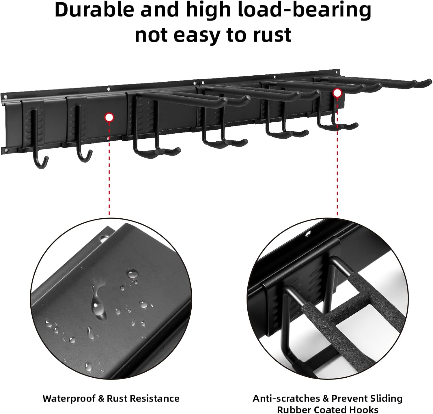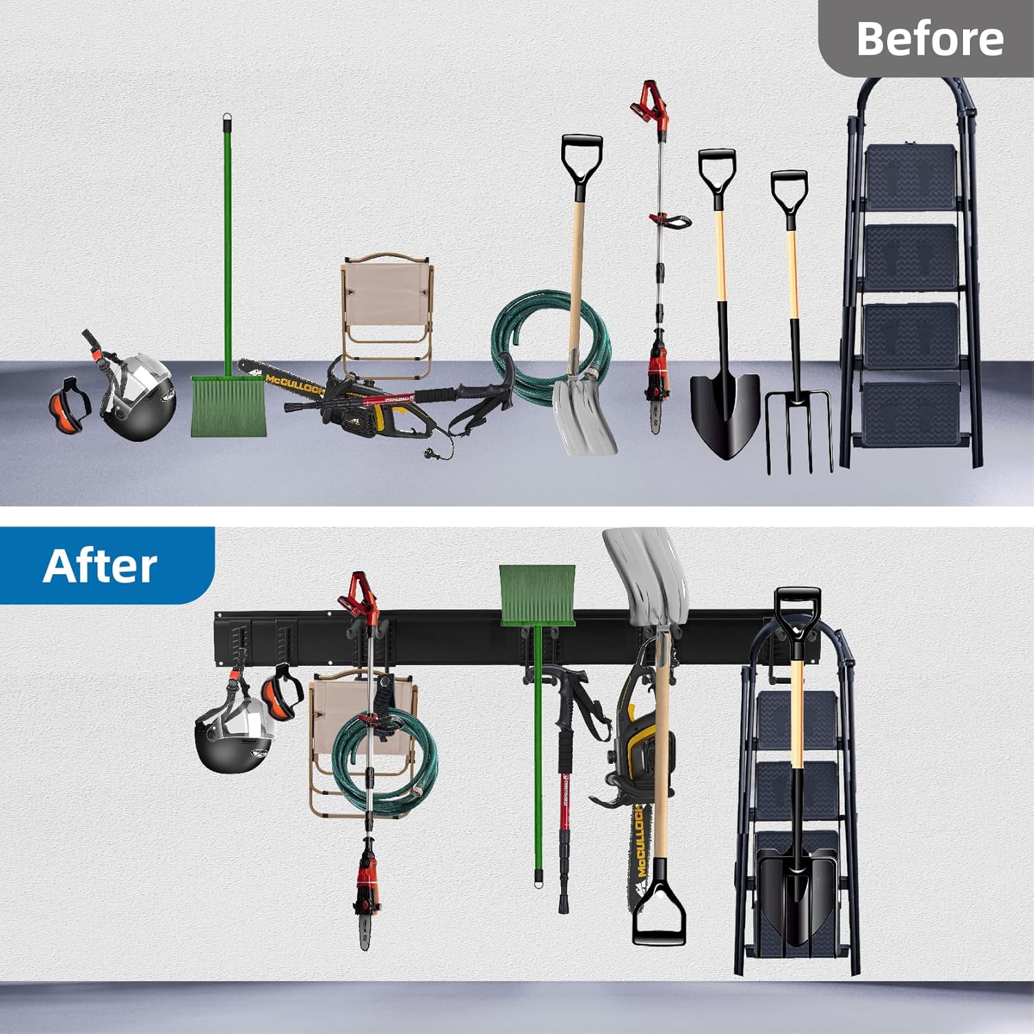 Praktičen stenski sistem za shranjevanje orodja omogoča pregledno in varno organizacijo garažnega ali vrtnega orodja. Izdelan je iz visokokakovostnega jekla z prahasto prevleko proti koroziji, medtem ko so kavlji gumirani za zaščito orodja pred poškodbami. Z nosilnostjo do 300 funtov (136 kg) je idealen za težja orodja in športno opremo.