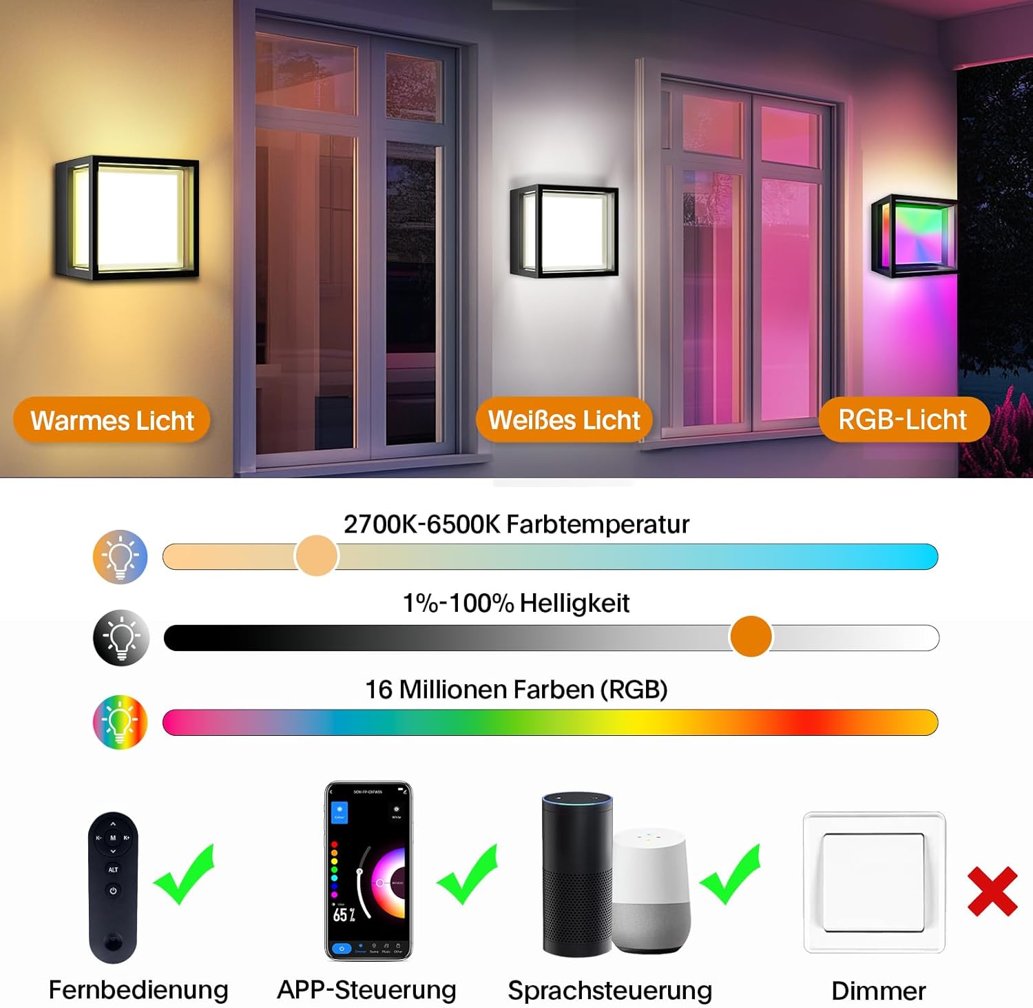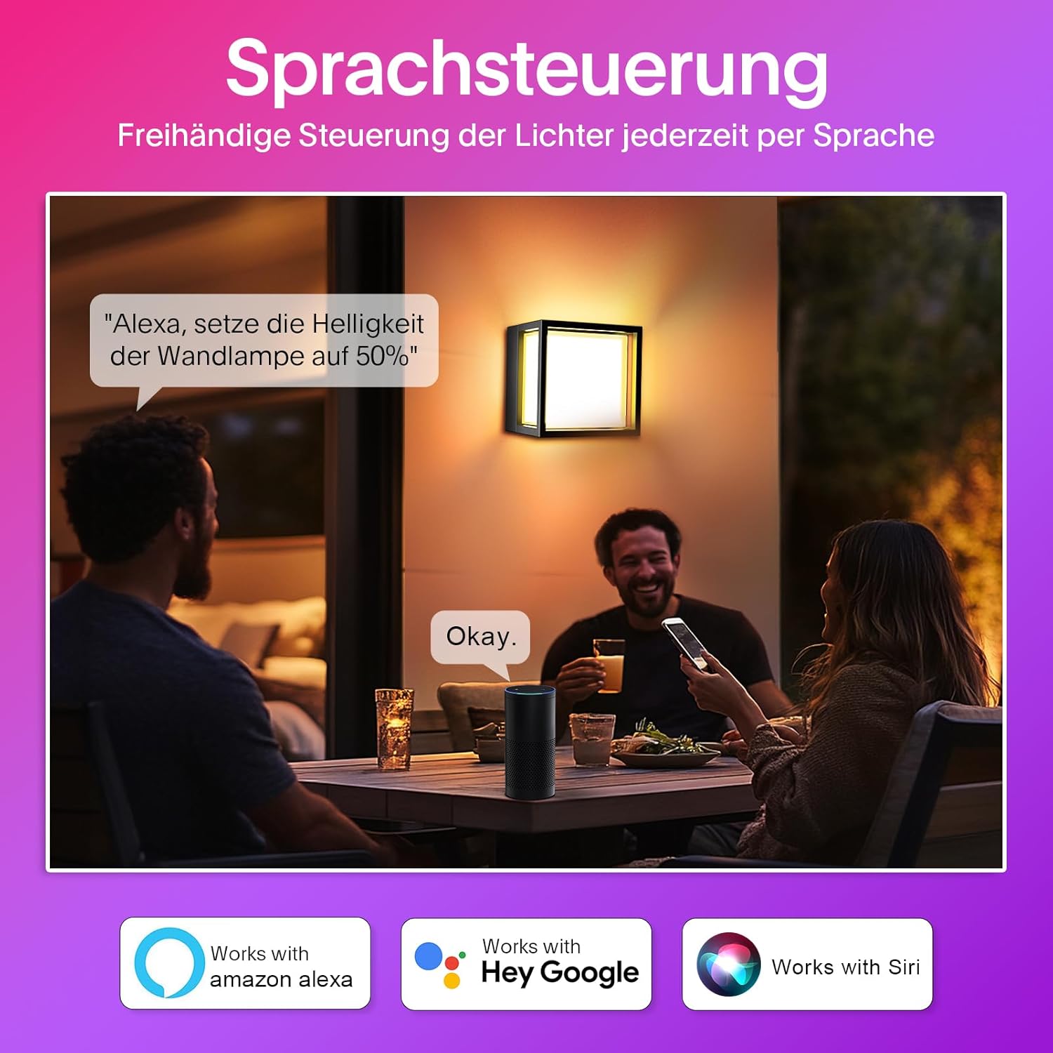 Pametna LED stenska svetilka združuje sodoben dizajn, napredno RGB tehnologijo in pametne funkcije za popolno osvetlitev notranjih in zunanjih prostorov. Svetilka omogoča spremembo barv, nastavitev svetlosti in upravljanje prek aplikacije, daljinca ali glasovnih pomočnikov Alexa, Google Assistant in Siri.