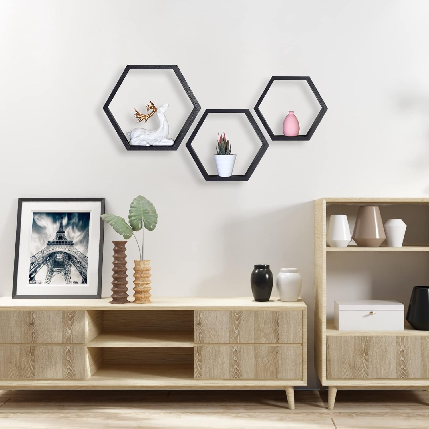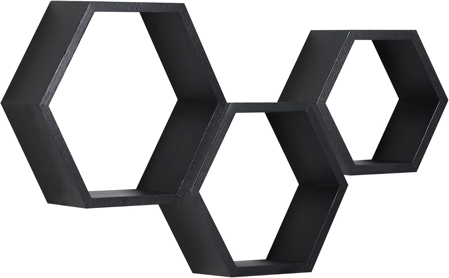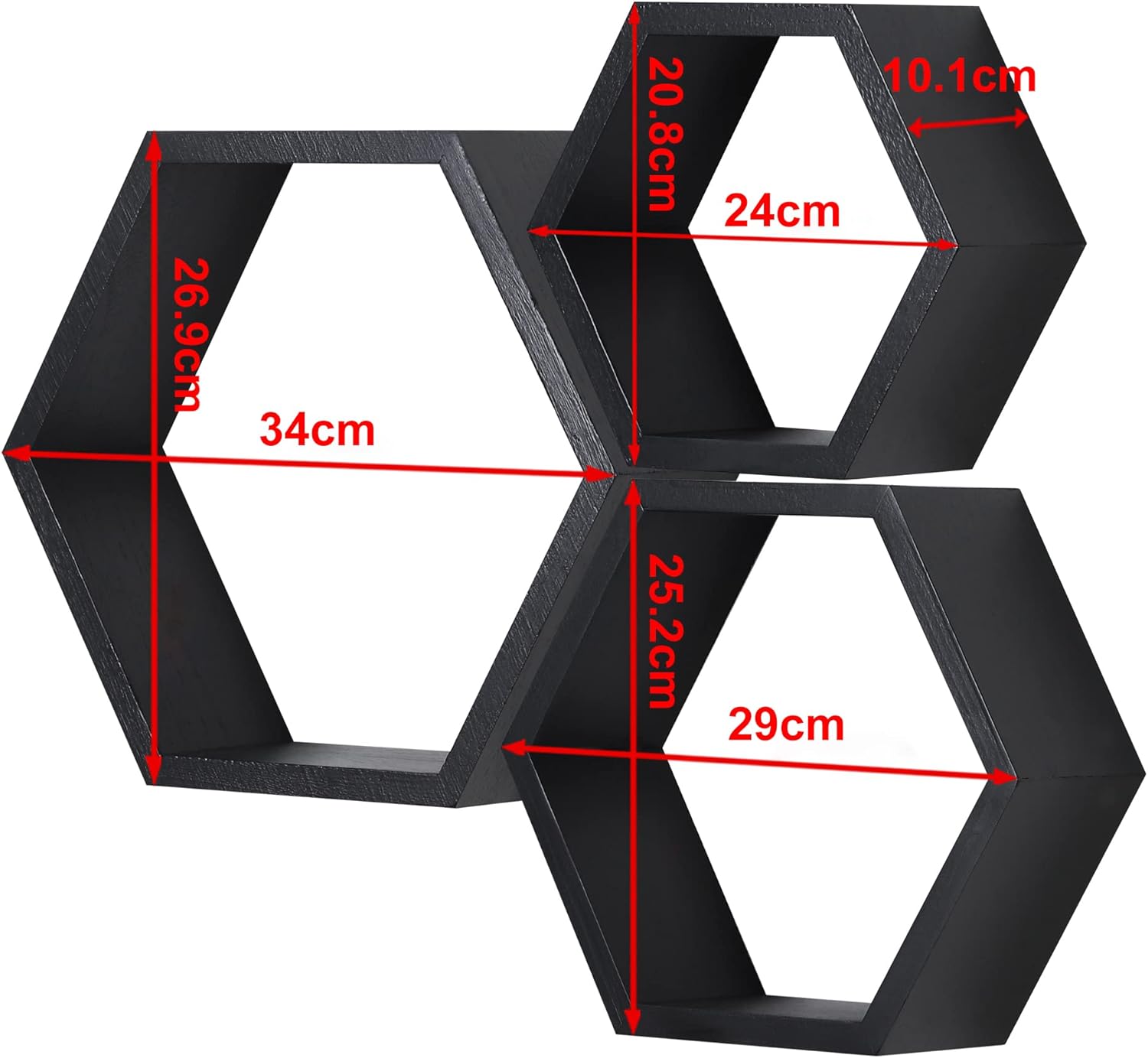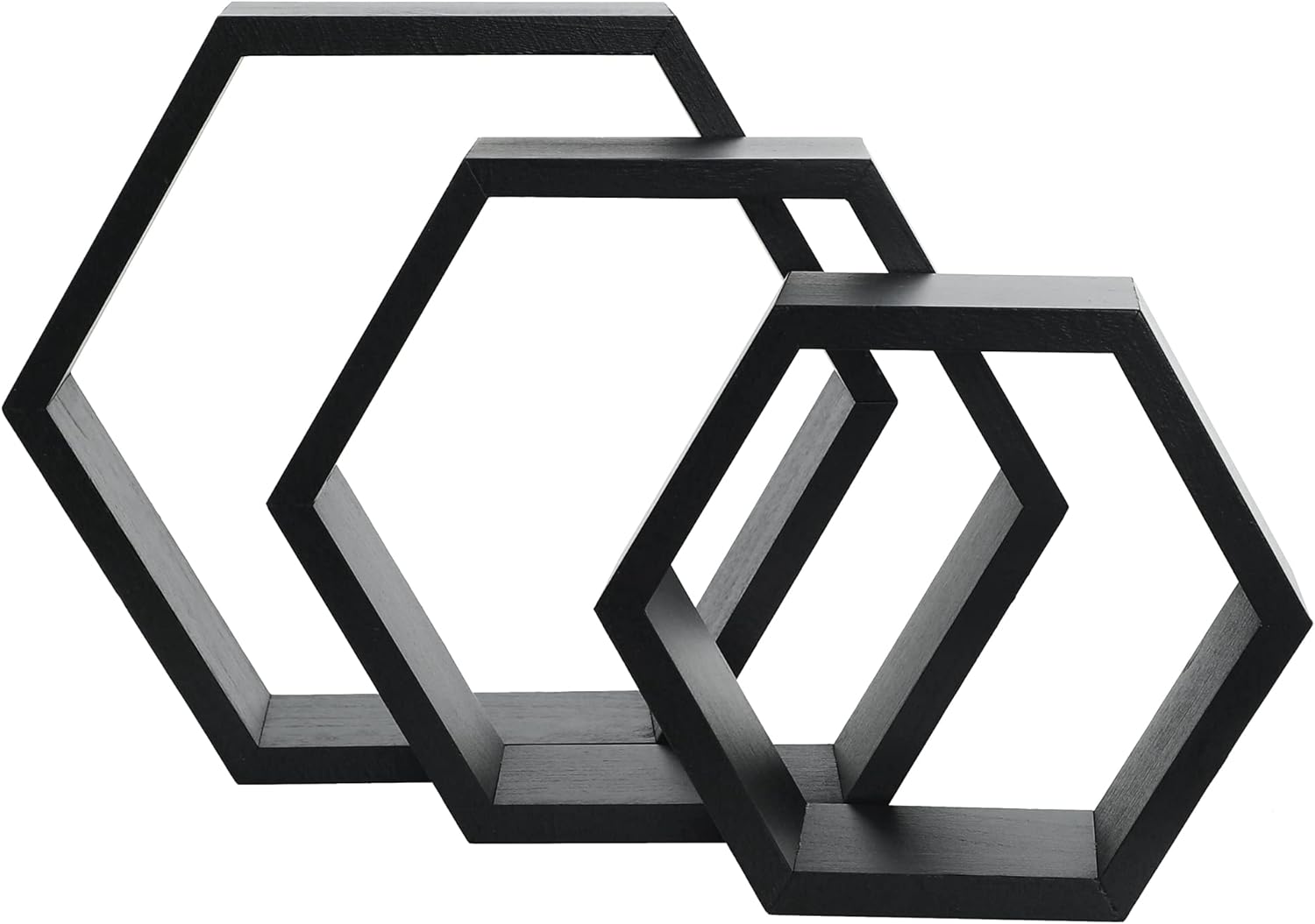 Eleganten komplet treh šestkotnih polic je idealna rešitev za sodobno ali rustikalno dekoracijo prostora. Narejene so iz pravega lesa, kar jim daje naraven videz in hkrati čvrsto konstrukcijo. Montaža je preprosta in hitra, saj je vse potrebno za namestitev že priloženo.