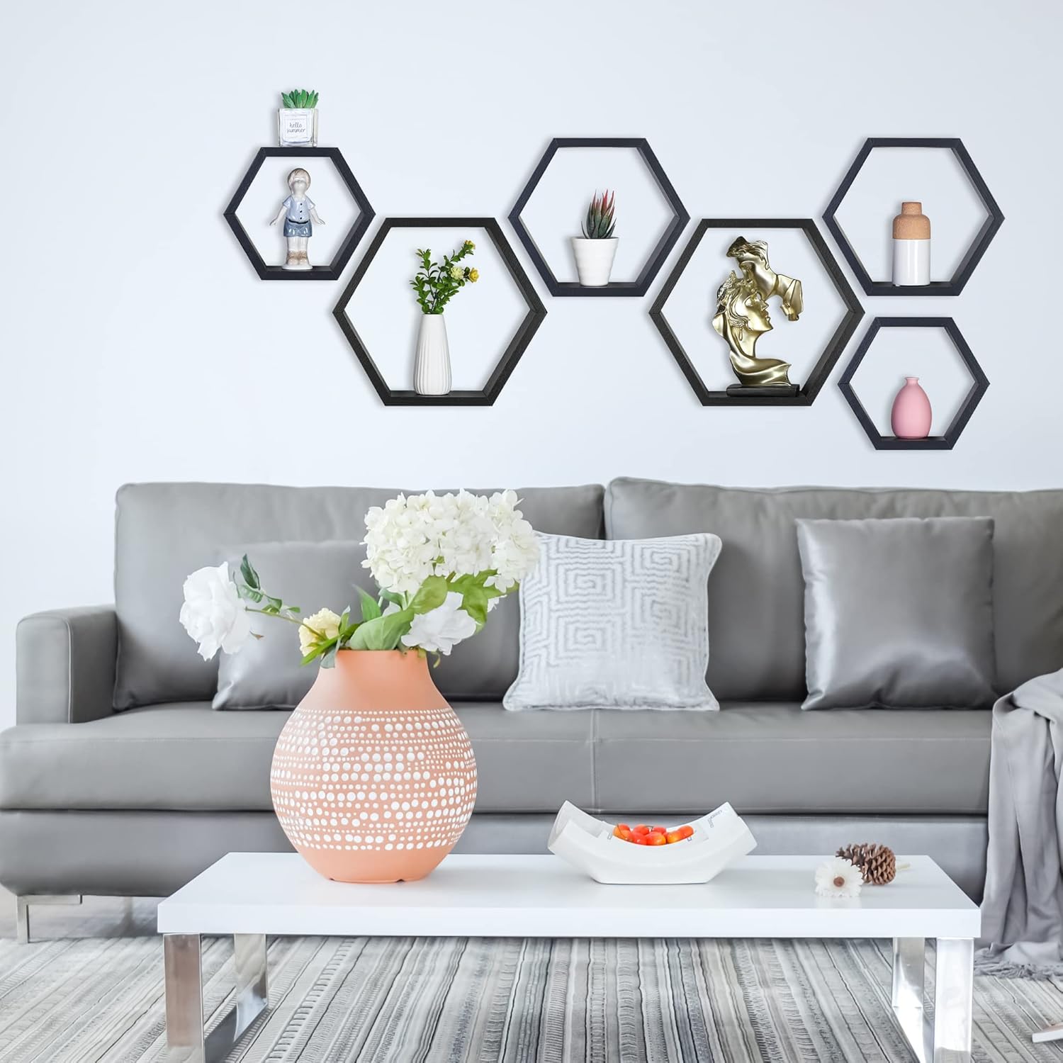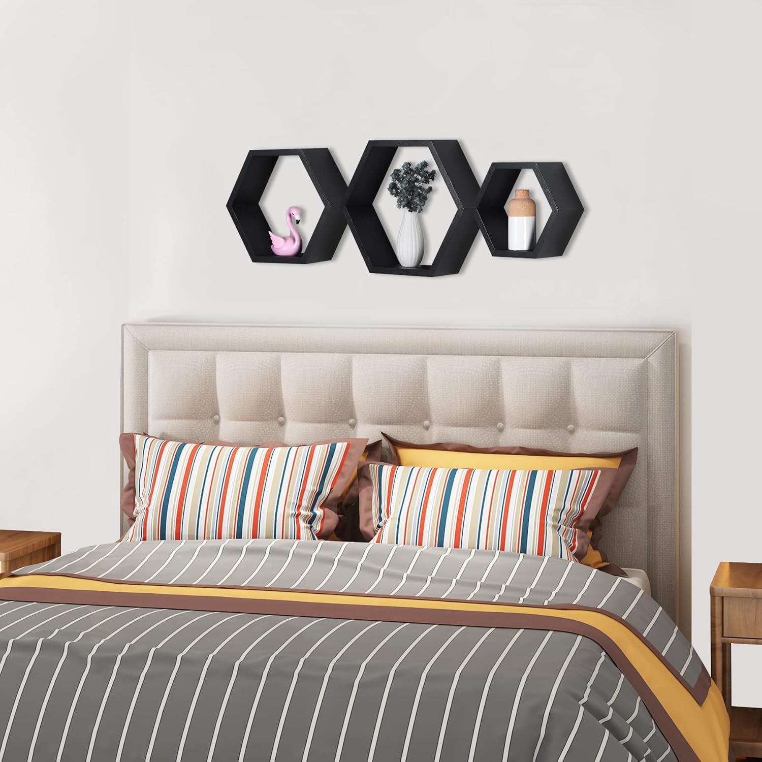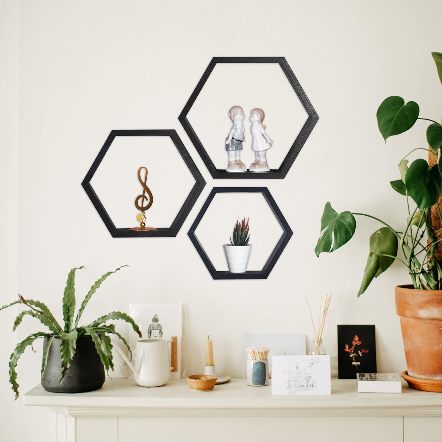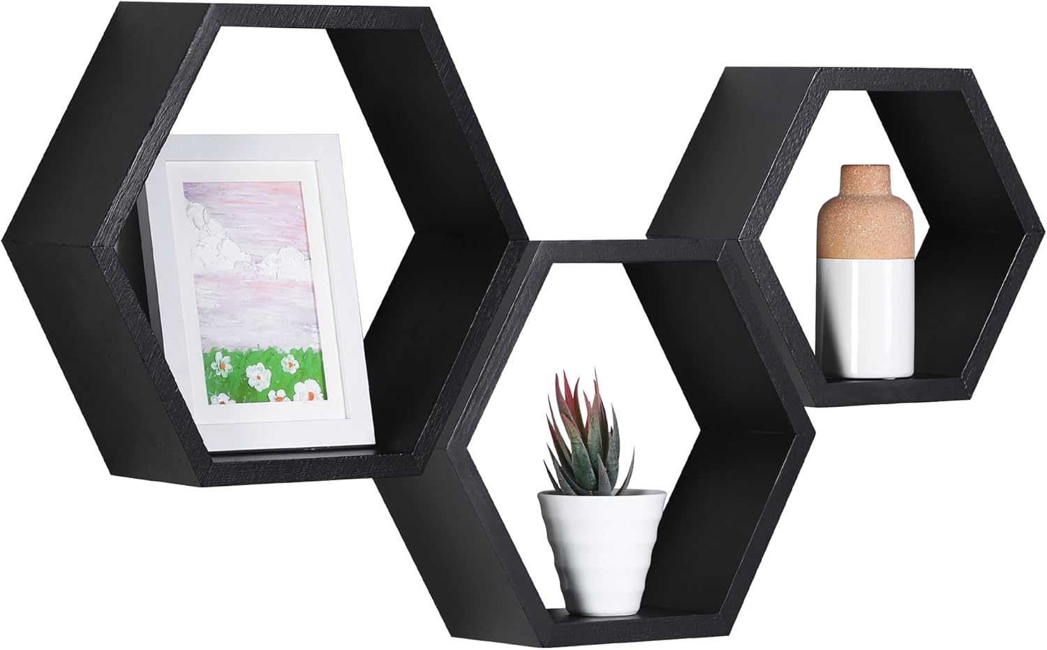 Eleganten komplet treh šestkotnih polic je idealna rešitev za sodobno ali rustikalno dekoracijo prostora. Narejene so iz pravega lesa, kar jim daje naraven videz in hkrati čvrsto konstrukcijo. Montaža je preprosta in hitra, saj je vse potrebno za namestitev že priloženo.