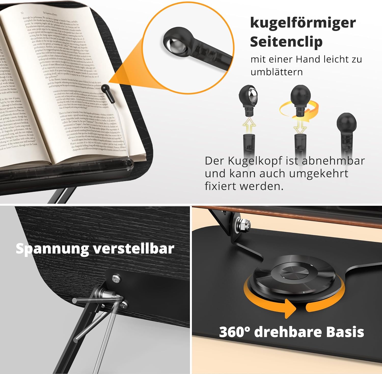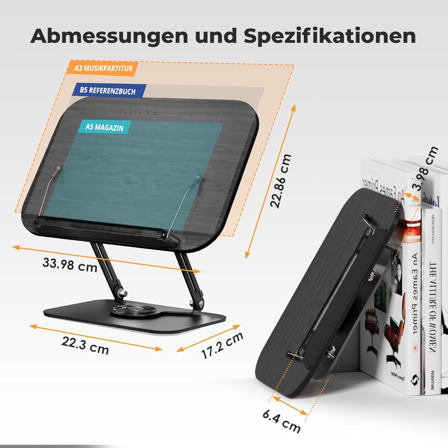 Elegantno, stabilno in popolnoma nastavljivo leseno stojalo poskrbi za udobno branje, kuhanje ali delo z elektronskimi napravami. Z vrtenjem za 360°, nastavljivo višino in trpežno konstrukcijo je popoln pripomoček za kuhinjo, pisarno, kabinet ali učilnico.