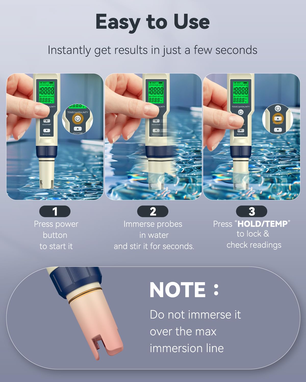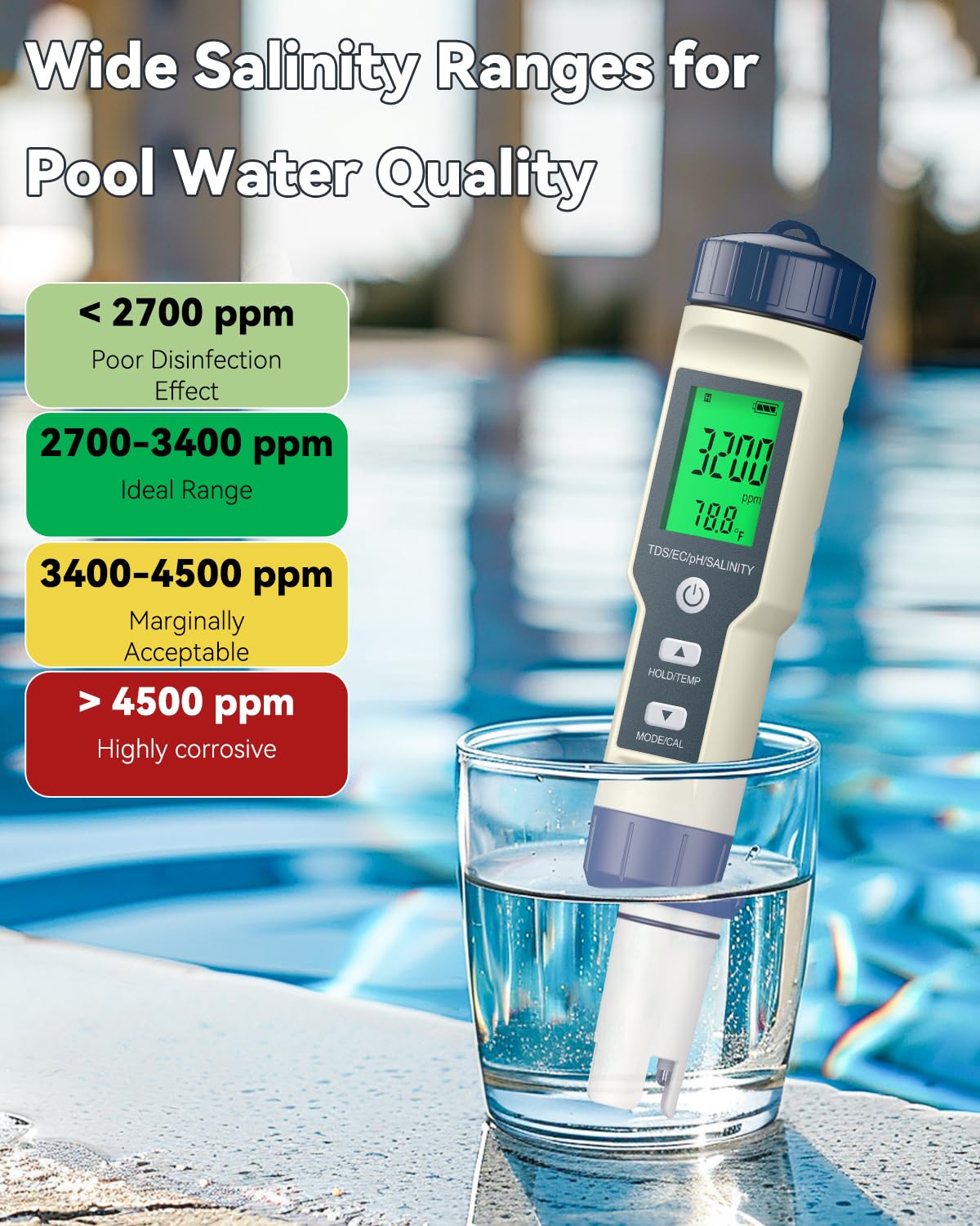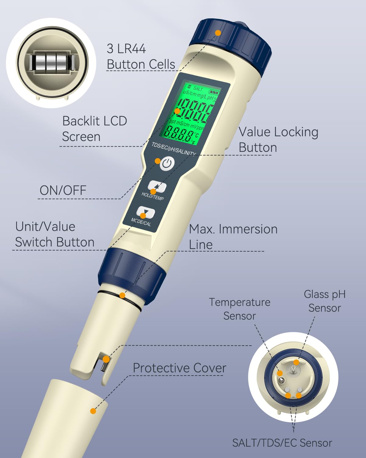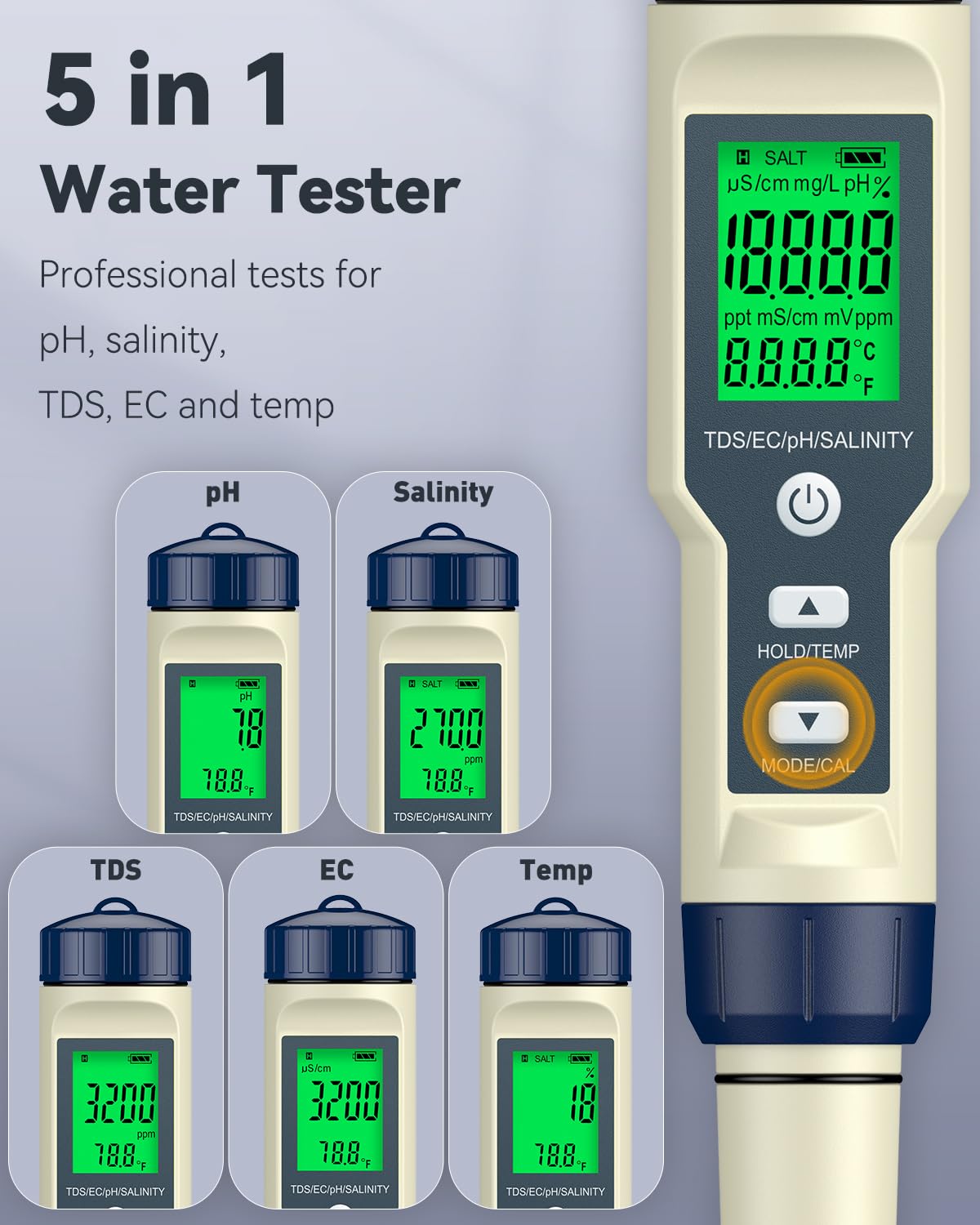 Digitalni merilnik vode za natančne meritve pH, slanosti, TDS, EC in temperature.