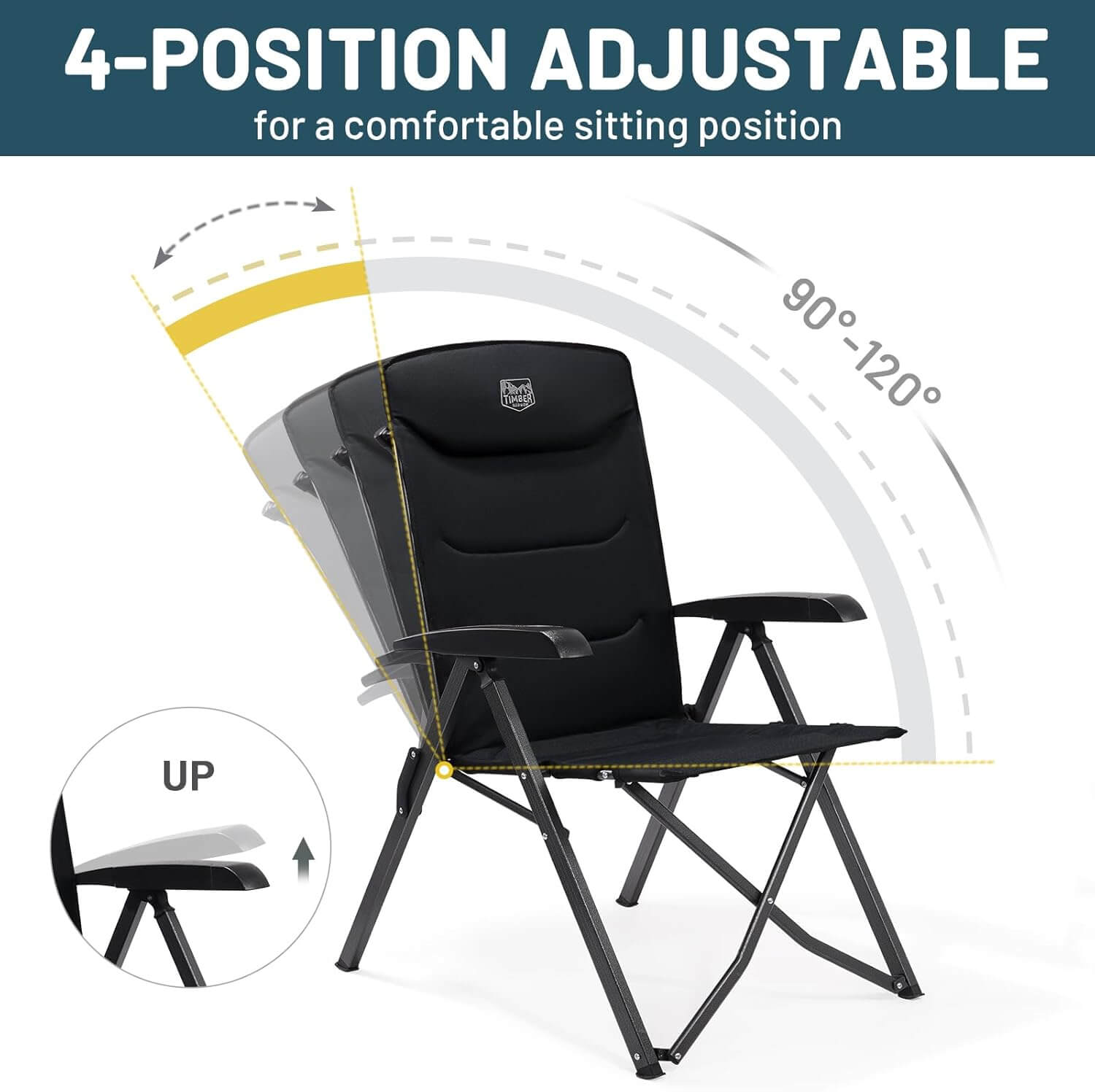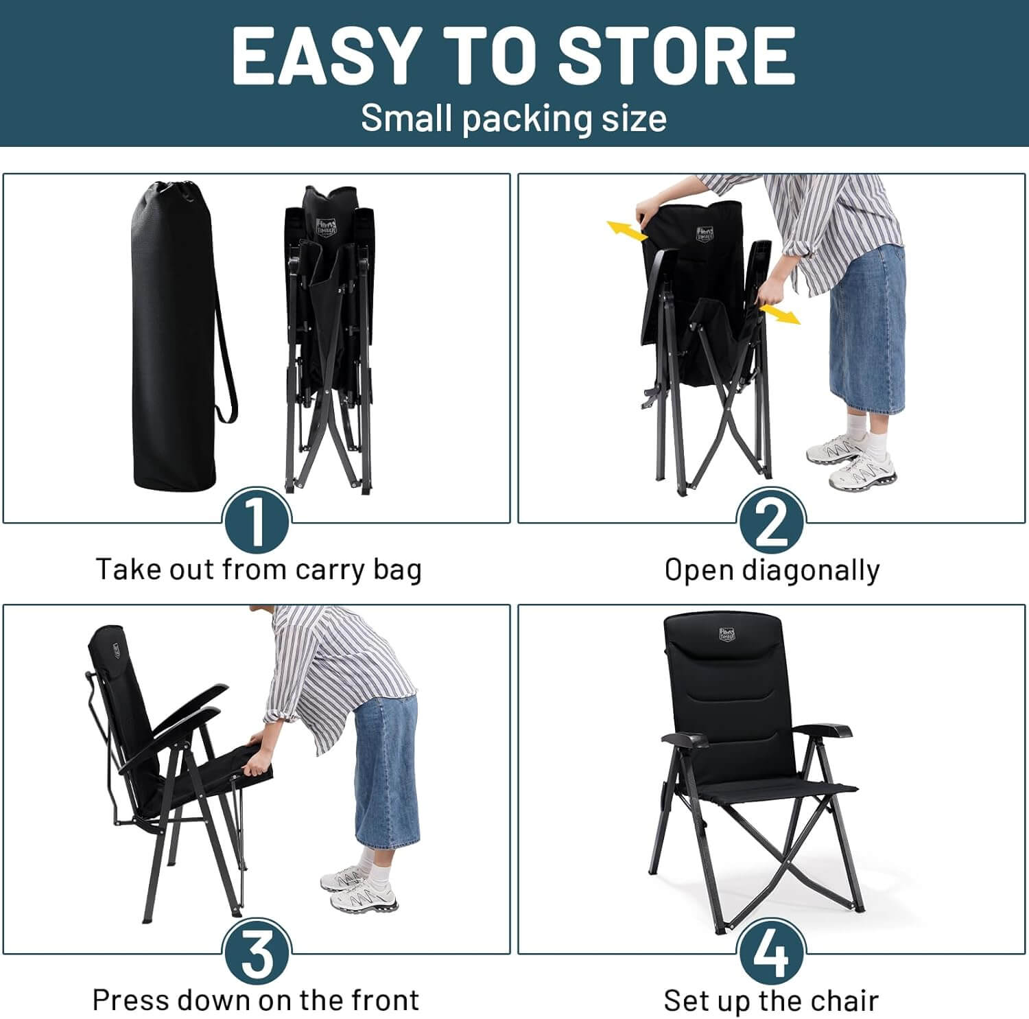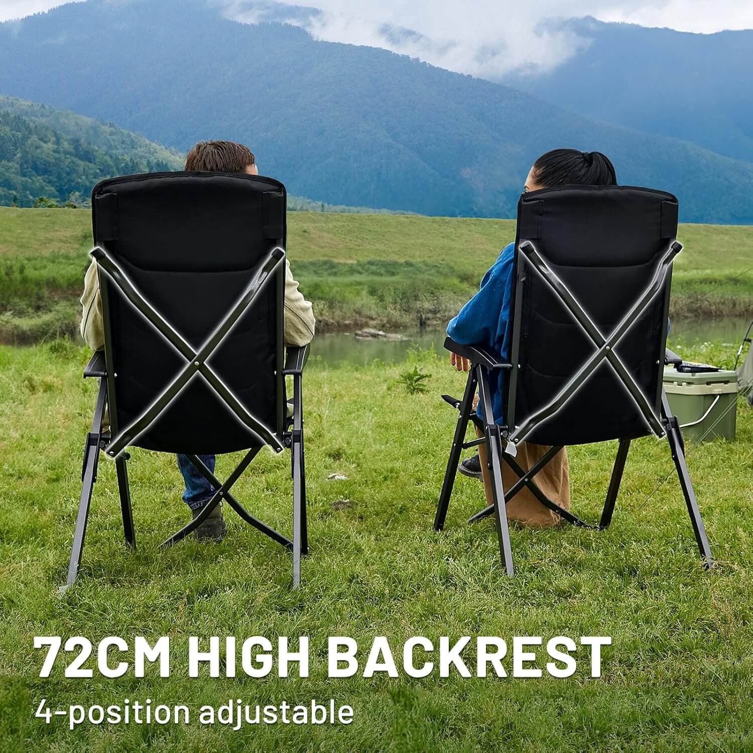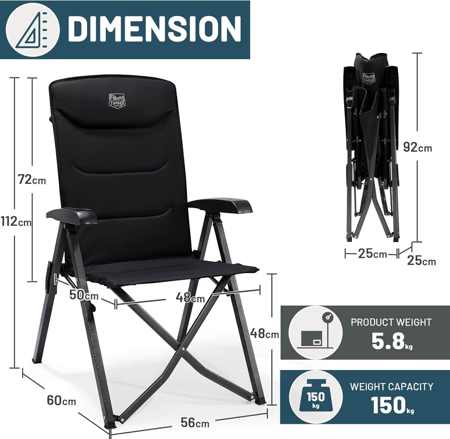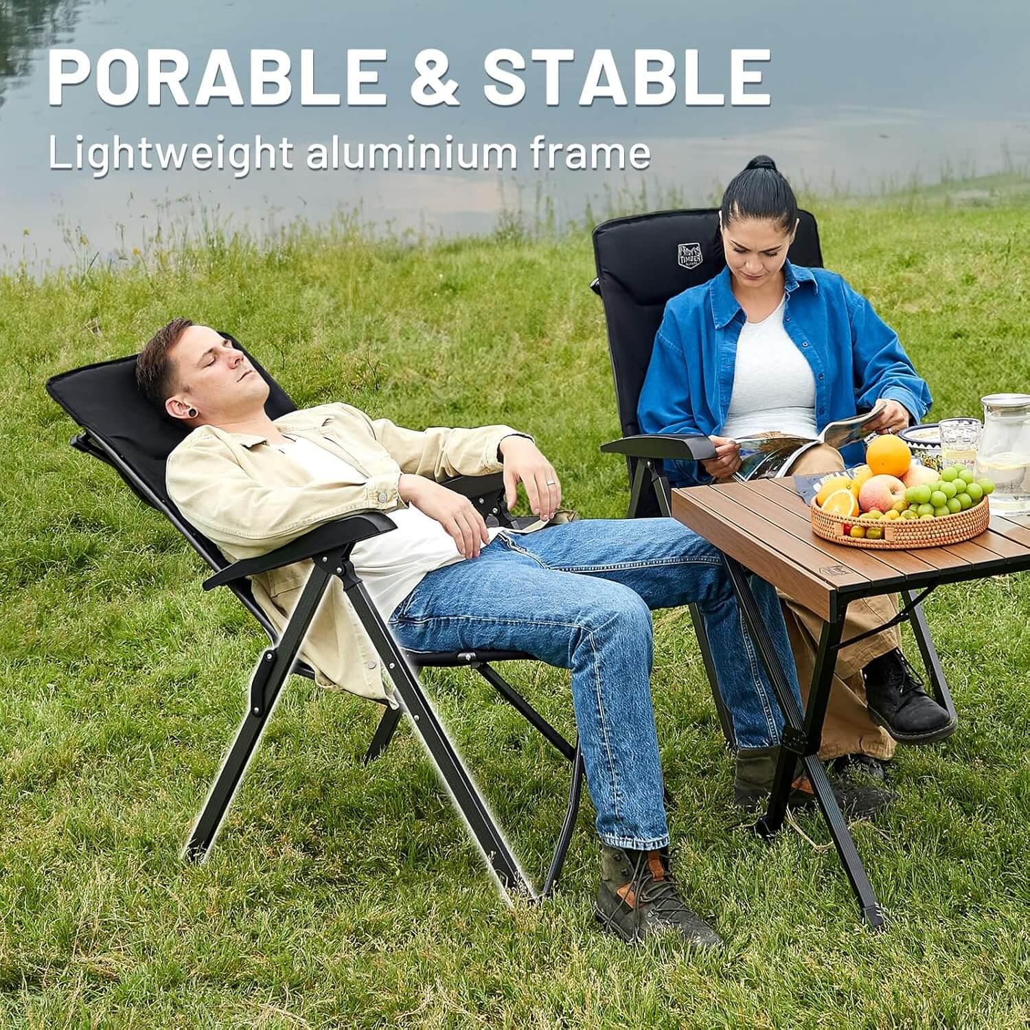 Prenosni kamp stol je robusten, izjemno udoben in zasnovan za vse, ki želijo visok naslon, debelo oblazinjenje ter možnost nagiba v štirih položajih. Zaradi močnega aluminijasto-železnega okvirja prenese do 150 kg, hkrati pa se zloži v kompaktno velikost in ga zlahka odneseš na vrt, balkon, piknik ali kampiranje.