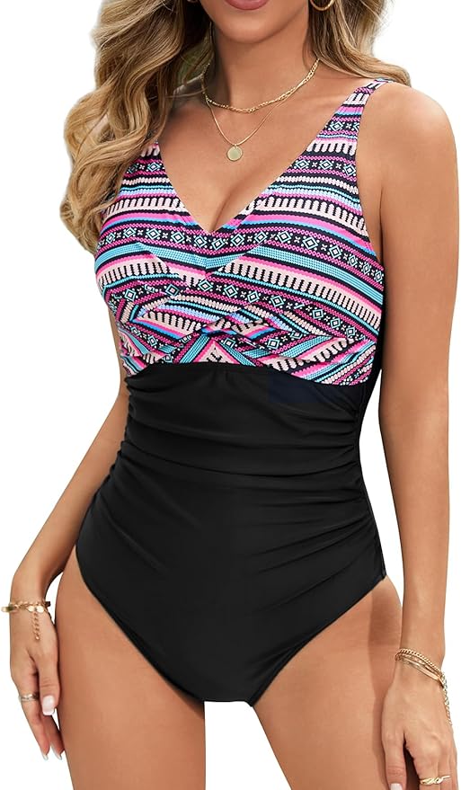 Eleganten V-izrez in križan, naguban zgornji del, ki poudari dekolte in ustvari retro videz.