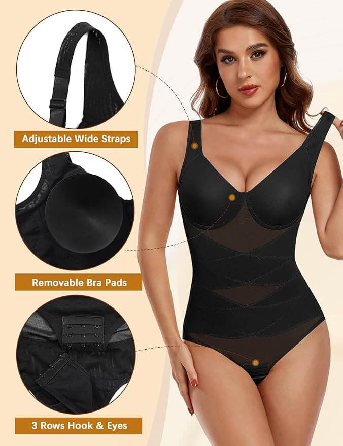 Eleganten, izjemno oblikovalen in hkrati zračen bodysuit, zasnovan za oblikovanje pasu, trebuha, prsi in zadnjice. S tremi plastmi mrežaste tkanine, snemljivimi blazinicami ter brezšivnim krojem poskrbi za gladko, samozavestno silhueto pod vsakim oblačilom.