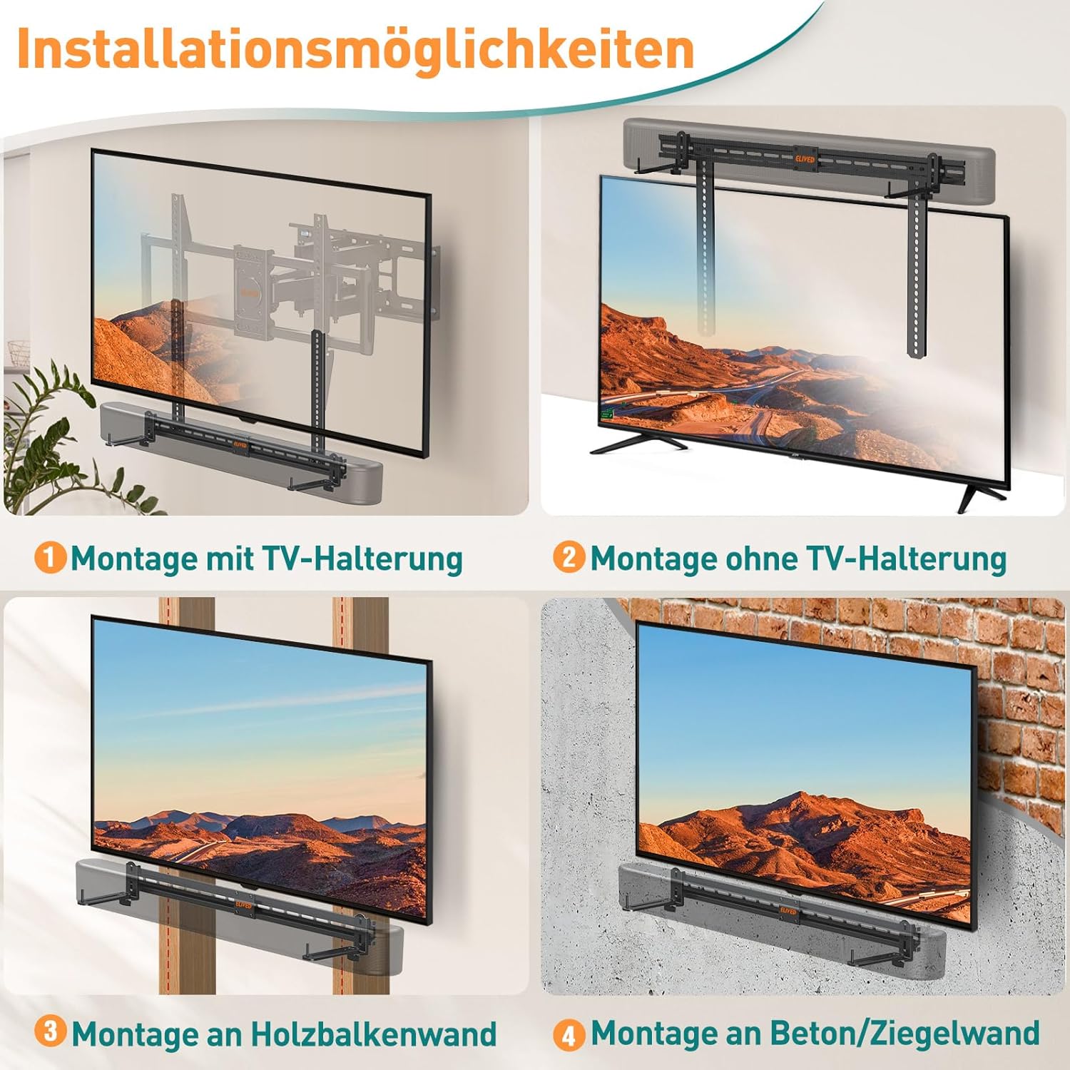 Univerzalni nosilec za Soundbar je primeren za modele z ali brez pritrdilnih lukenj do 6,8 kg. Prilagodljiva namestitev omogoča montažo na TV nosilec, nad TV, na leseno ali betonsko steno. Varna in stabilna konstrukcijazagotavlja trdno podporo brez tresljajev.