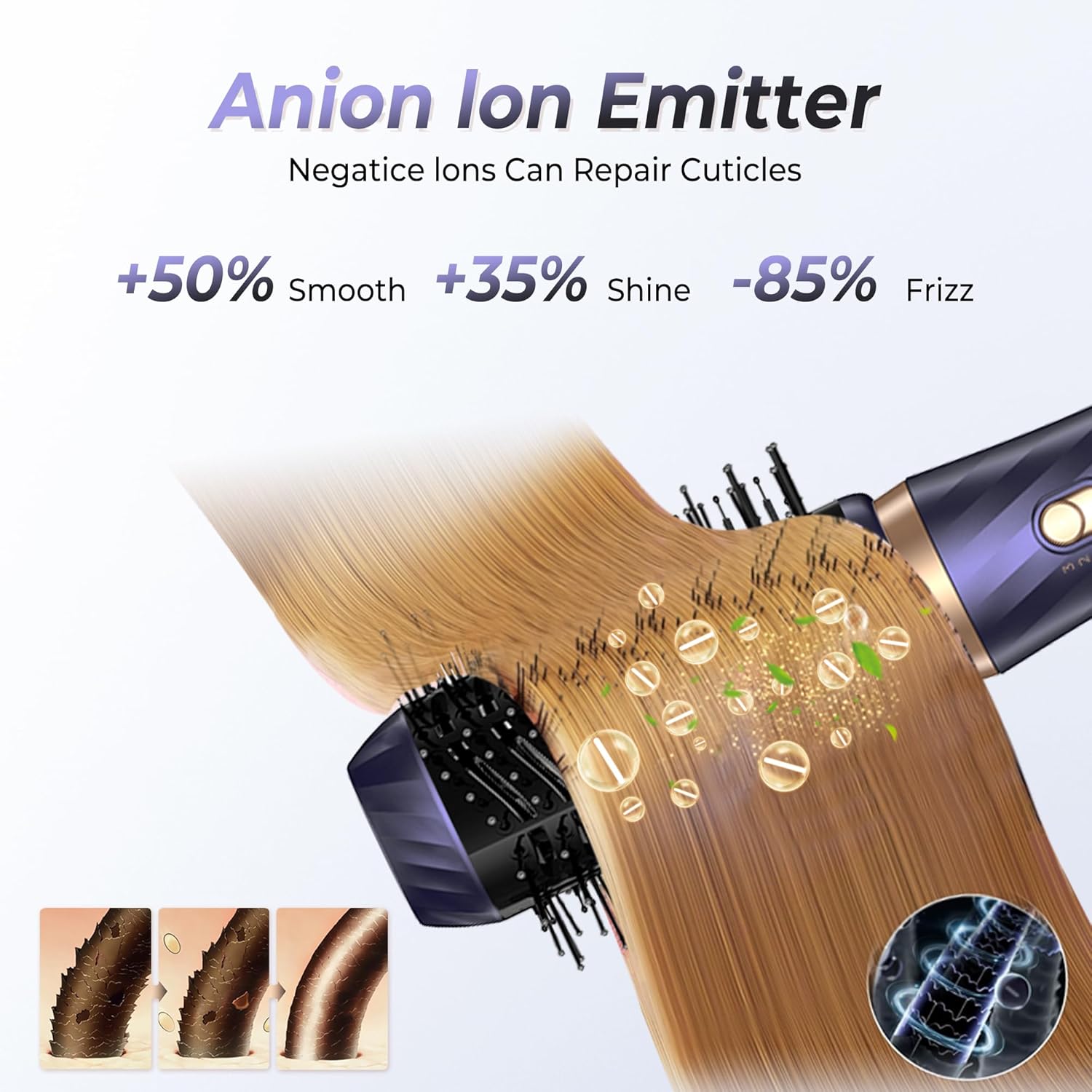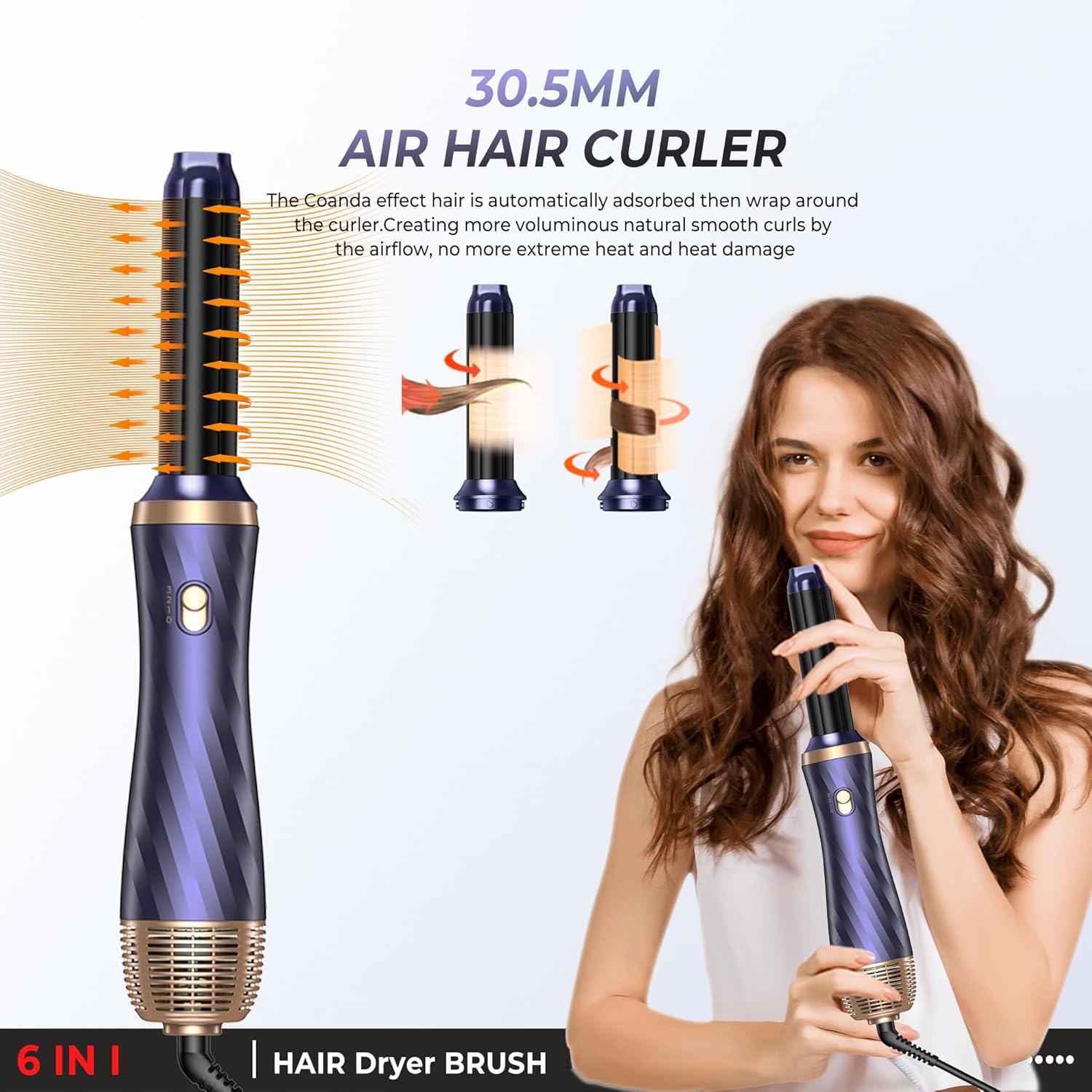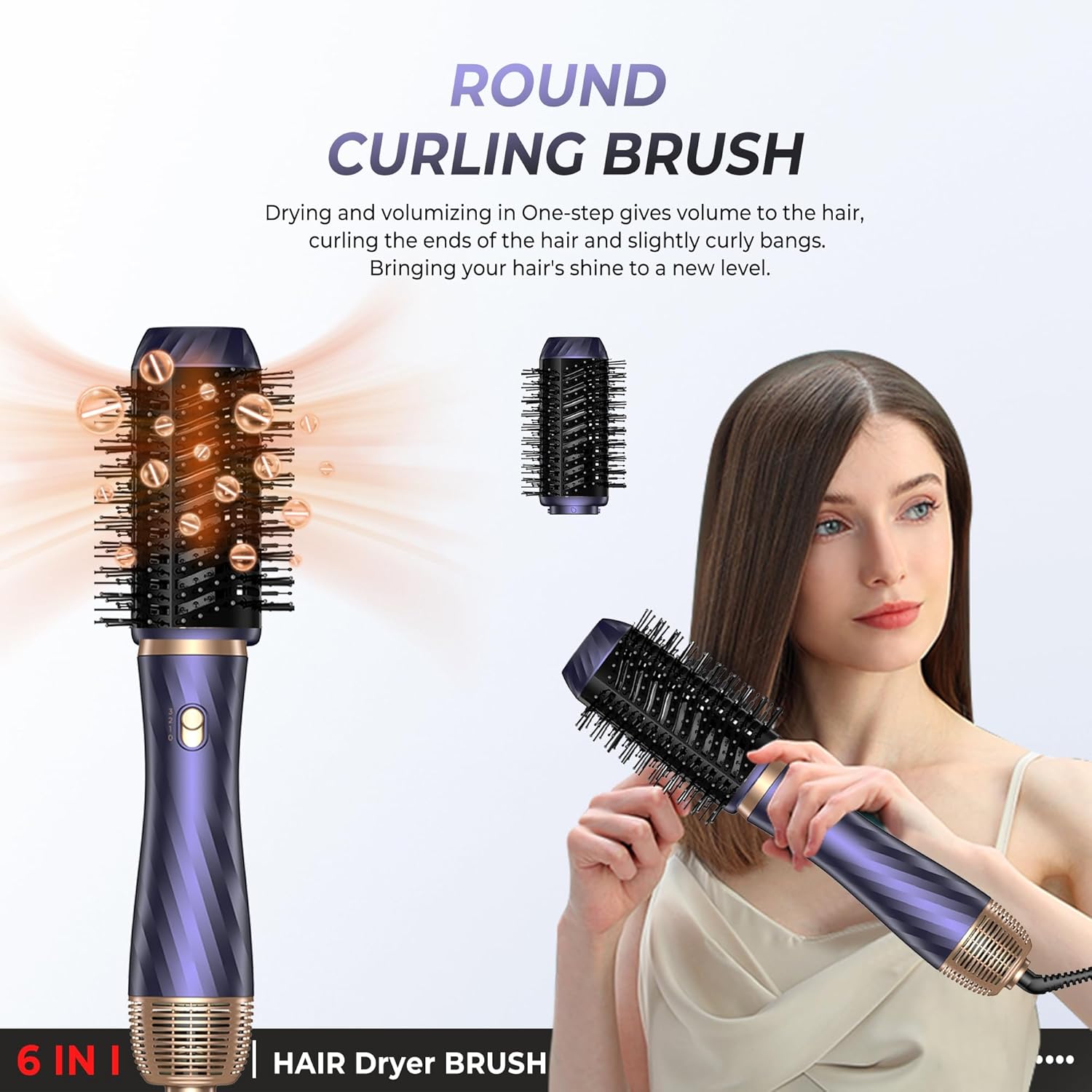 6-v-1 sušilnik in oblikovalnik las združuje sušenje, kodranje, ravnanje, volumiziranje in masažo lasišča v enem aparatu. Negativni ioni in keramična prevleka učinkovito zmanjšujejo naelektrenost las in zagotavljajo sijočo pričesko brez poškodb zaradi toplote. Priloženih je 6 različnih nastavkov, ki omogočajo enostavno ustvarjanje različnih pričesk.