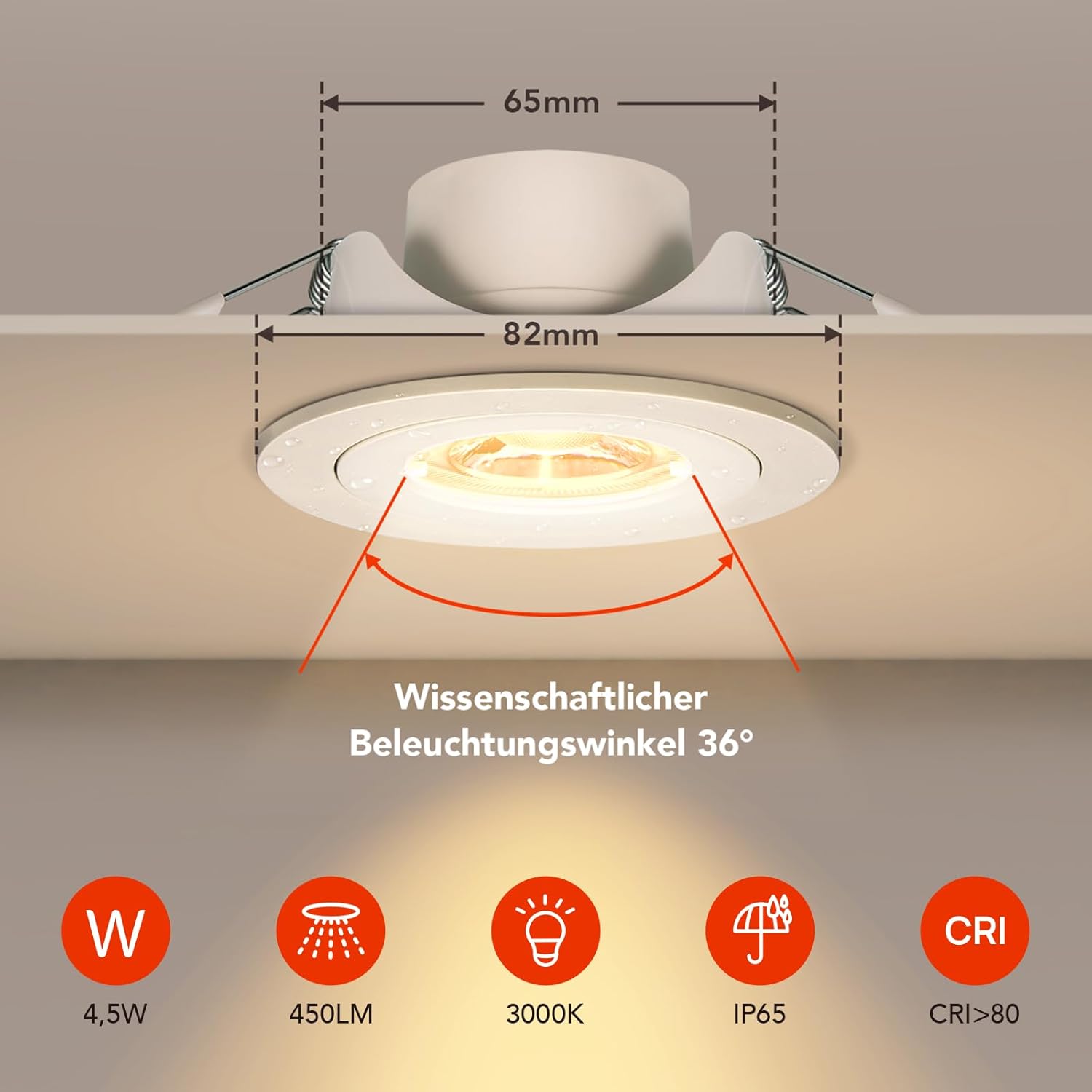 Vodoodporni LED reflektorji 6kos s toplo belo svetlobo (3000K) in ozkim svetlobnim snopom (36°)idealno osvetli kopalnice in vlažne prostore. IP65 zaščita zagotavlja varno uporabo celo v tuš kabinah, medtem ko energijsko varčna zasnova (4.5W, 450lm) prihrani do 90% stroškov. Enostavna serijska namestitev s patentiranim pritrdilnim sistemom omogoča hitro vgradnjo brez dodatnih orodij.