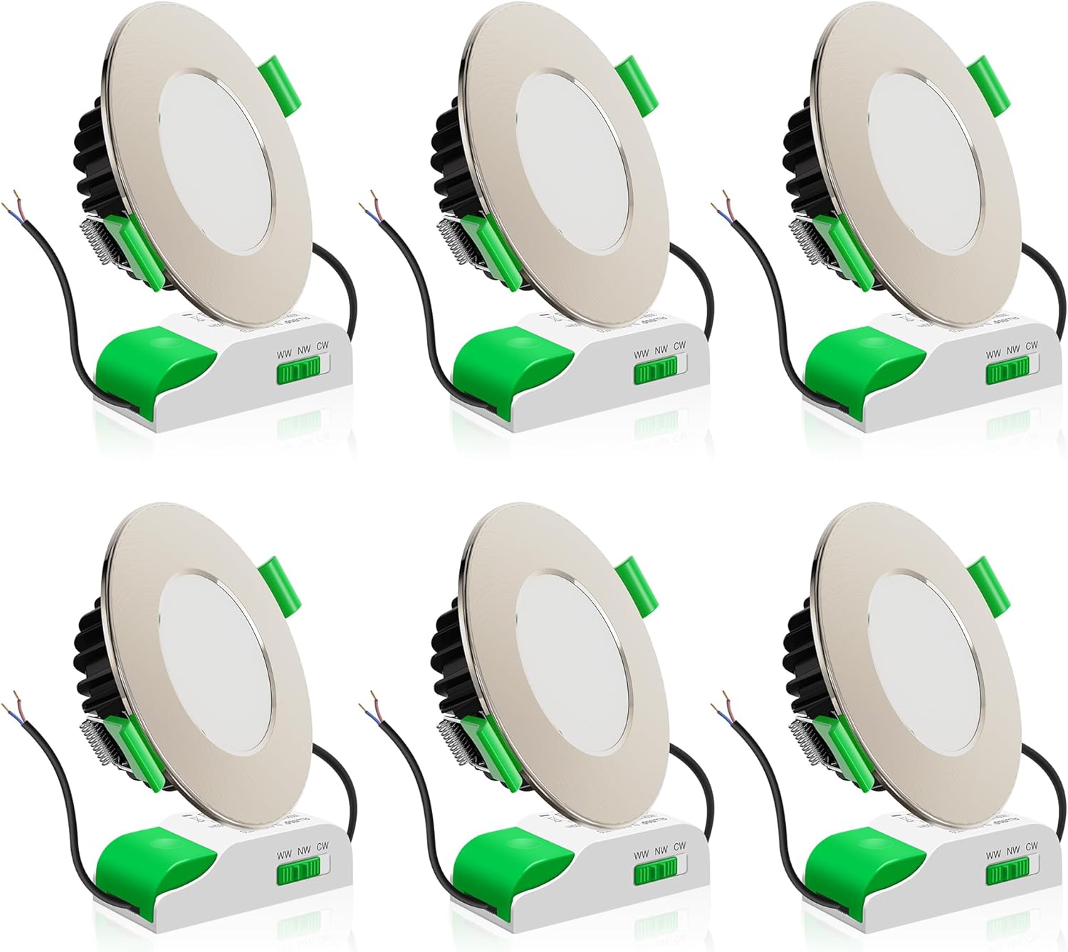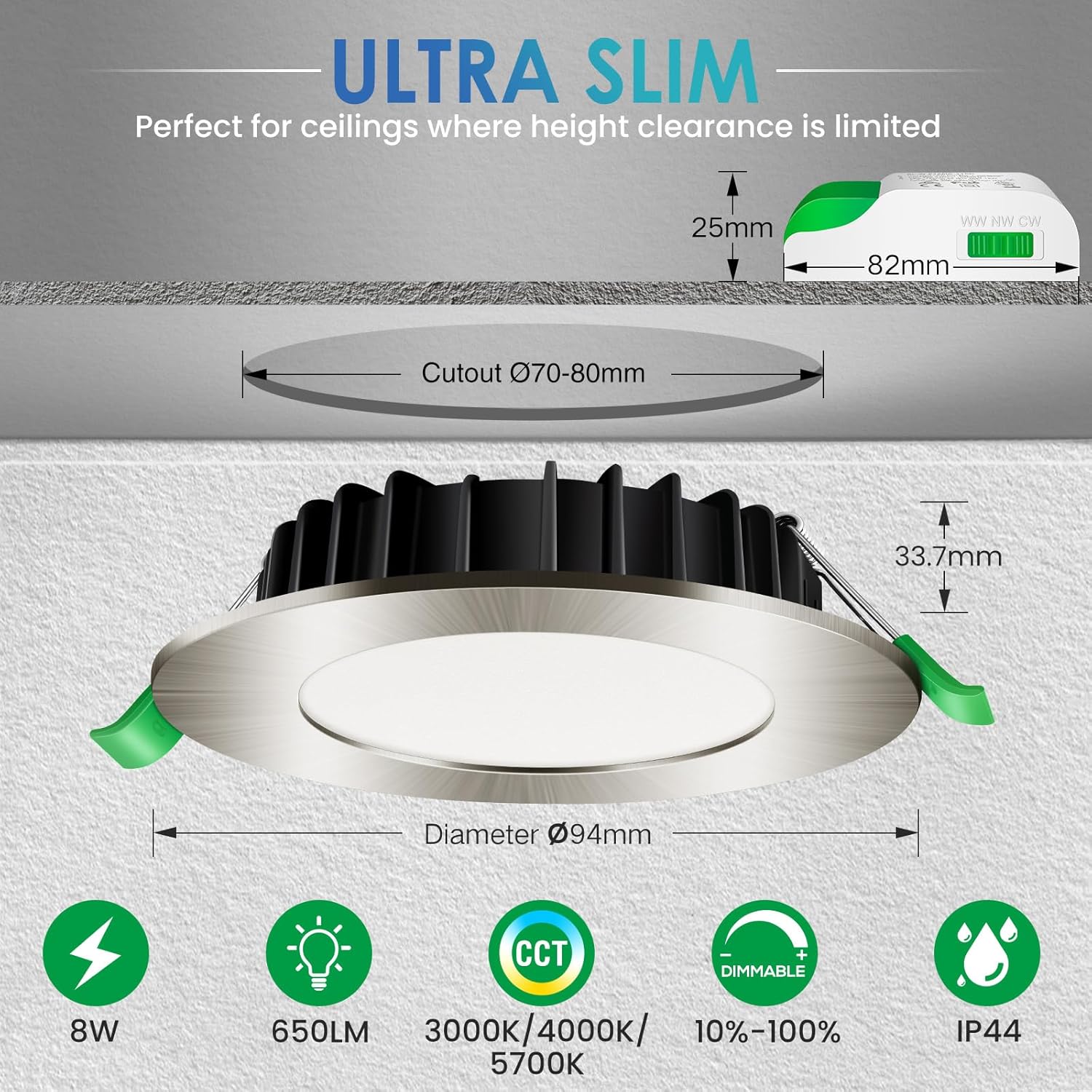 Vgradni LED spoti z nastavljivo barvno temperaturo (3000K, 4000K, 5700K) omogočajo prilagodljivo osvetlitev. Zaradi vodoodpornosti IP44 so primerni za kopalnice, kuhinje in druge vlažne prostore. Energijsko varčni z življenjsko dobo do 30.000 ur in dimmable funkcijo za nastavitev svetlosti.