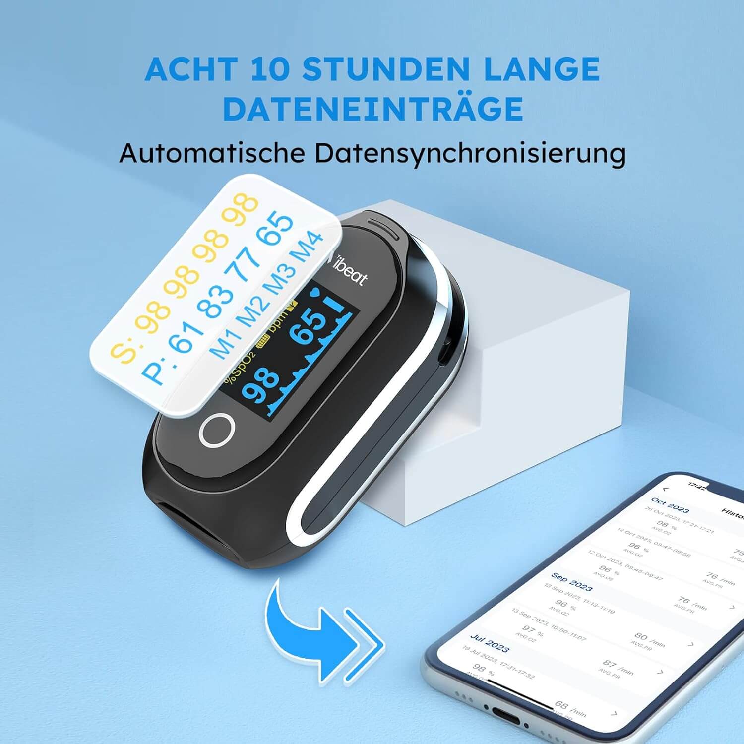 Napreden pulzni oksimeter omogoča neprekinjeno merjenje kisika v krvi in srčnega utripa, idealno za spremljanje med spanjem, športom ali vsakodnevno uporabo. Z vgrajeno polnilno baterijo deluje do 24 ur z eno polnitvijo, podatke pa shranjuje v notranji pomnilnik. Jasni zasloni s štirimi smermi prikaza omogočajo enostavno branje iz kateregakoli kota.