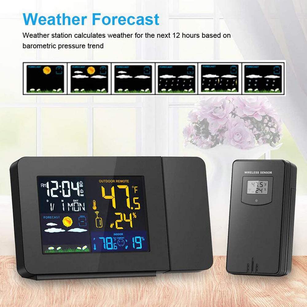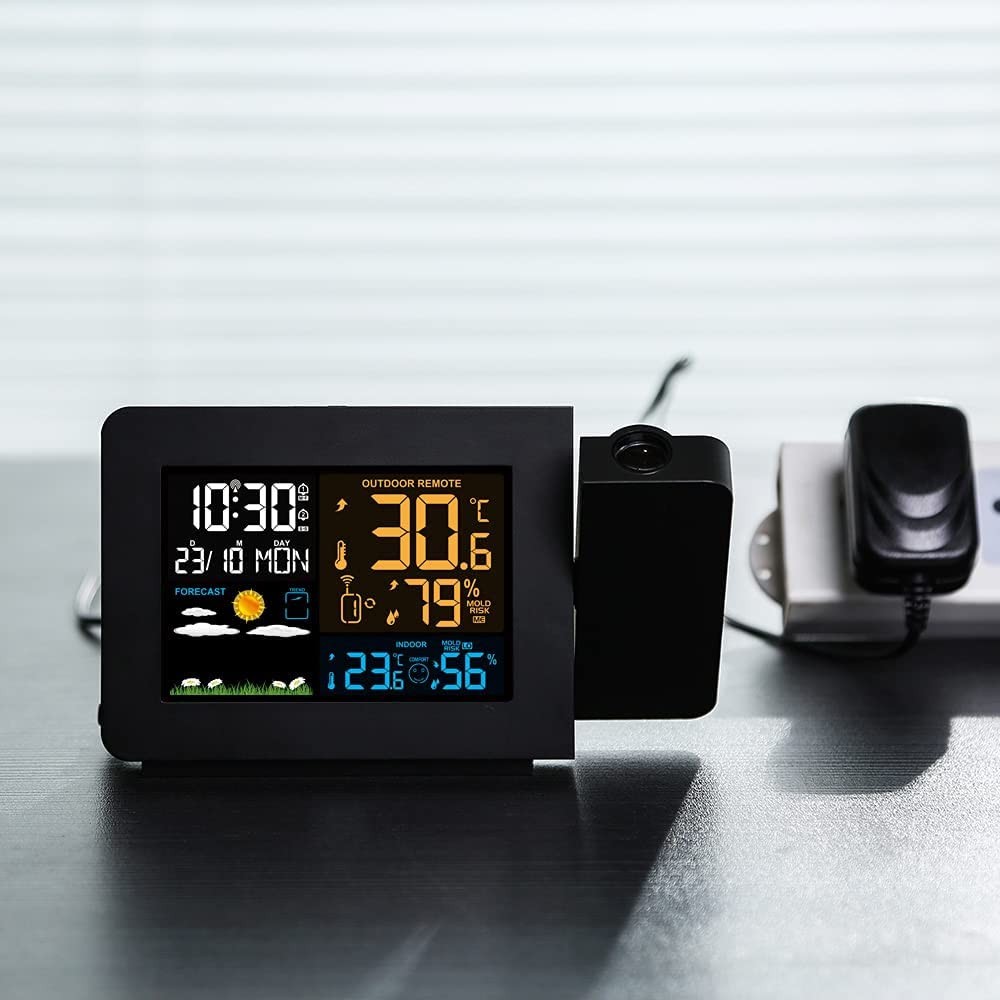 Napredna brezžična vremenska postaja združuje funkcije termometra, higrometra, radijske ure in projektorja. Zagotavlja natančne podatke o notranji in zunanji temperaturi, vlagi ter vremenski napovedi, obenem pa omogoča projekcijo ure na steno ali strop. Idealen pripomoček za dom, pisarno ali vrt.