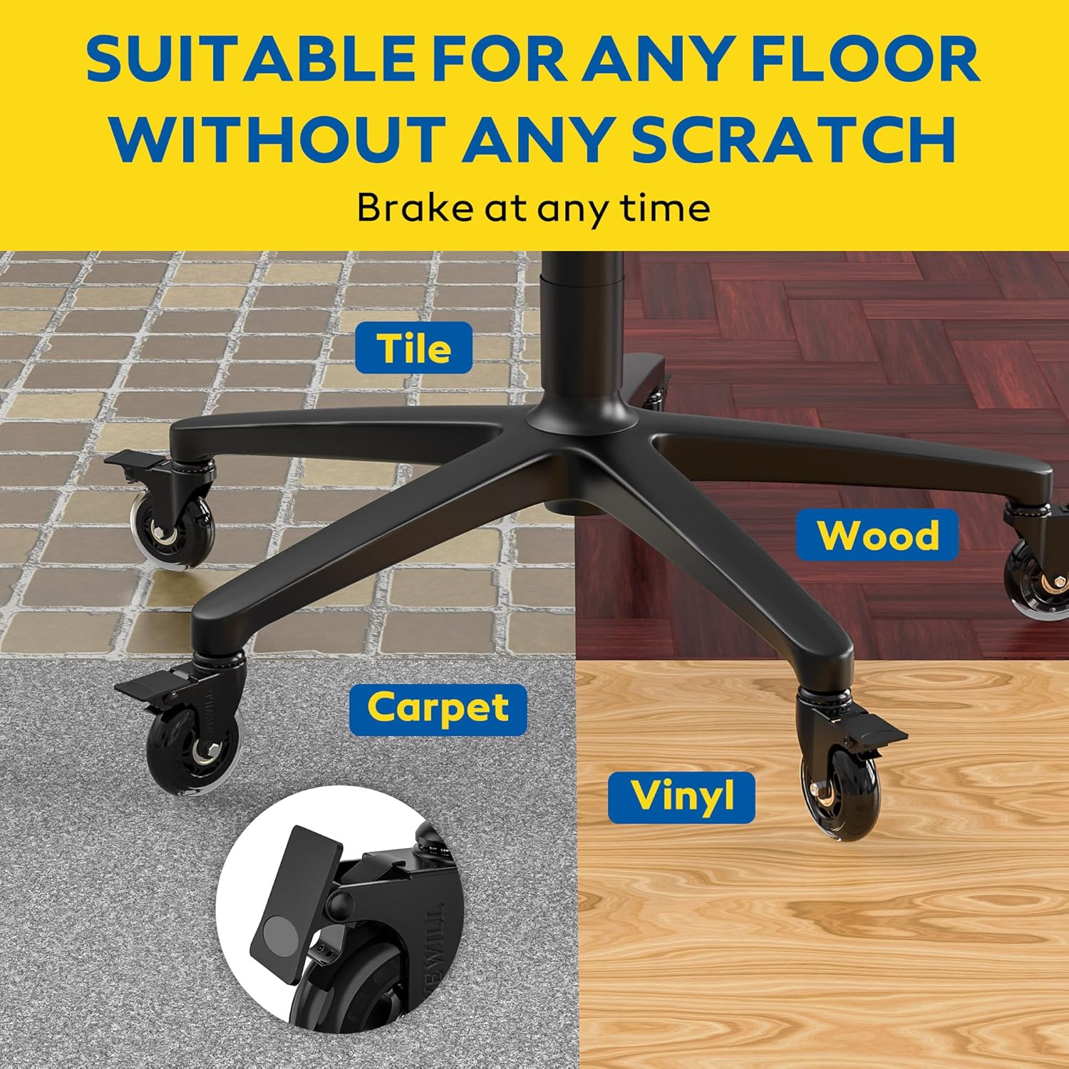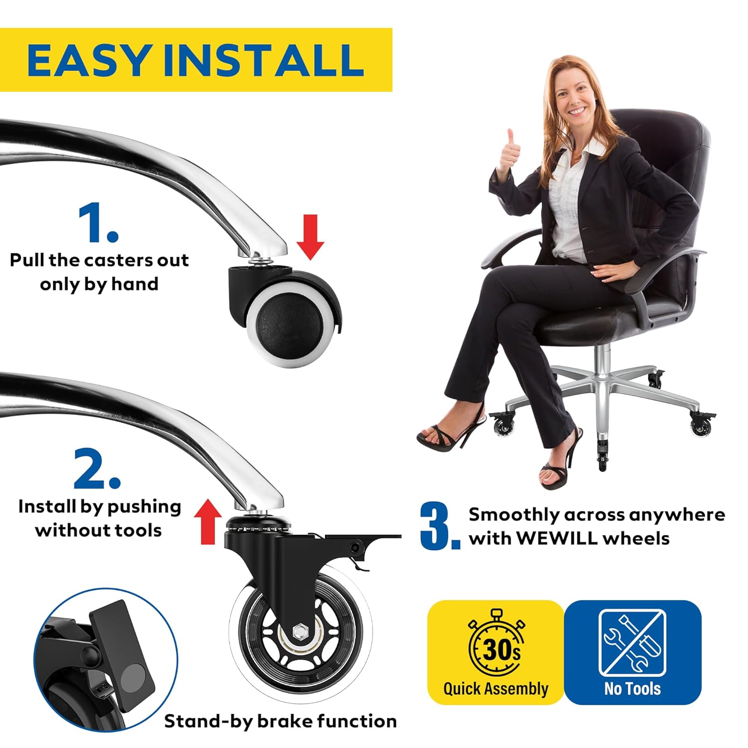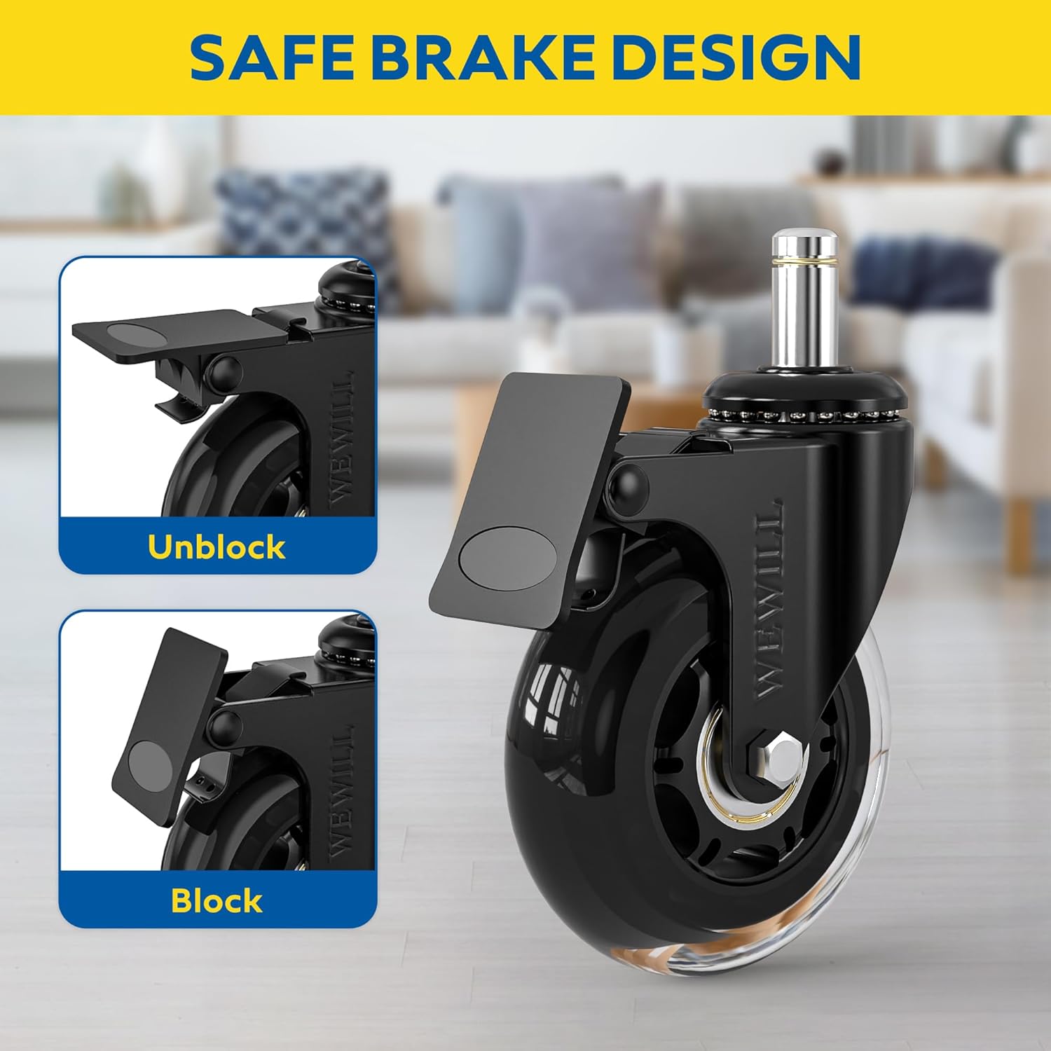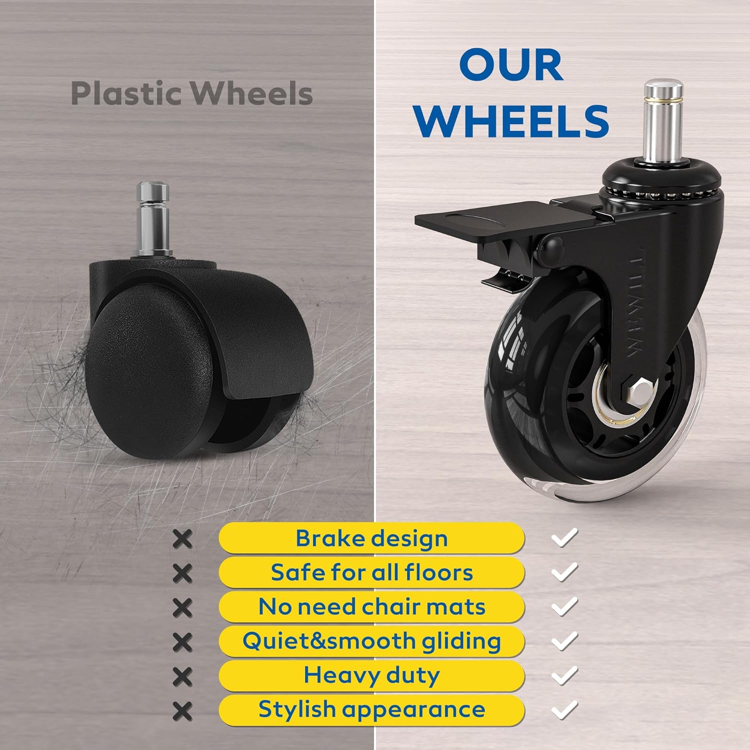 Kakovosten komplet petih zavornih koles WEWILL je zasnovan za enostavno zamenjavo standardnih koleščkov na pisarniških stolih. Izdelana so iz trpežnega jekla in poliuretana, zagotavljajo tiho drsenje brez prask in popolno zaščito talnih površin, vključno z lesom, laminatom in ploščicami.