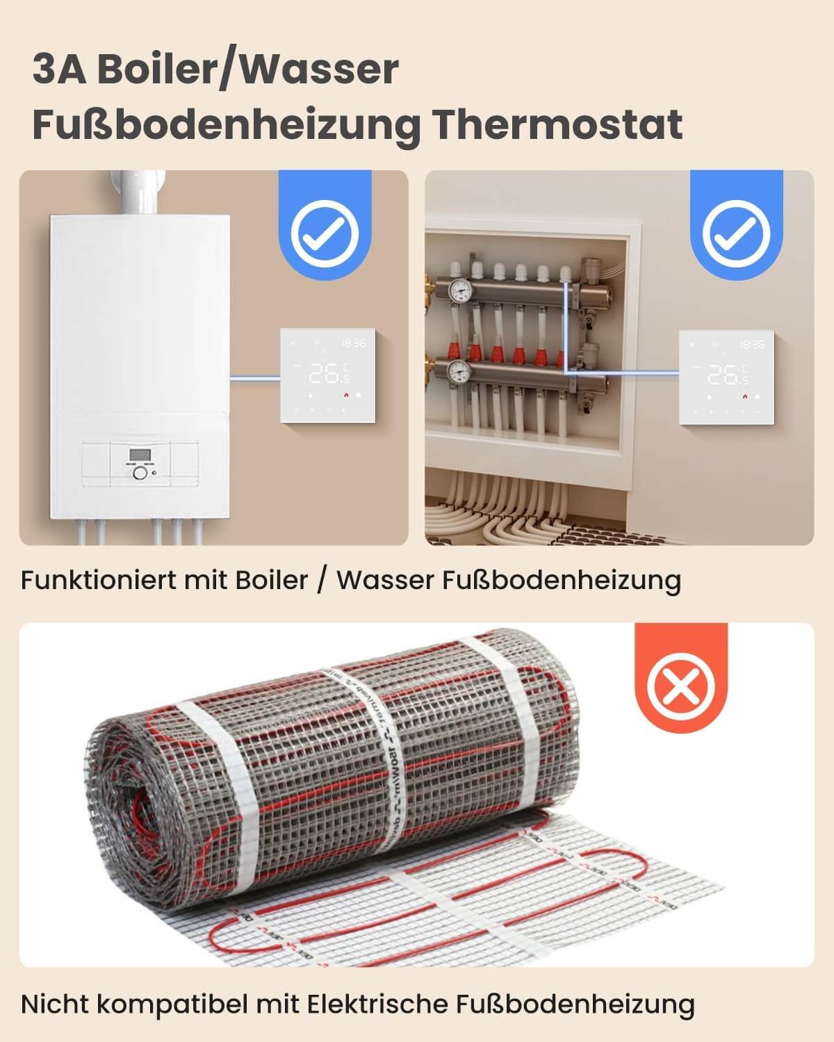 Združljivost s kotli in vodnim talnim ogrevanjem: Termostat upravlja odpiranje in zapiranje aktuatorjev na razdelilniku vode ali plinskem kotlu za energetsko učinkovito in udobno ogrevanje. Termostat vključuje potencialno nevtralne kontakte za povezavo z kotlom (brez napetosti).