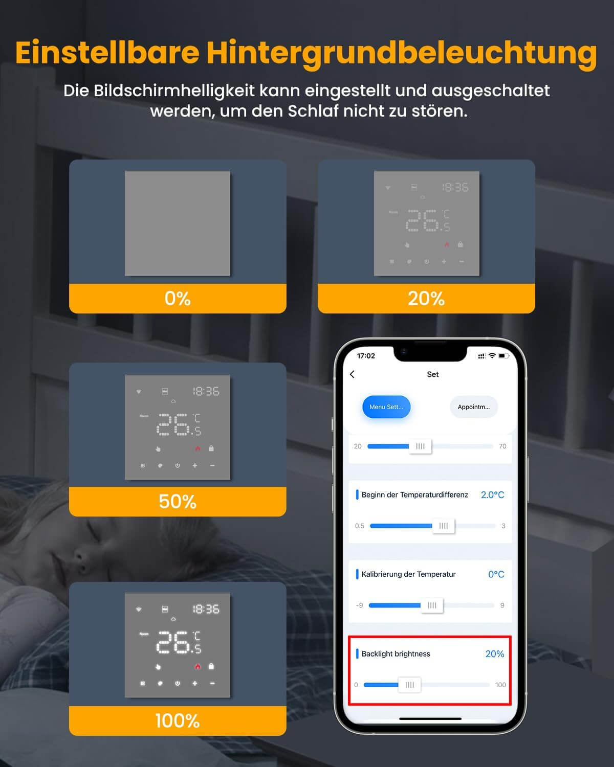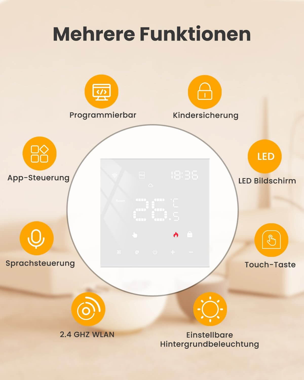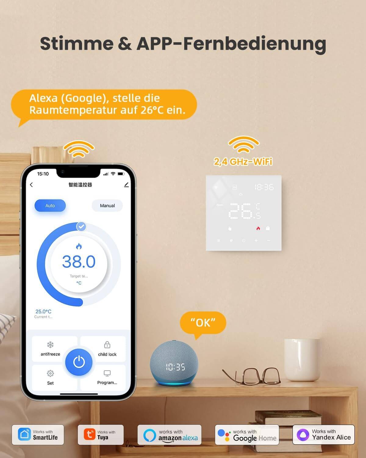 Daljinsko upravljanje in glasovni ukazi: Povežite termostat z omrežjem 2.4G WiFi in ga upravljajte na daljavo preko pametnega telefona. Prek aplikacije lahko nastavljate temperaturo, urnike in napredne nastavitve. Glasovni ukazi omogočajo priročno vklapljanje in izklapljanje.