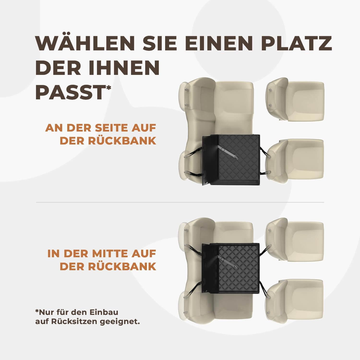 Enostavna in hitra namestitev: Montaža traja le nekaj trenutkov – sedež se preprosto pritrdi na zadnji sedež, ojačitvene palice pa se lahko po potrebi odstranijo.