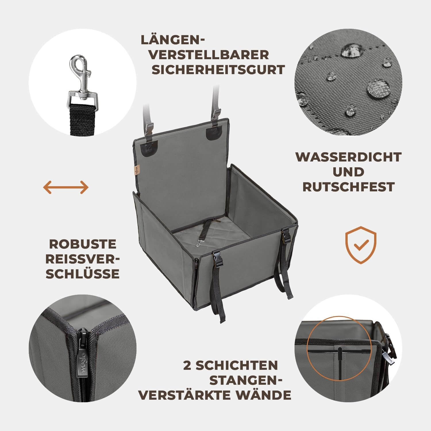 Ojačane stene: 4 vodoravne in 4 navpične ojačitve zagotavljajo čvrsto obliko sedeža – pes se počuti stabilno in varno tudi med vožnjo po ovinkih.