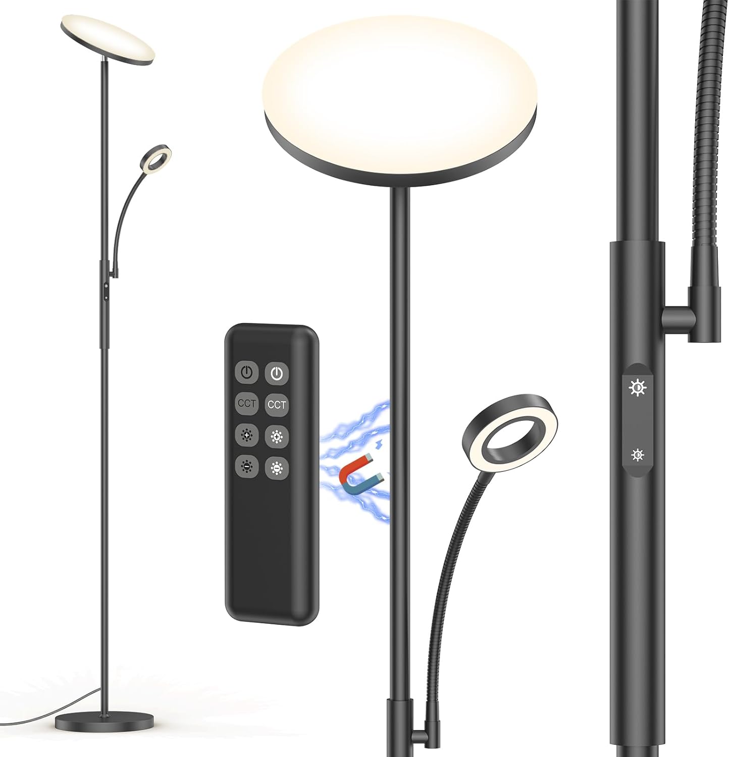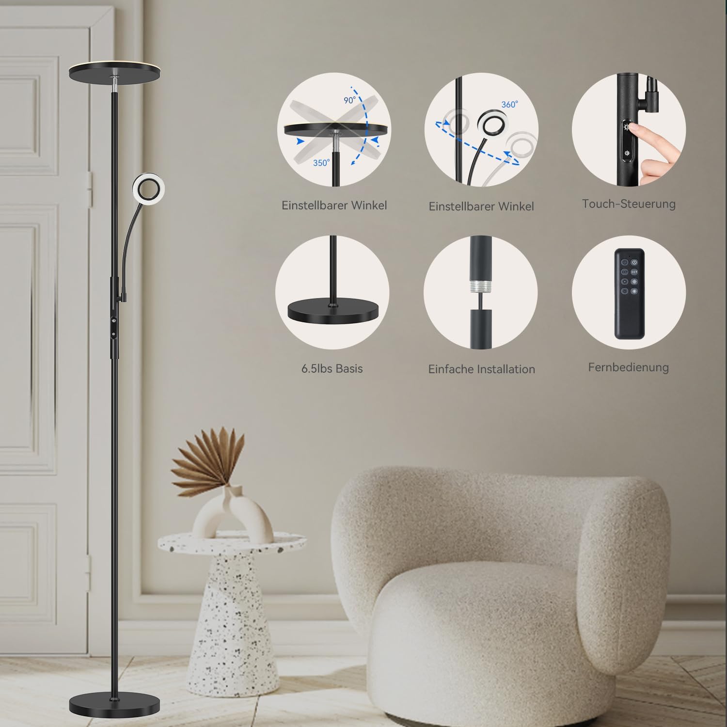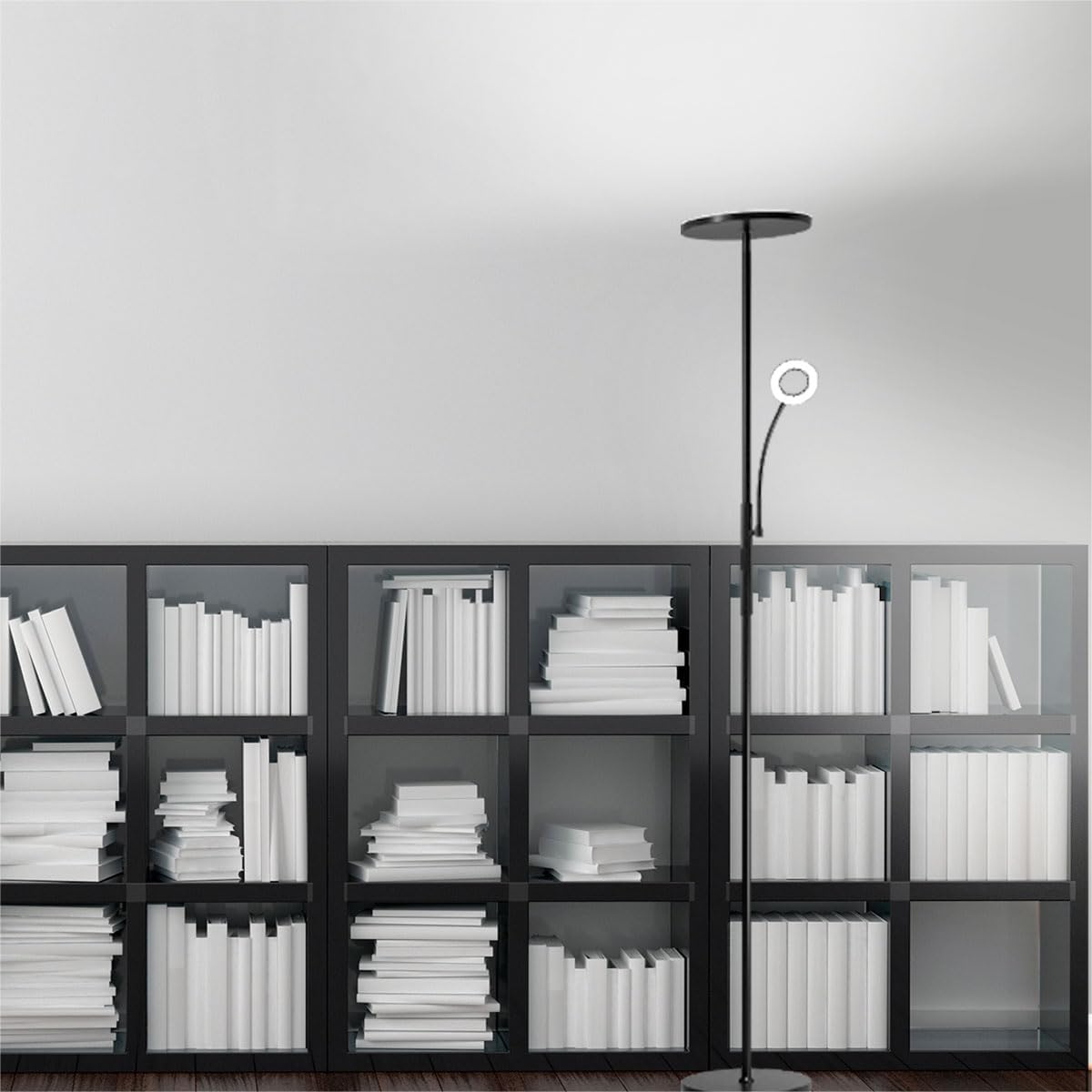 Elegantna stoječa svetilka z možnostjo zatemnitve nudi štiri barvne temperature od 3000 K do 6000 K in prilagodljivo svetilnost od 5 % do 100 %. Opremljena je z daljinskim upravljalnikom in touch nadzorom ter si zapomni zadnje nastavitve. Njena stabilna konstrukcija in visoka energijska učinkovitost omogočata varno uporabo in dolgo življenjsko dobo.