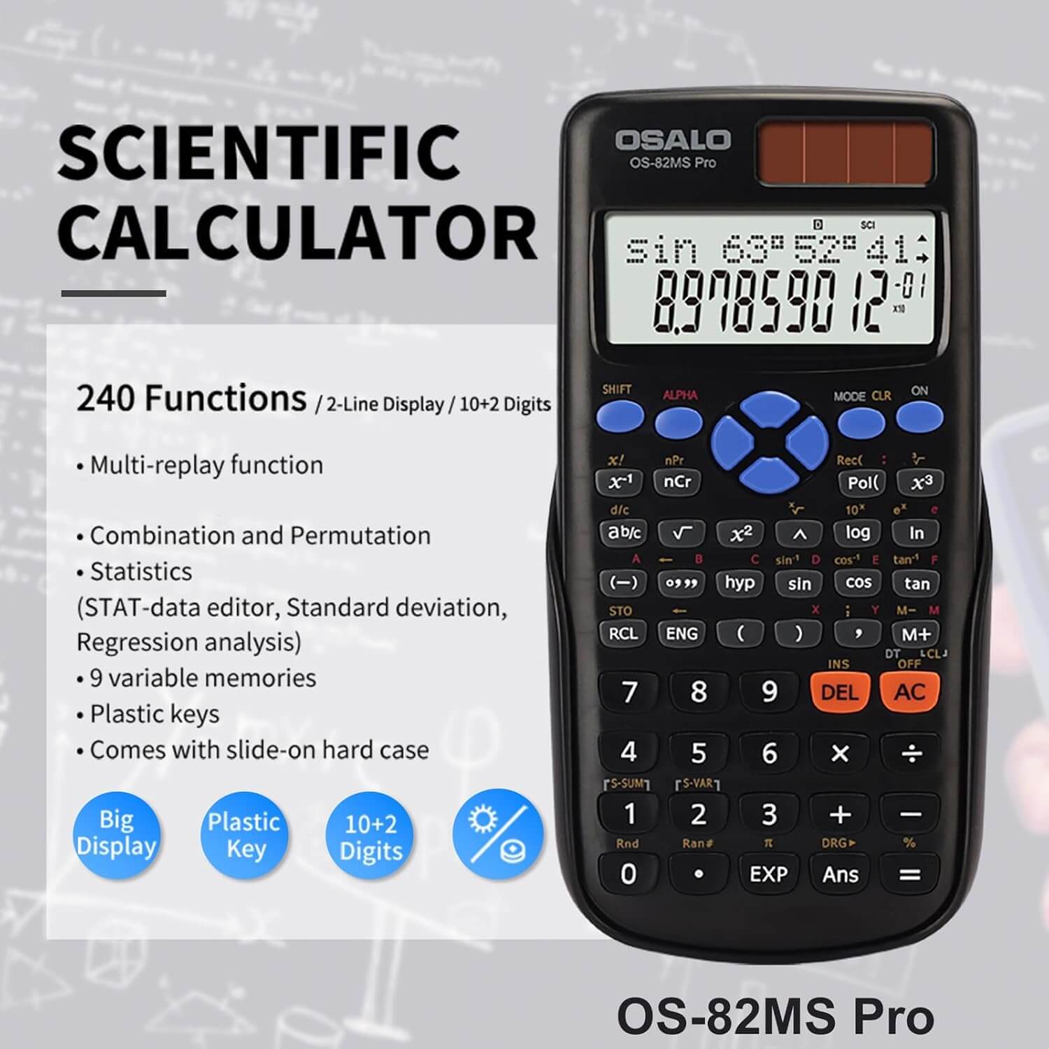 OSALO OS 82MS Pro znanstveni kalkulator je zasnovan za sekundarno in napredno izobraževanje, kjer so zahtevni izračuni ključni. S 240 funkcijami, dvovrstičnim LCD zaslonom in trajnostno zasnovo je idealen za uporabo v matematiki, znanosti in inženiringu.